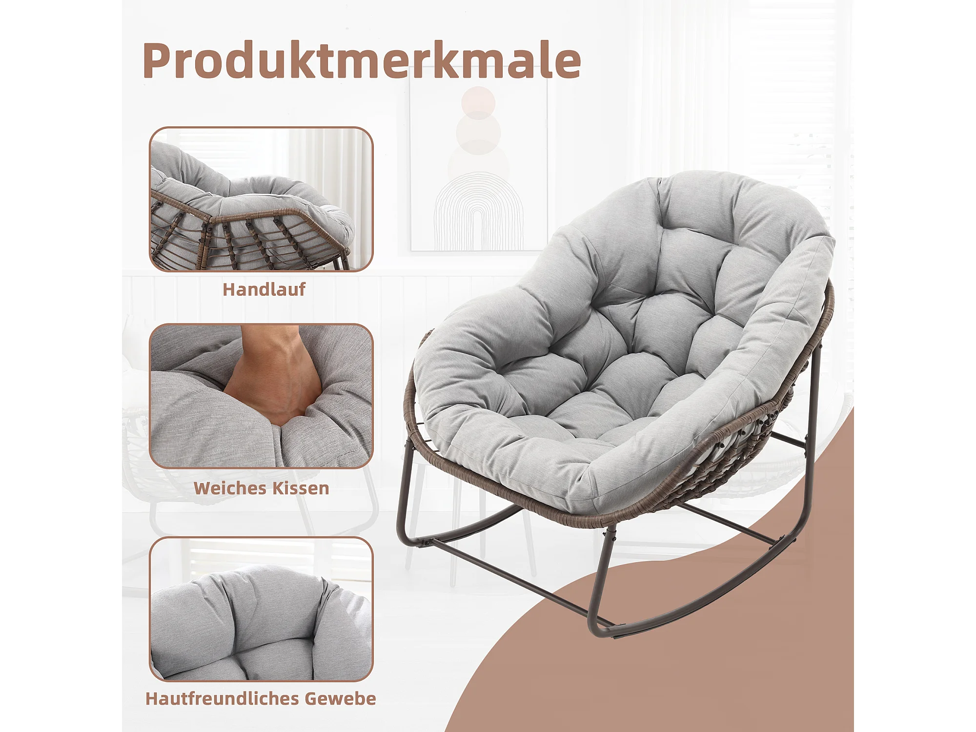 Fauteuil à Bascule en Rotin Naturel - Forme Œuf et Coussin Gris Clair - Confortable pour Salon, Véranda ou Chambre