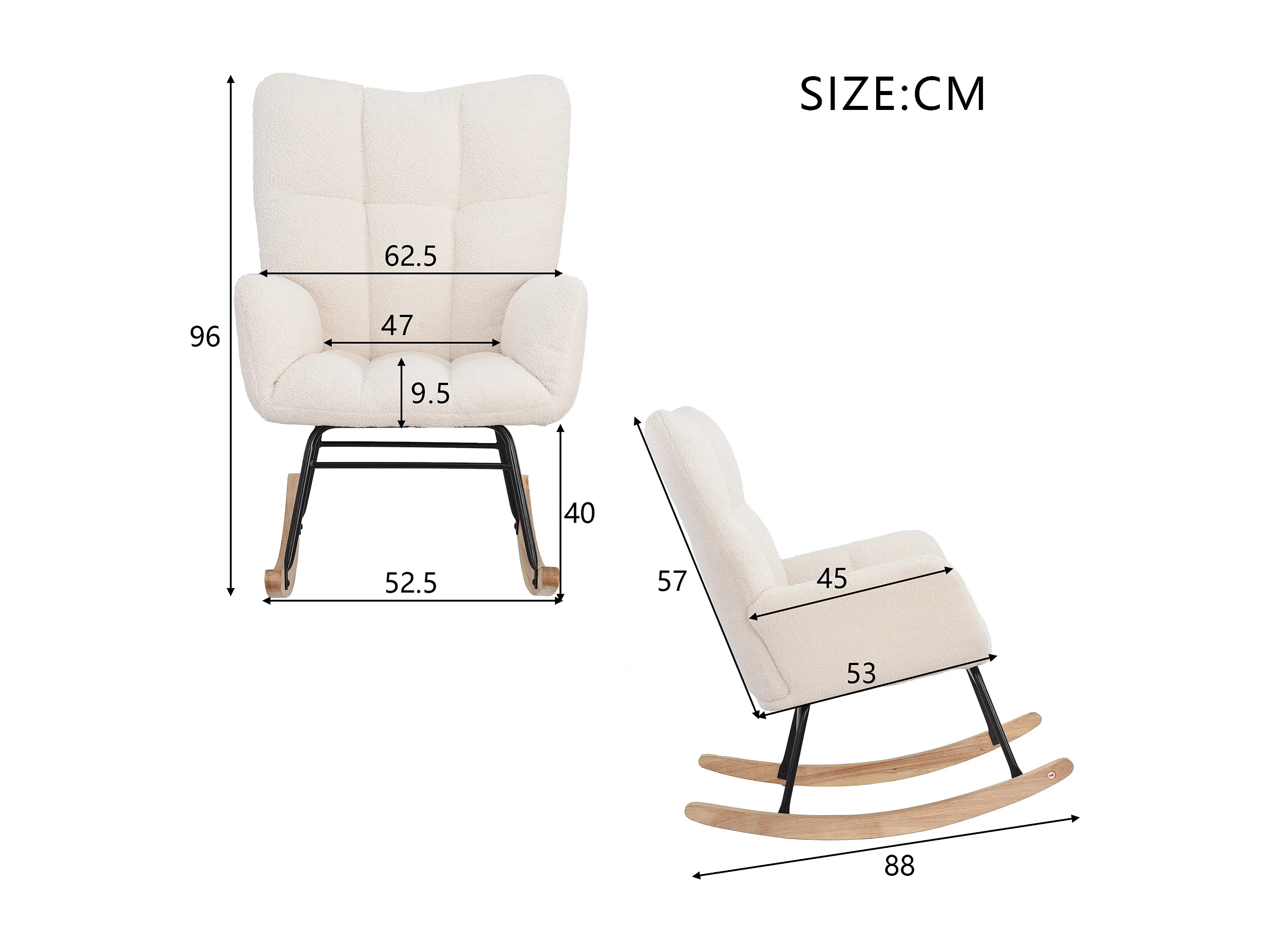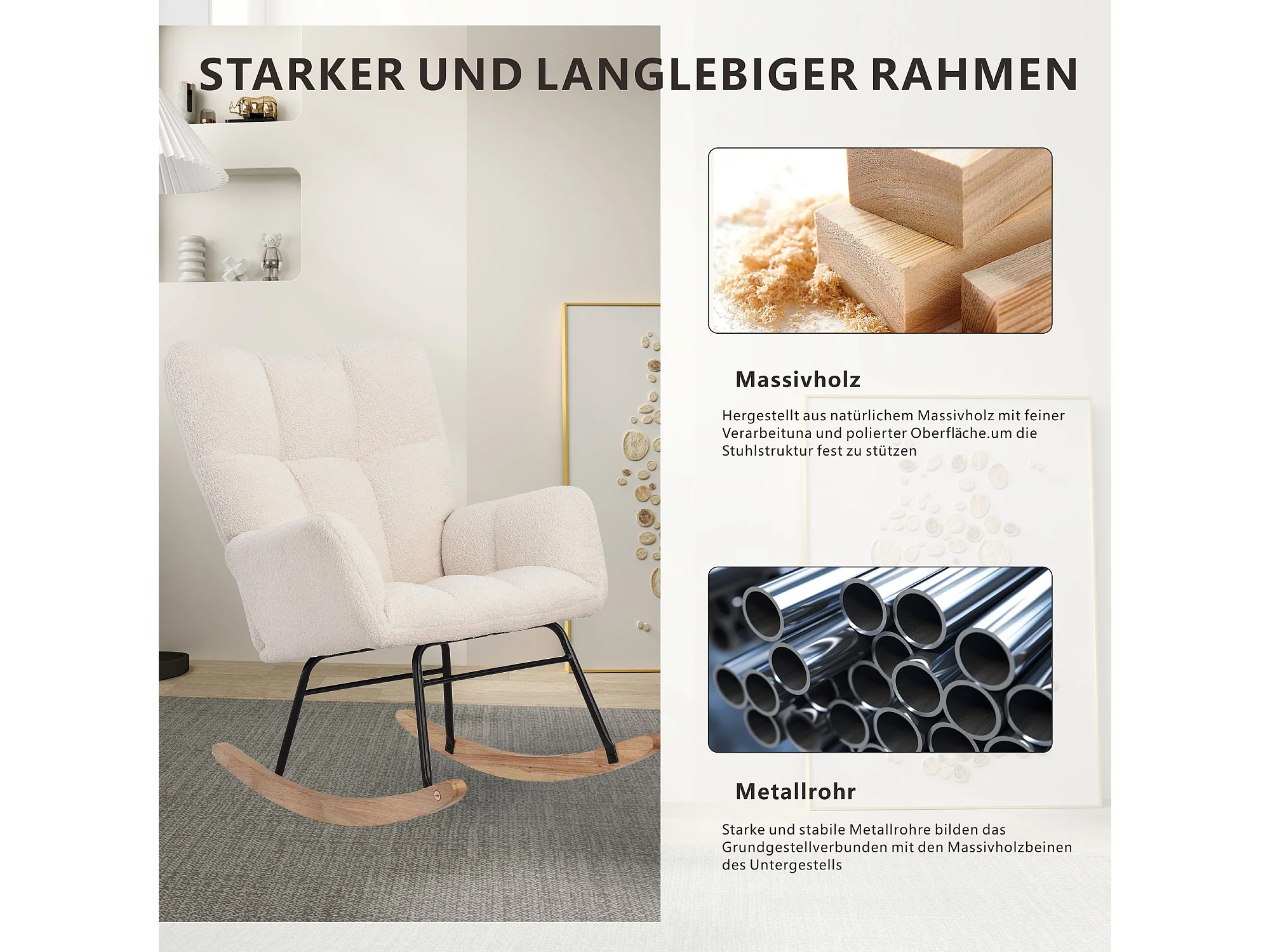 Fauteuil à bascule moderne en tissu effet laine teddy avec pieds en bois d'hévéa massif, beige