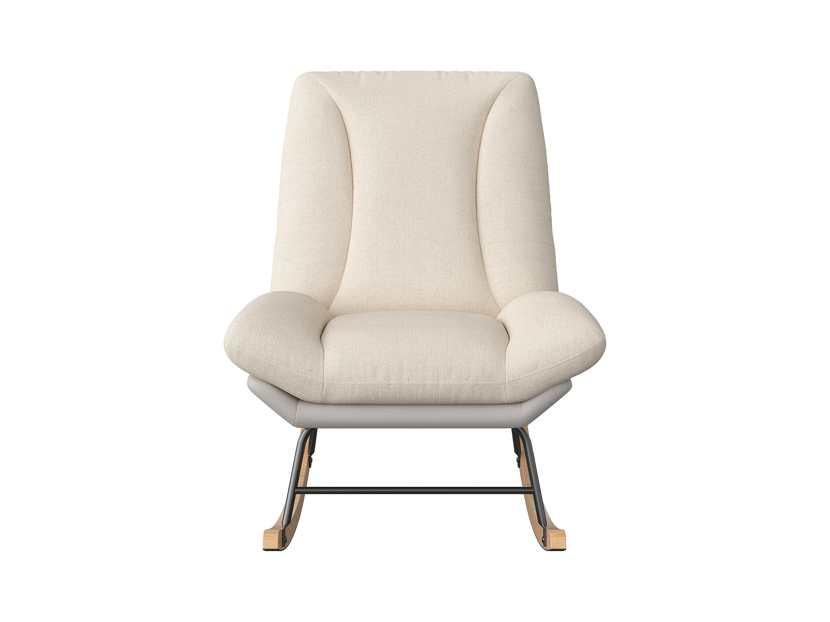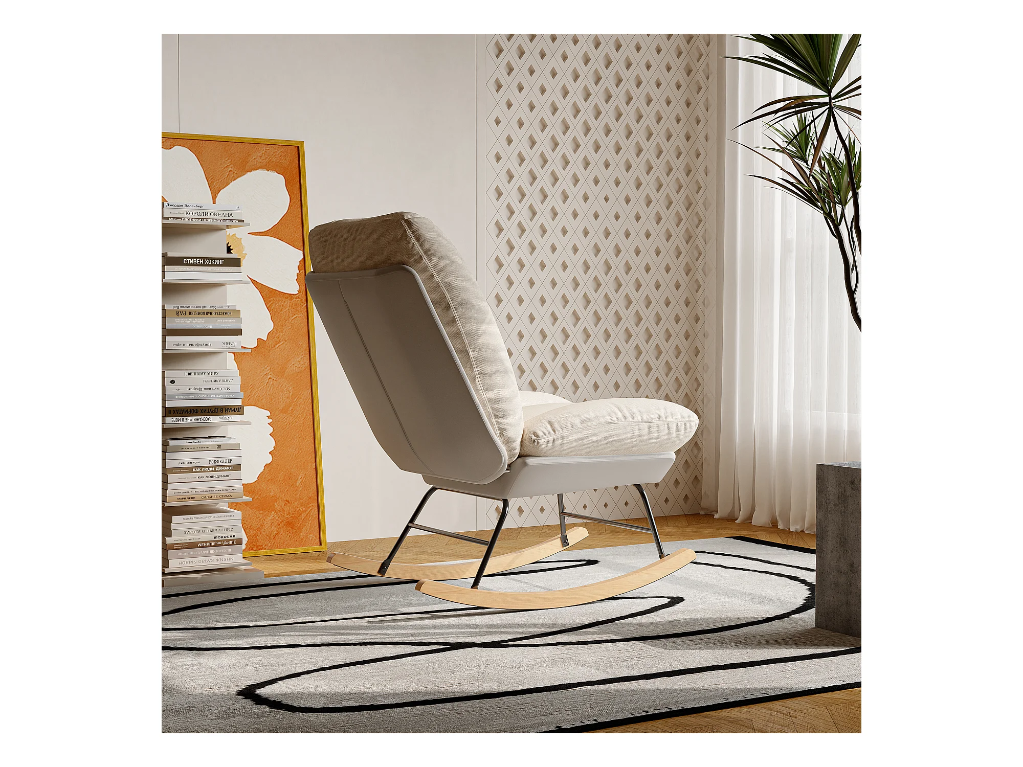 Fauteuil à bascule moderne en tissu effet laine teddy avec pieds en bois d'hévéa massif, beige
