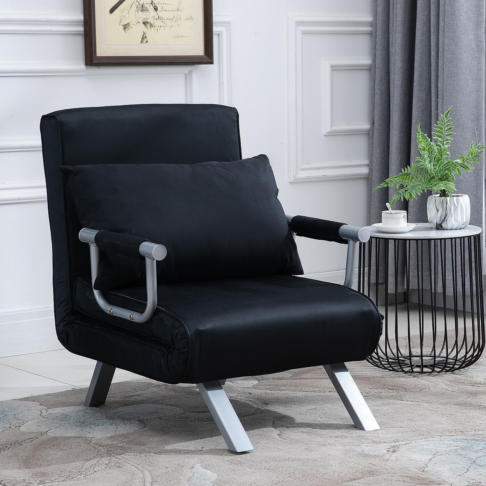 Fauteuil Convertible à Lit 1 Place, Fauteuil de Salon 4-en-1, Dossier Réglable en 6 Positions avec Oreiller, Oreiller, Siège Rembourré, Accoudoirs, Cadre Métal, Canapé-Lit Pliant, Noir