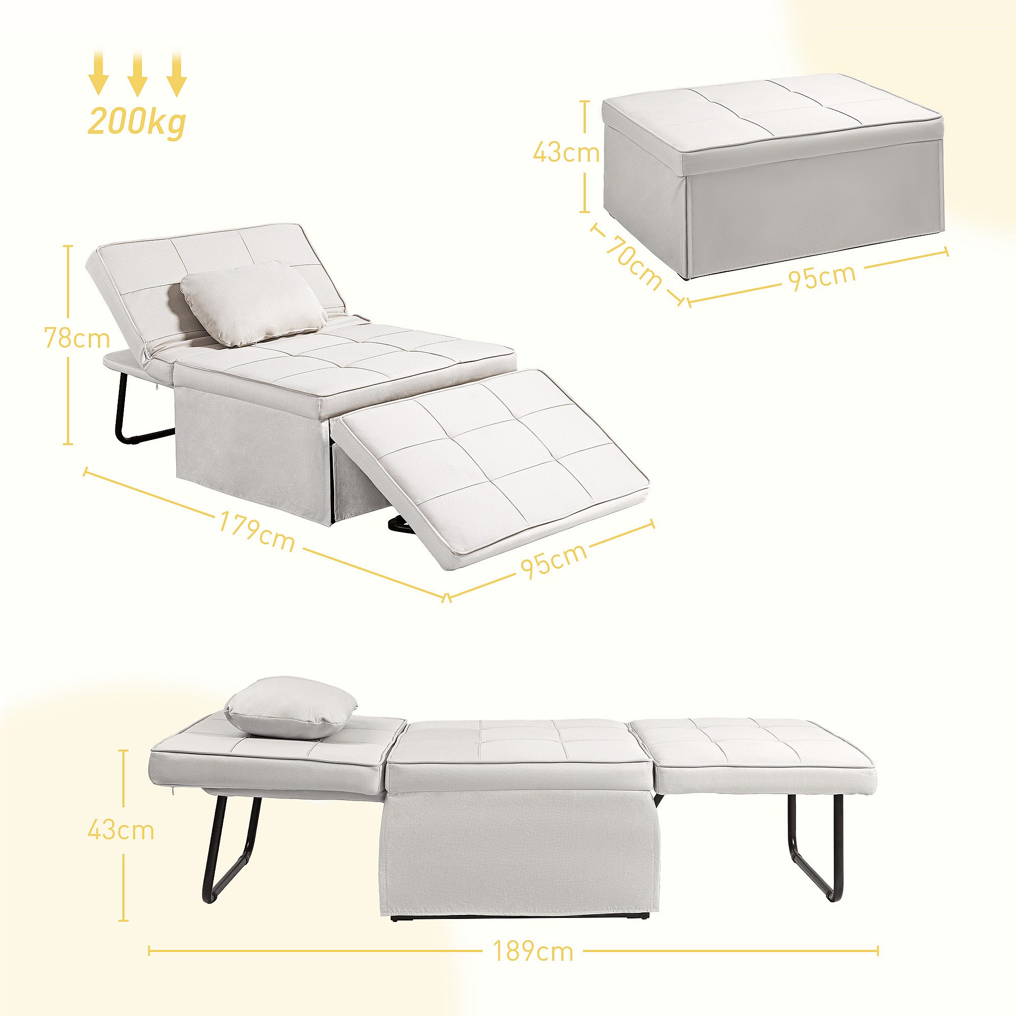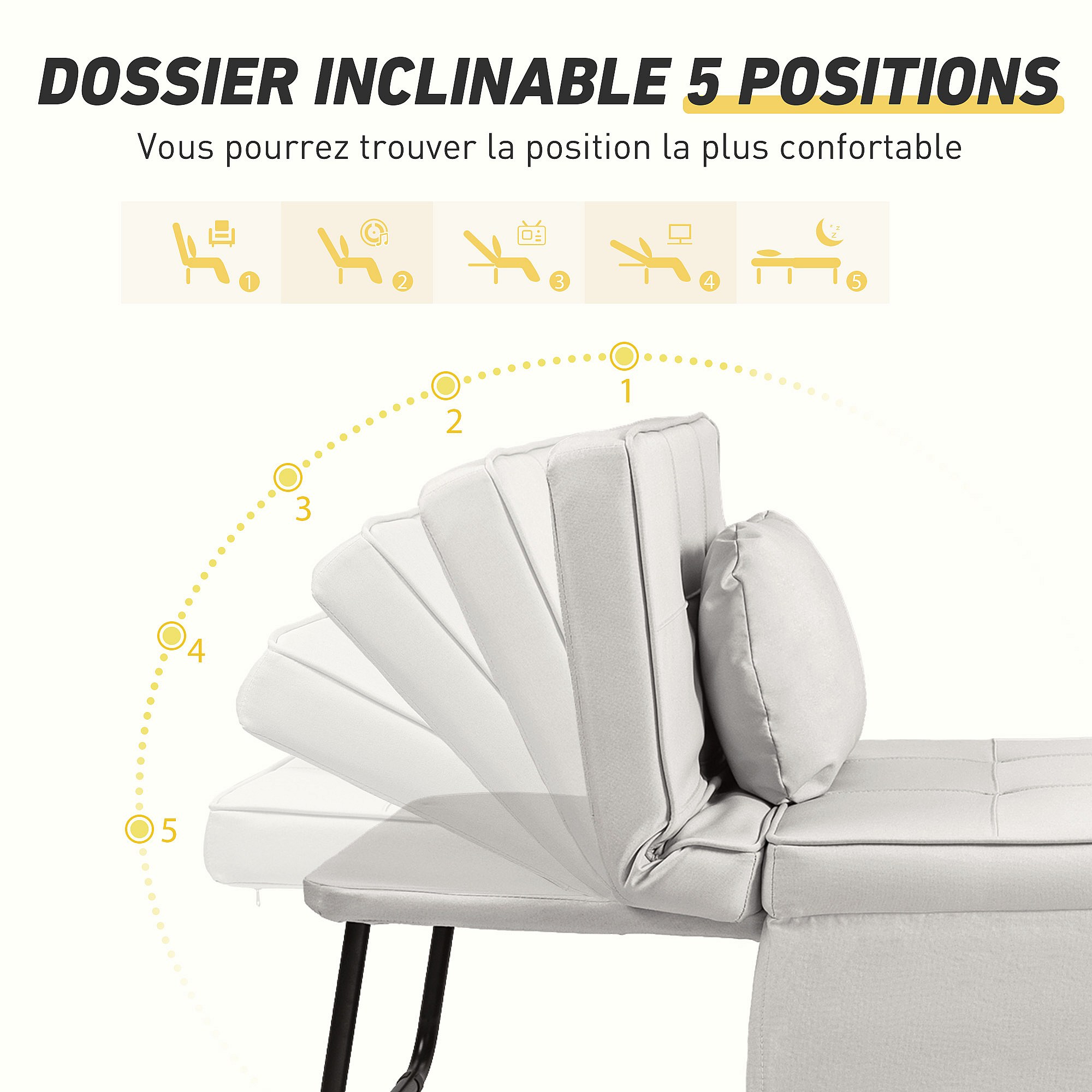 Fauteuil chauffeuse chaise longue pouf 3 en 1 dossier inclinable 5 niveaux repose-pied rabattable châssis métal noir lin crème
