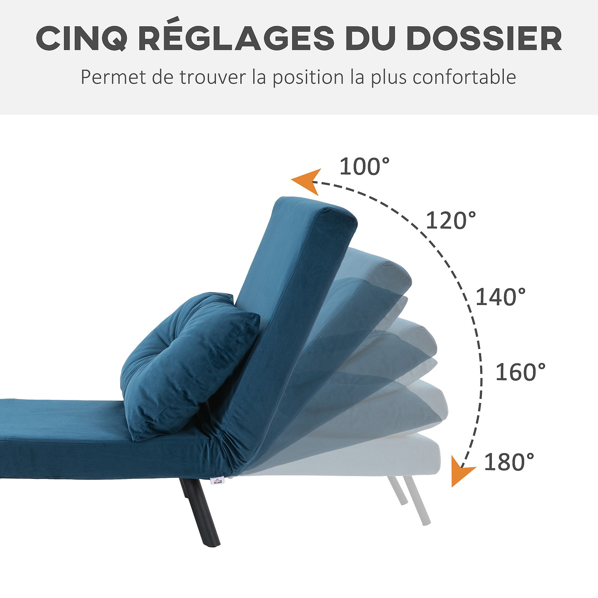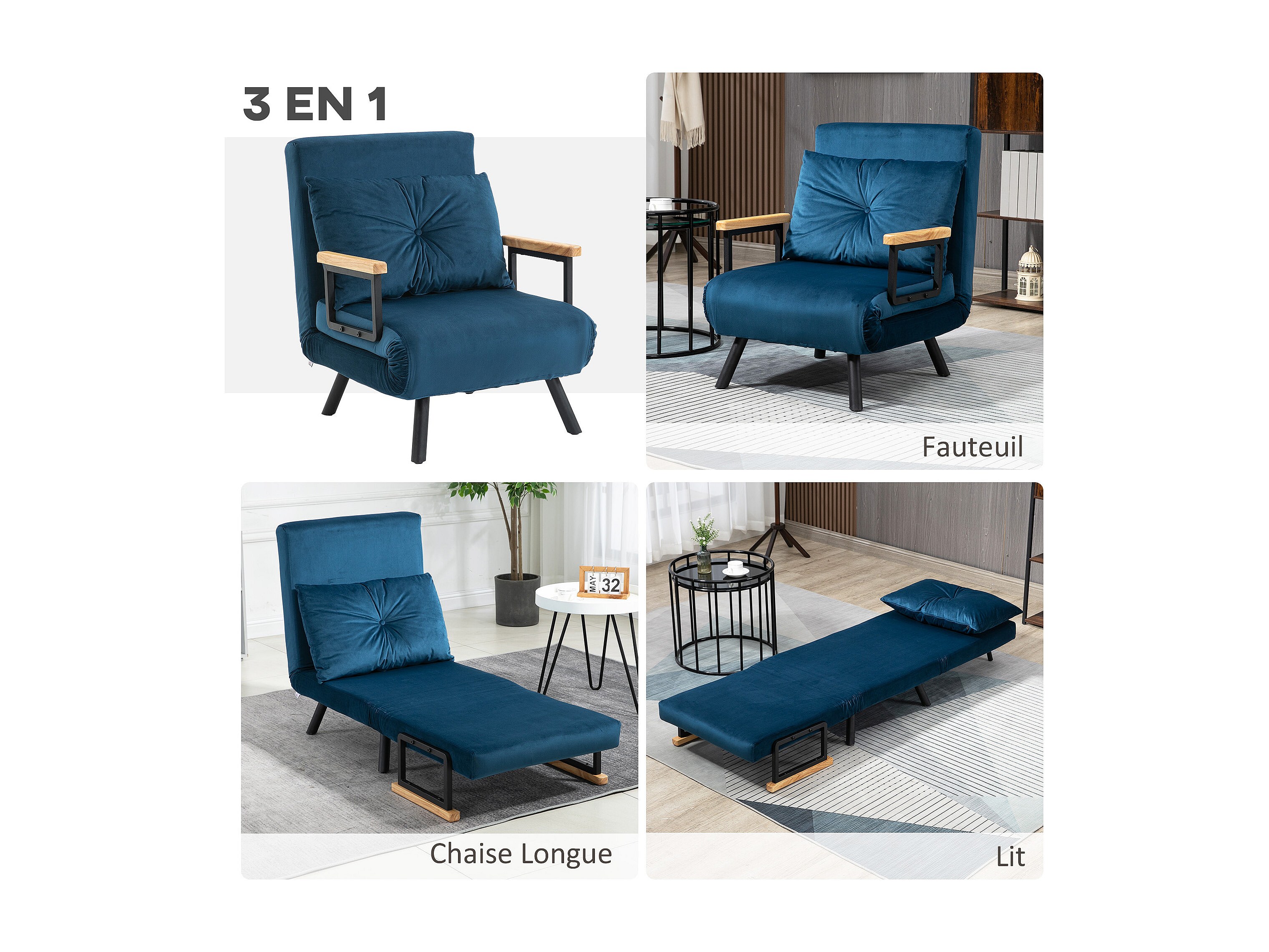 Fauteuil convertible 3 en 1 chauffeuse lit dossier réglable coussin accoudoirs bois velours bleu