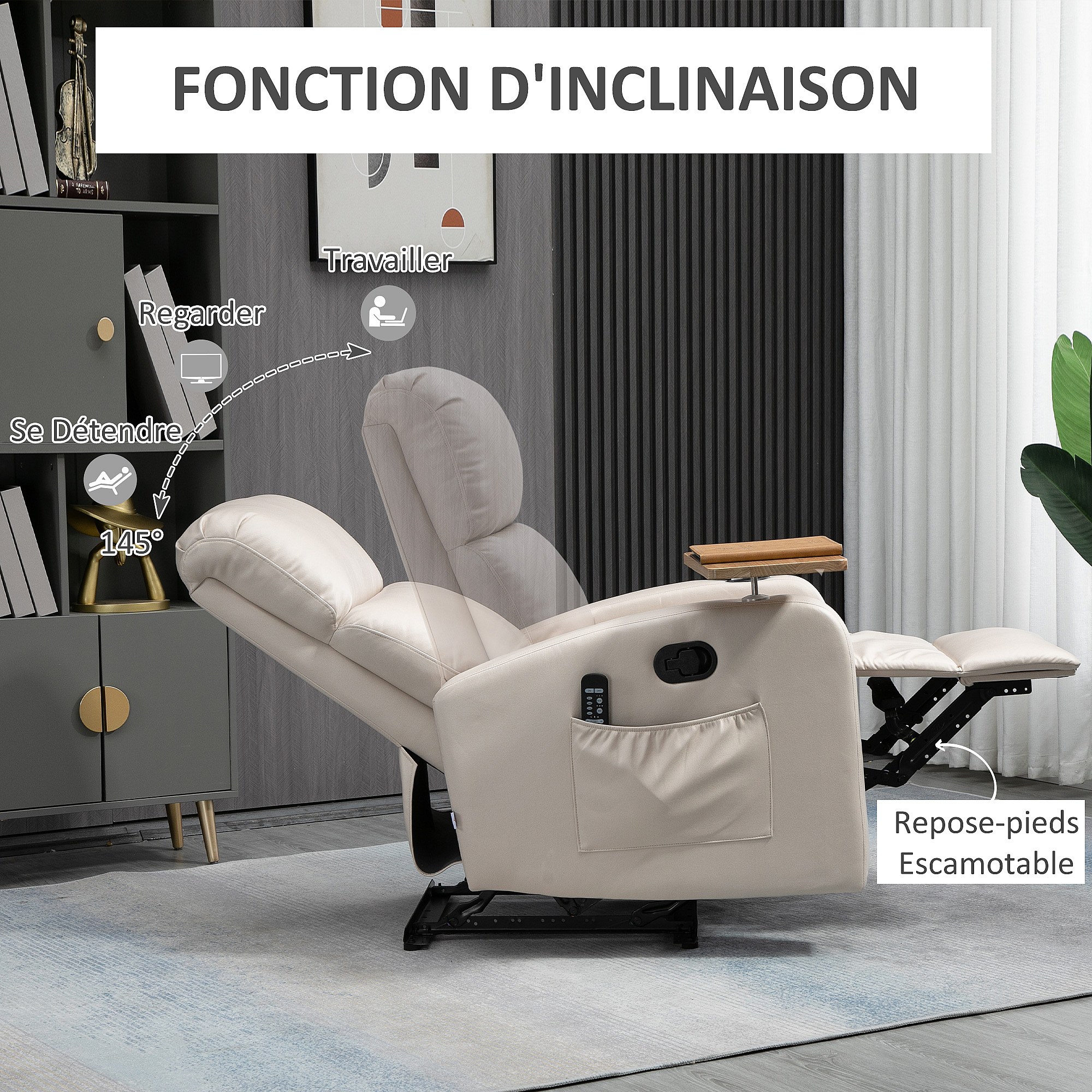 Fauteuil de massage inclinable avec repose-pied télécommande revêtement synthétique tissu beige