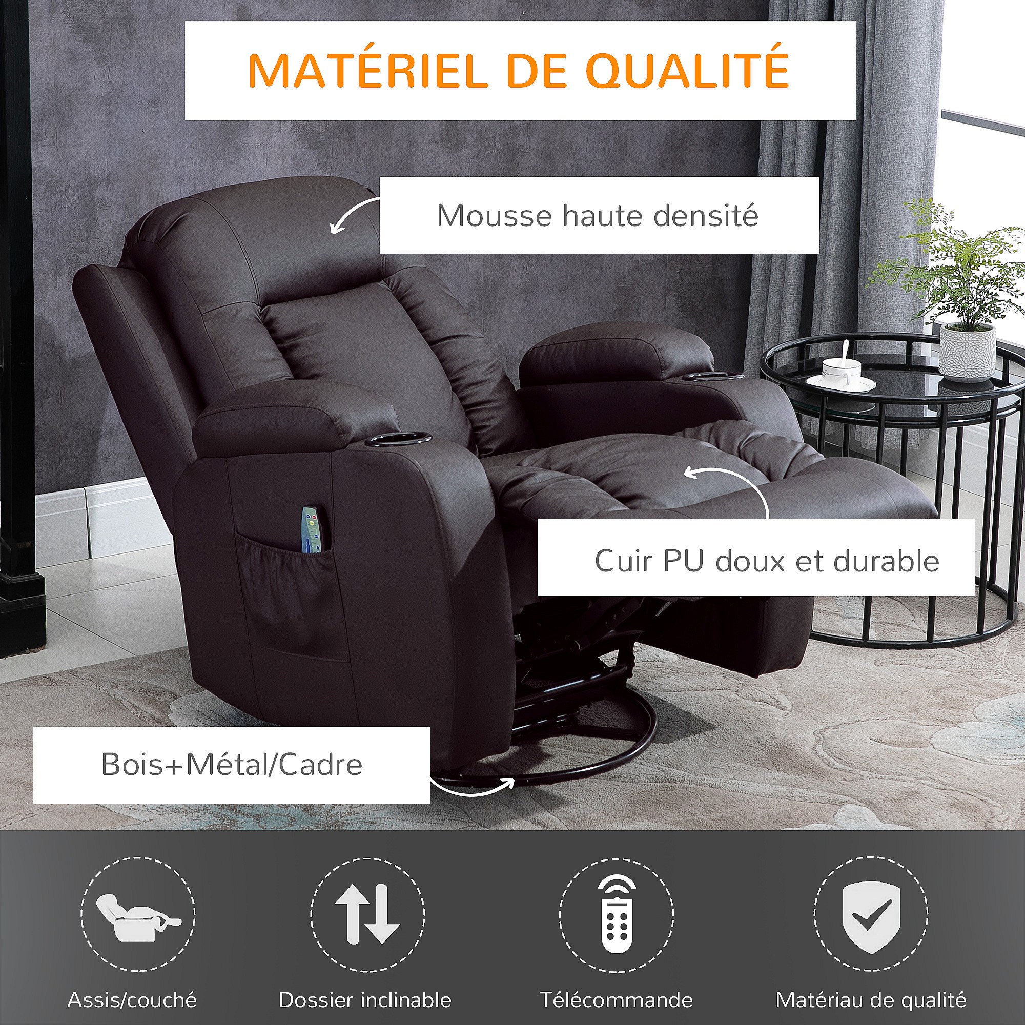 Fauteuil de massage et relaxation électrique chauffant inclinable manuellement repose-pied télécommande chocolat