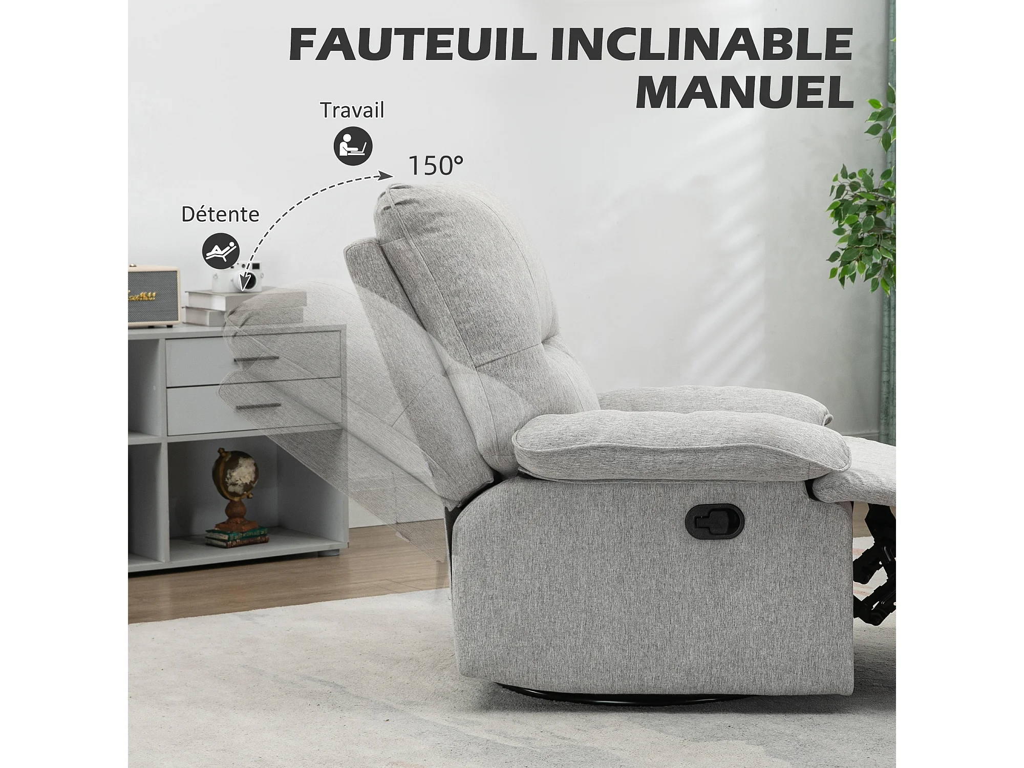 Fauteuil de relaxation grand confort pivotant 360° dossier inclinable repose-pied ajustable tissu gris clair