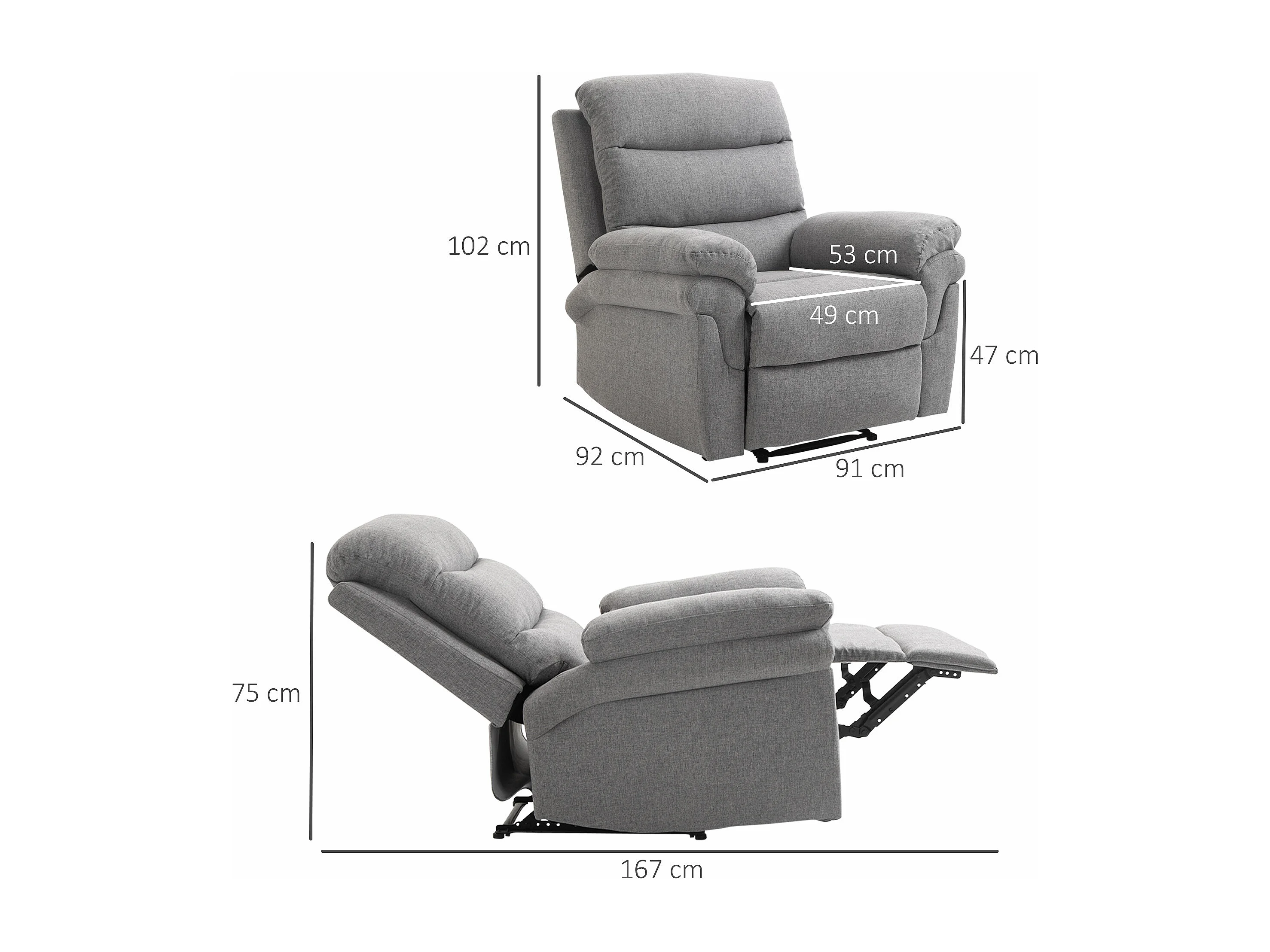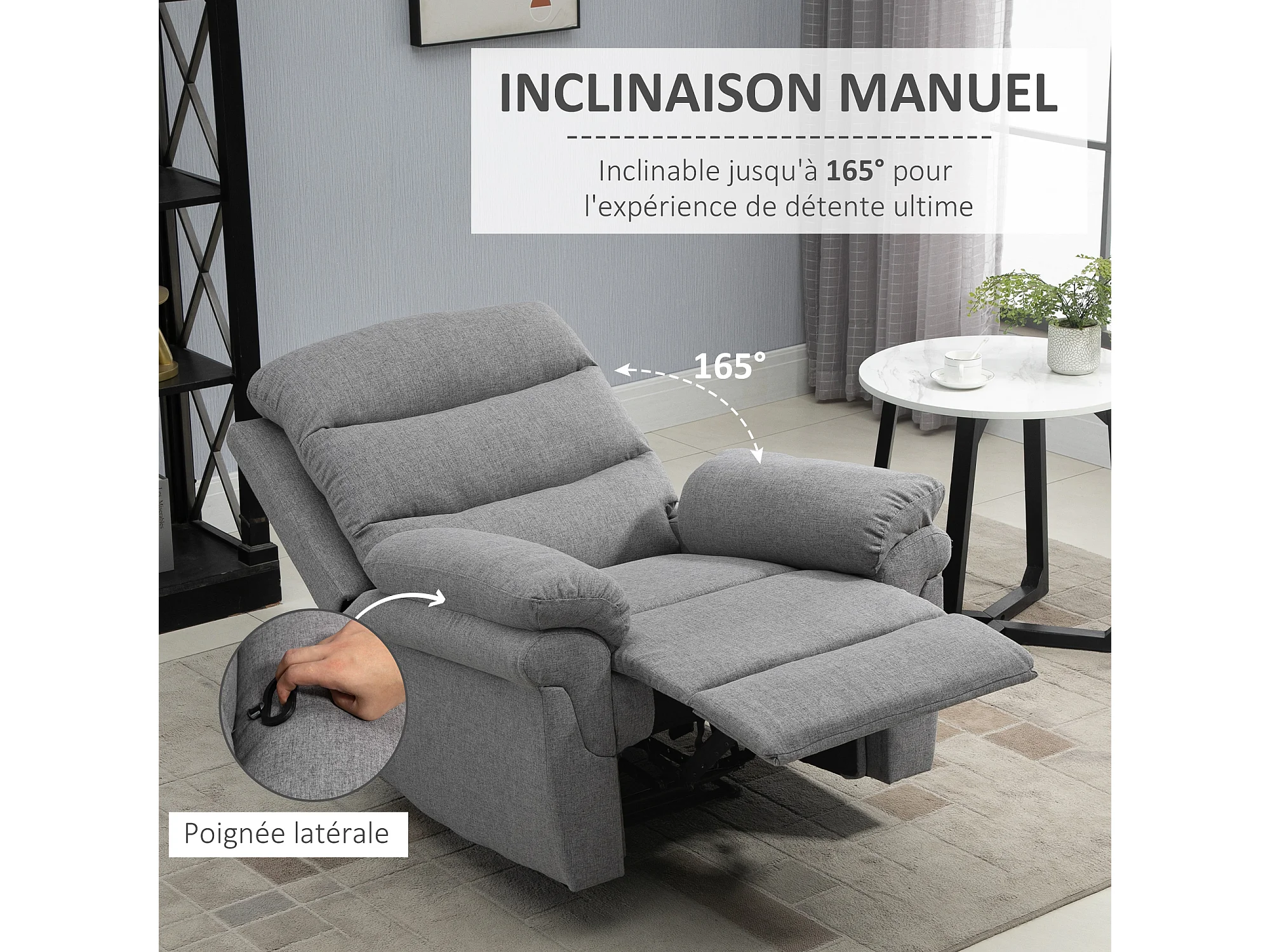 Fauteuil de relaxation inclinable manuel avec repose-pied ajustable tissu polyester aspect lin gris clair chiné