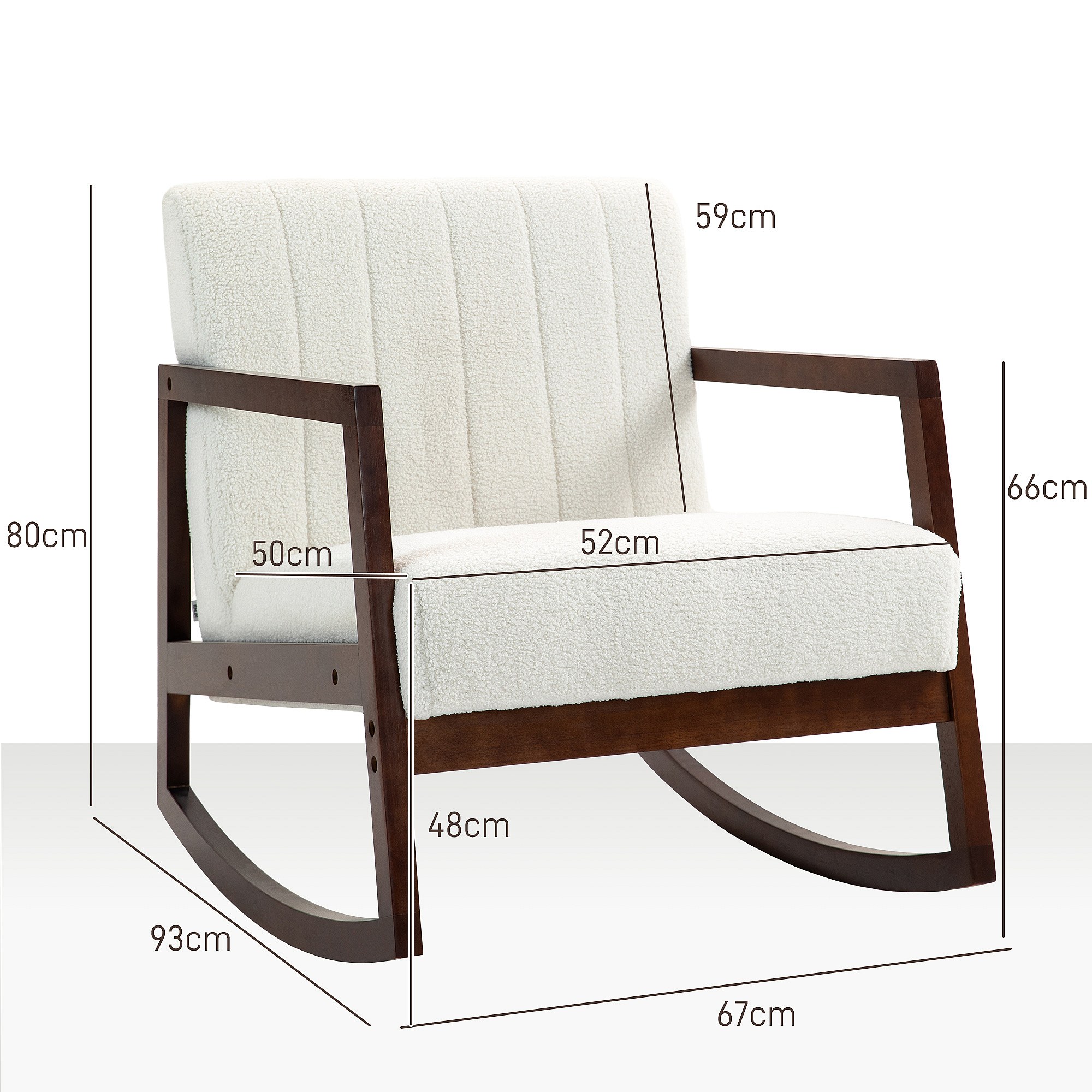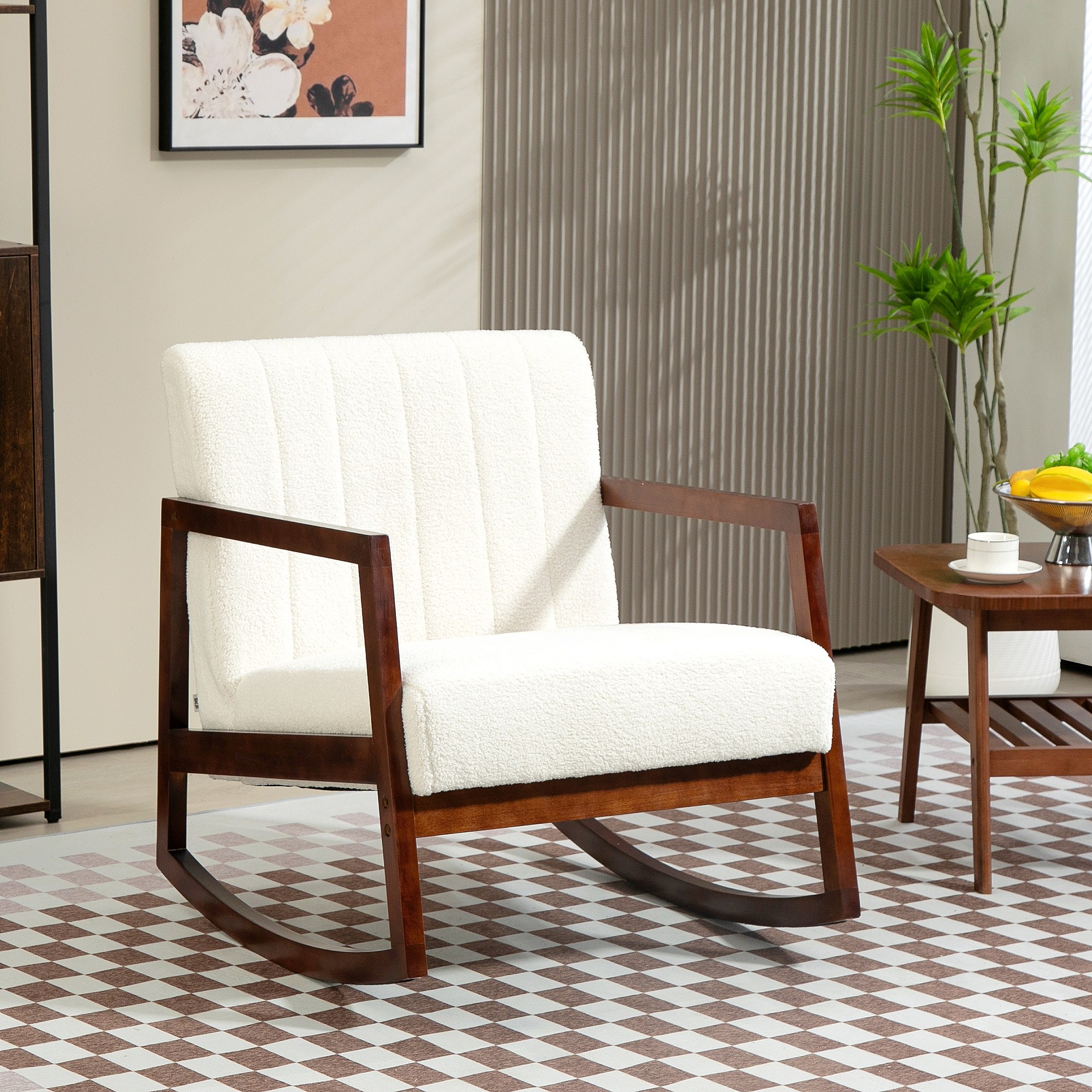 Fauteuil lounge à bascule - assise profonde, dossier incliné - accoudoirs, structure bois hévéa - revêtement effet laine bouclée crème