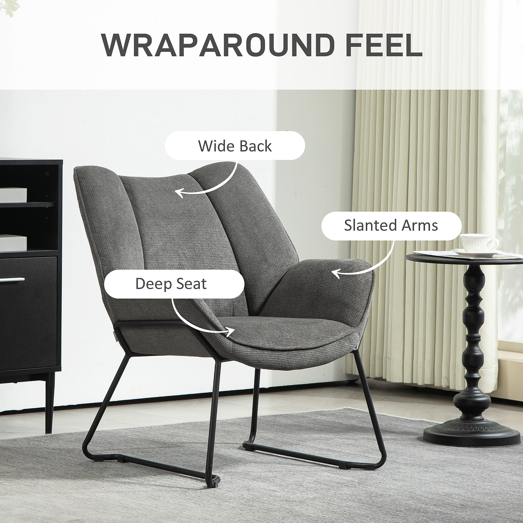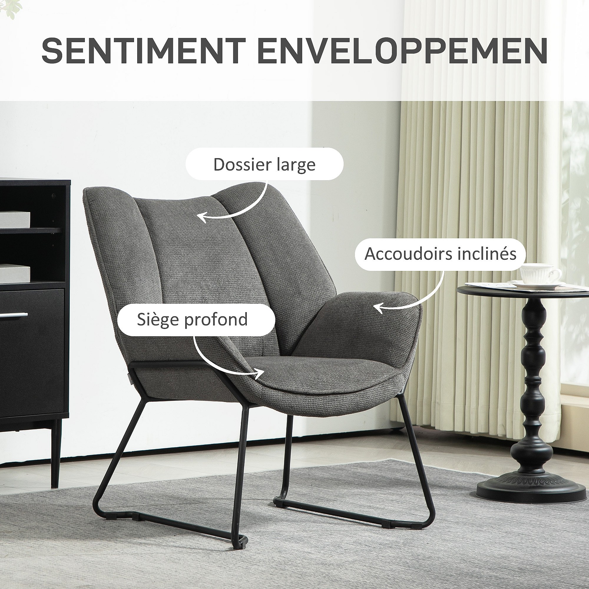 Fauteuil lounge design contemporain - dossier incliné, assise accoudoirs enveloppants - acier noir tissu gris
