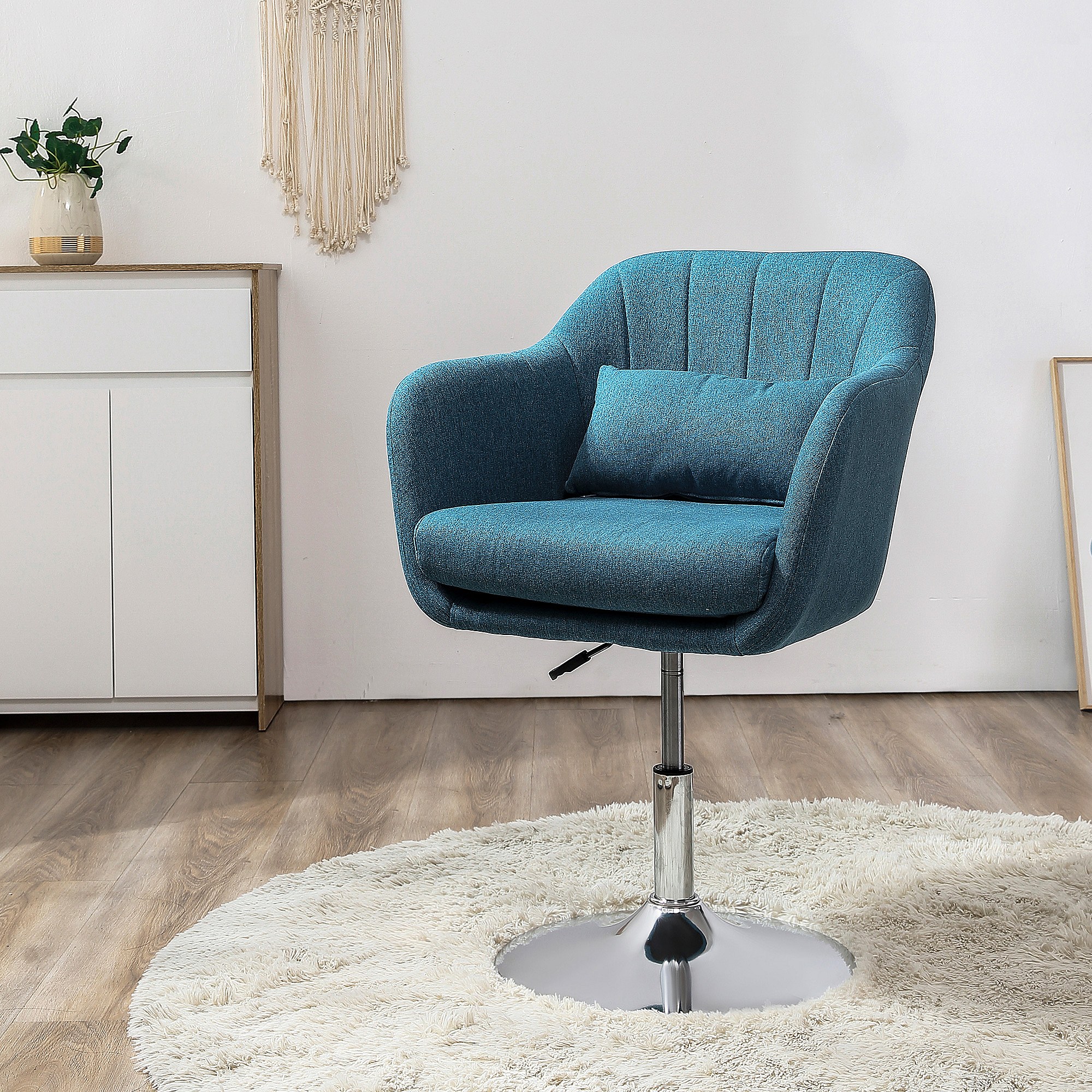 Fauteuil lounge design grand confort coussins lombaires hauteur réglable pivotant 360° piètement métal chromé lin bleu canard