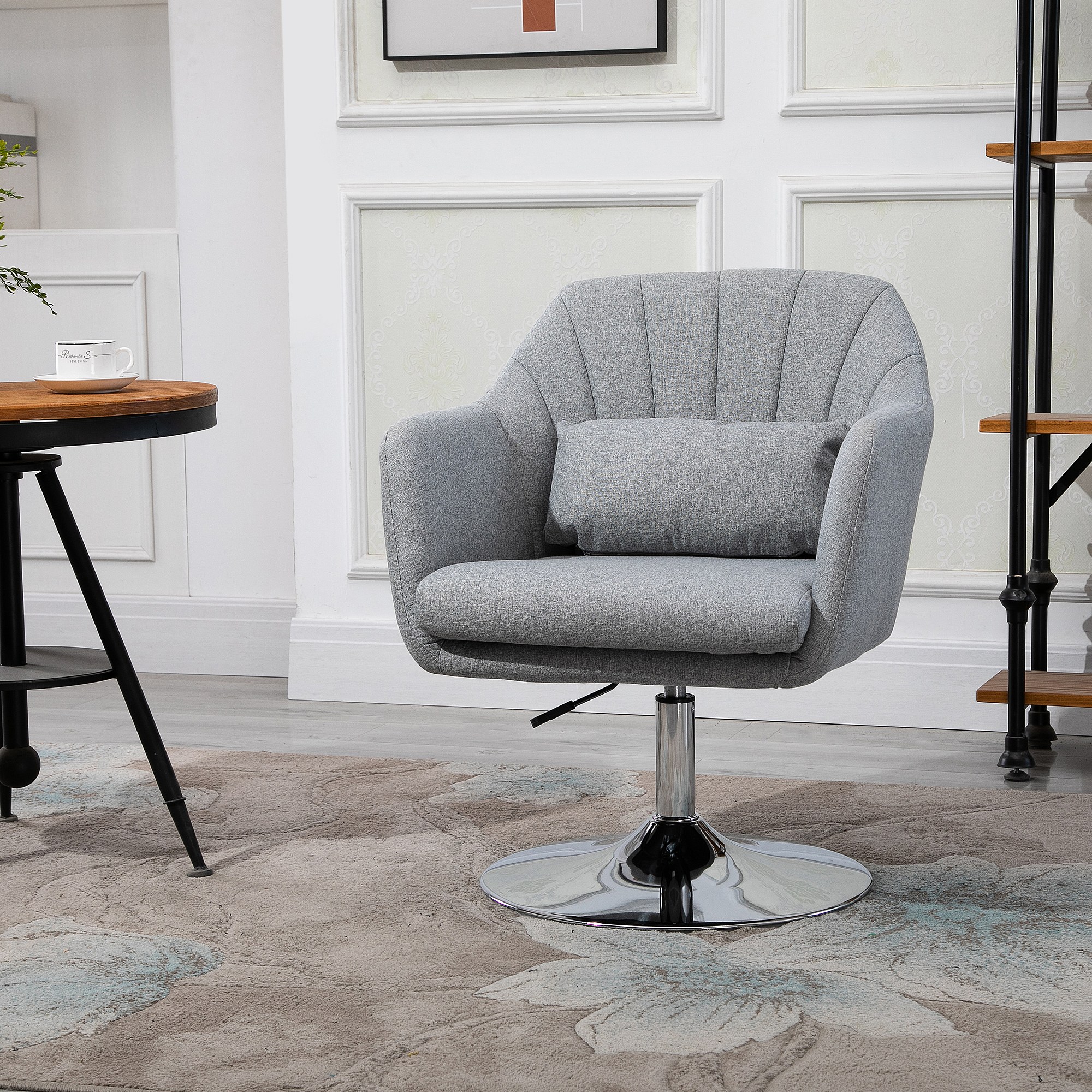 Fauteuil lounge design grand confort coussins lombaires hauteur réglable pivotant 360° piètement métal chromé lin gris
