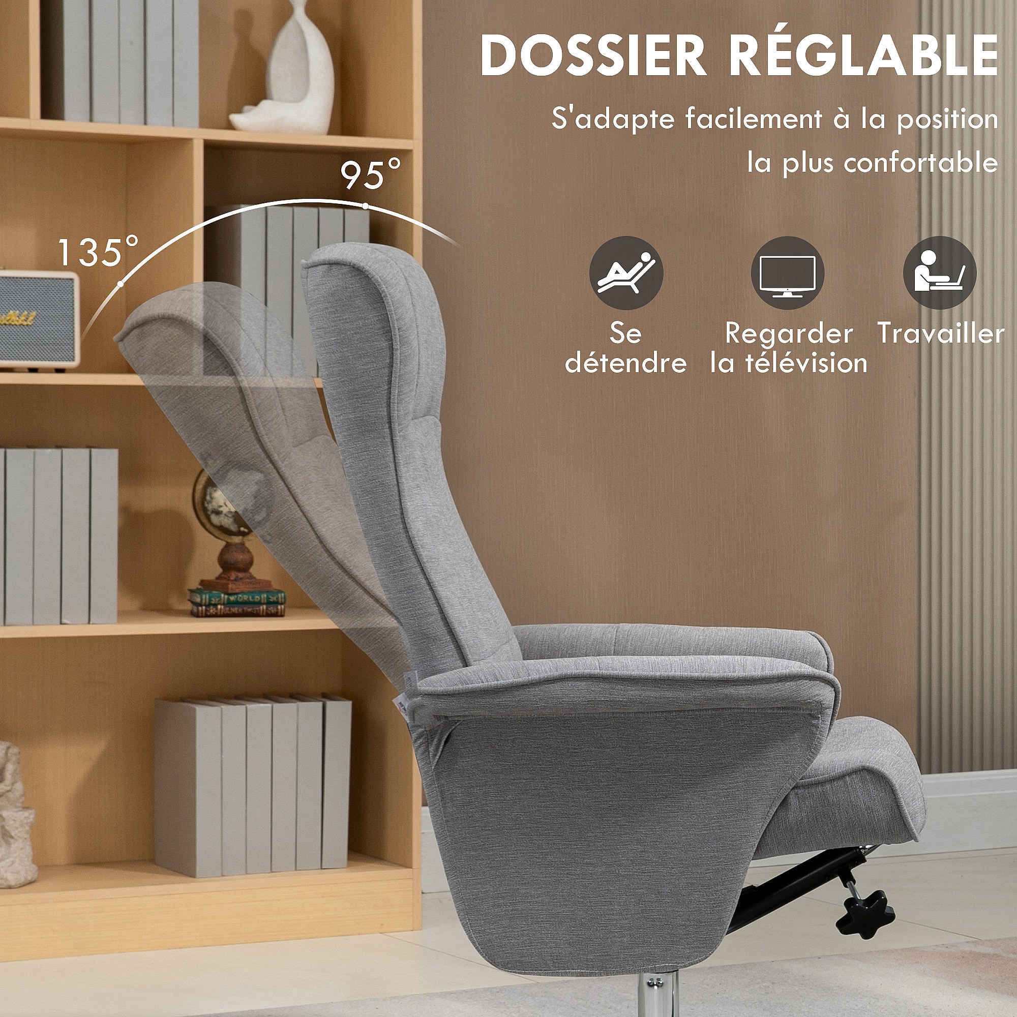 Fauteuil relax style contemporain - pivotant, dossier inclinable, repose-pied - piètement acier chromé tissu gris