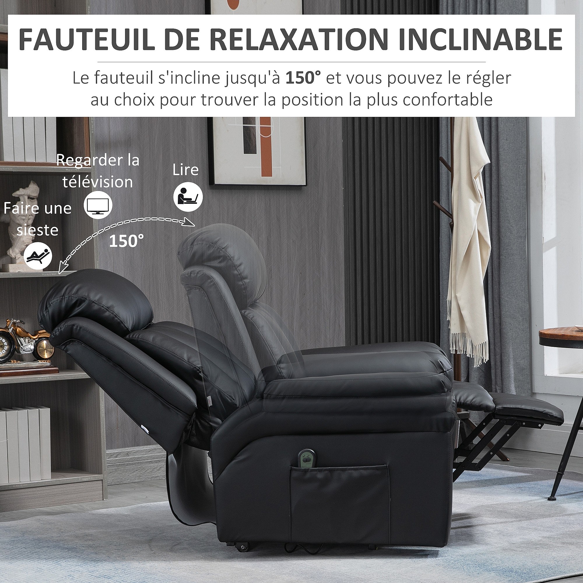 Fauteuil releveur inclinable avec repose-pied ajustable - fauteuil de relaxation électrique - revêtement synthétique noir