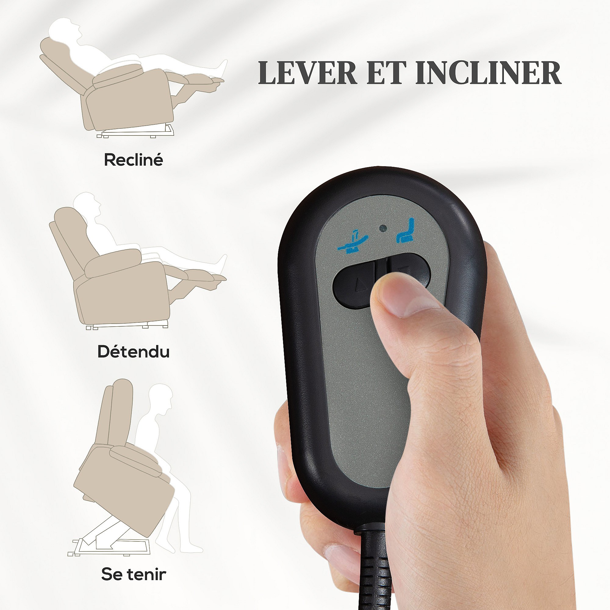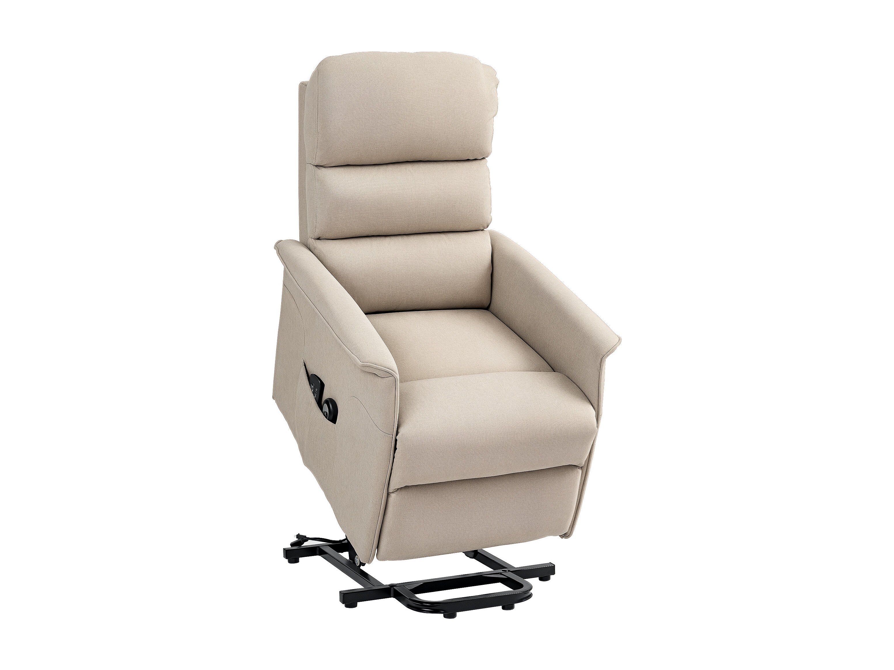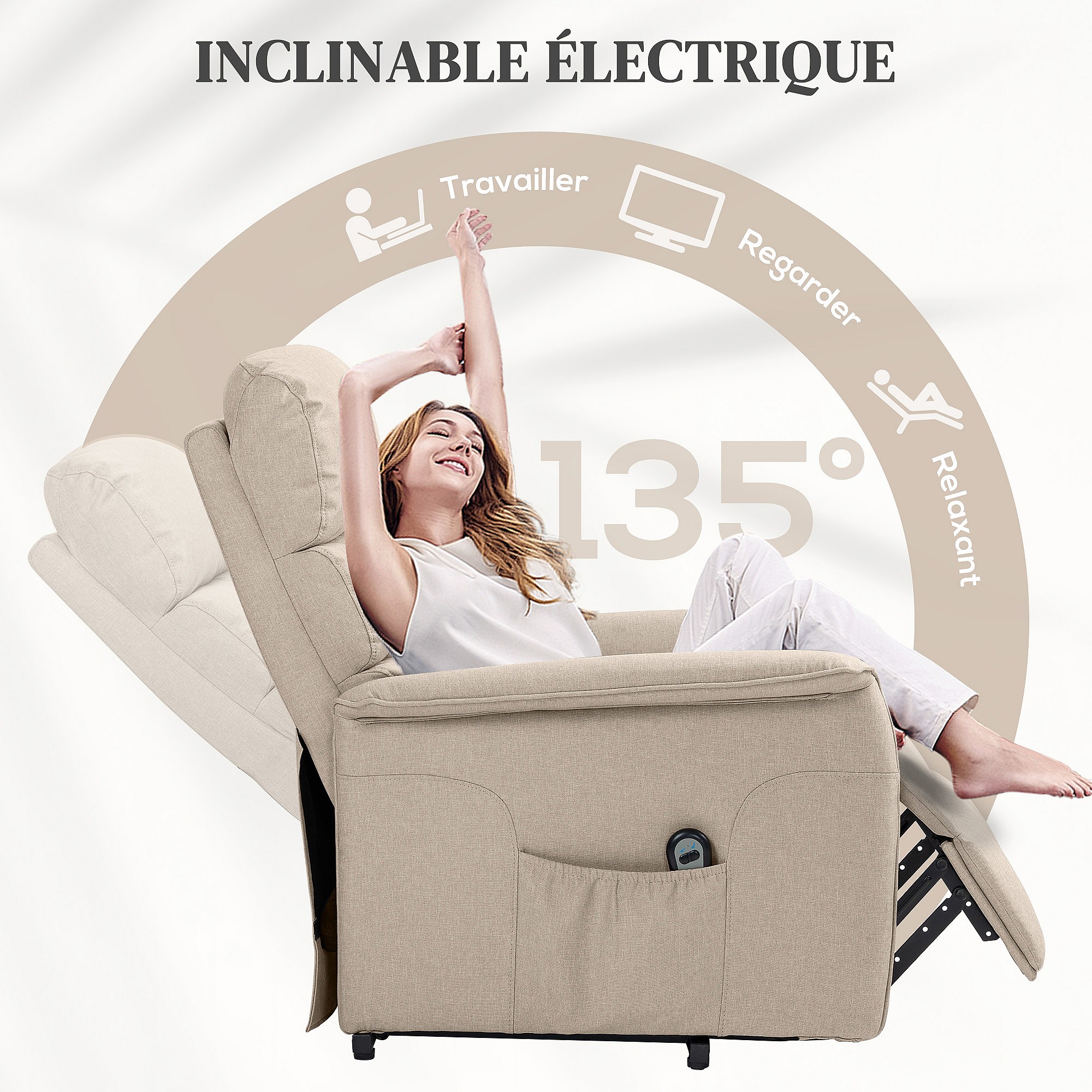 Fauteuil releveur inclinable massant chauffant - 2 télécommandes, roulettes, pochette - tissu beige chiné