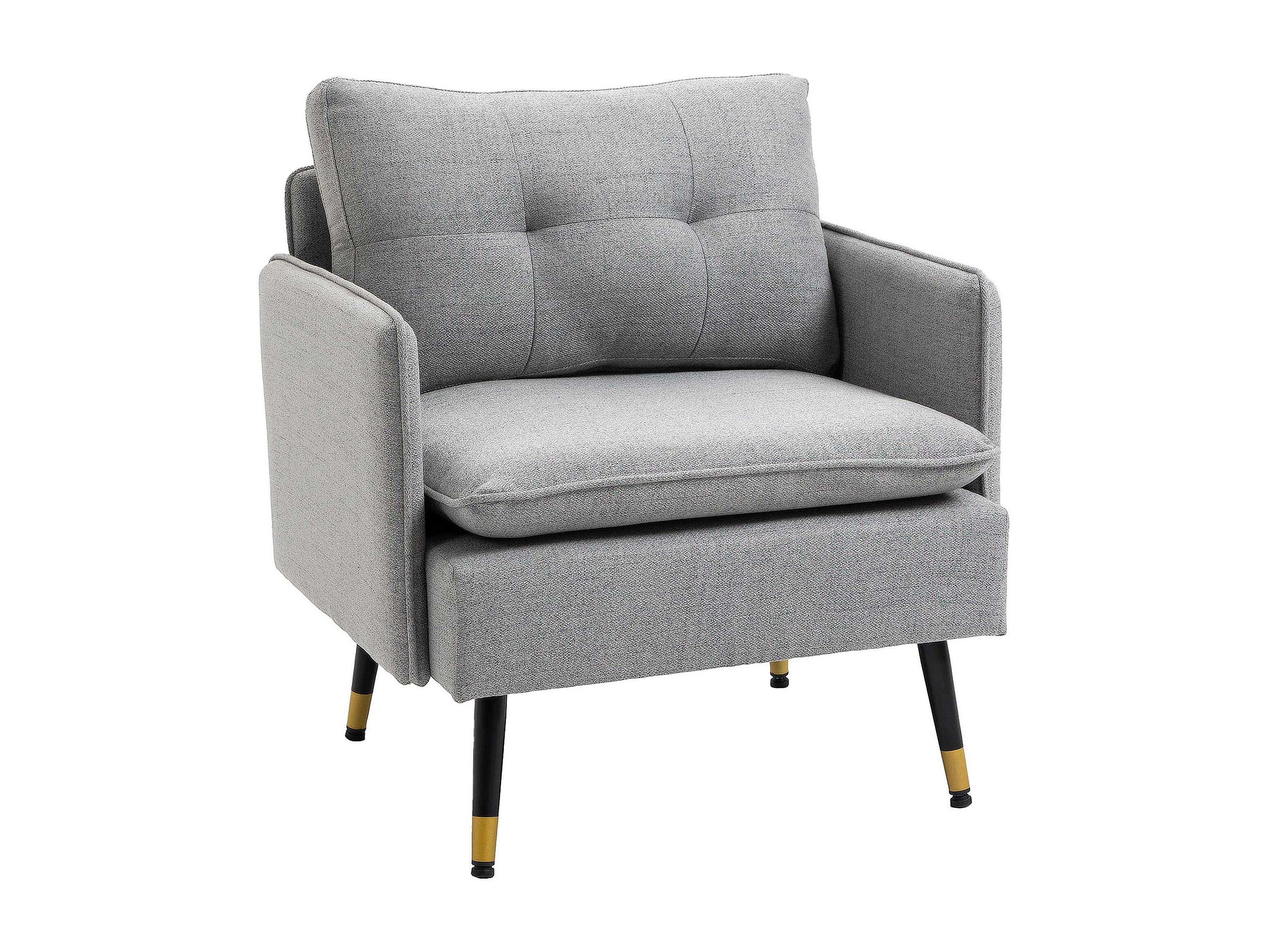 Fauteuil style art-déco dossier effet capitonné piètement incliné effilé métal noir extrémités dorées tissu gris