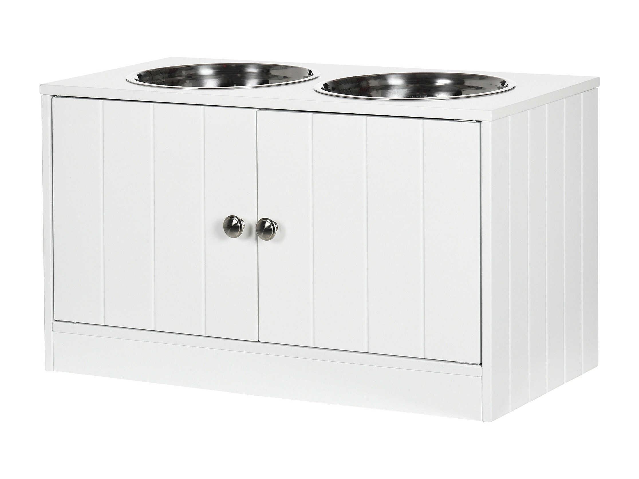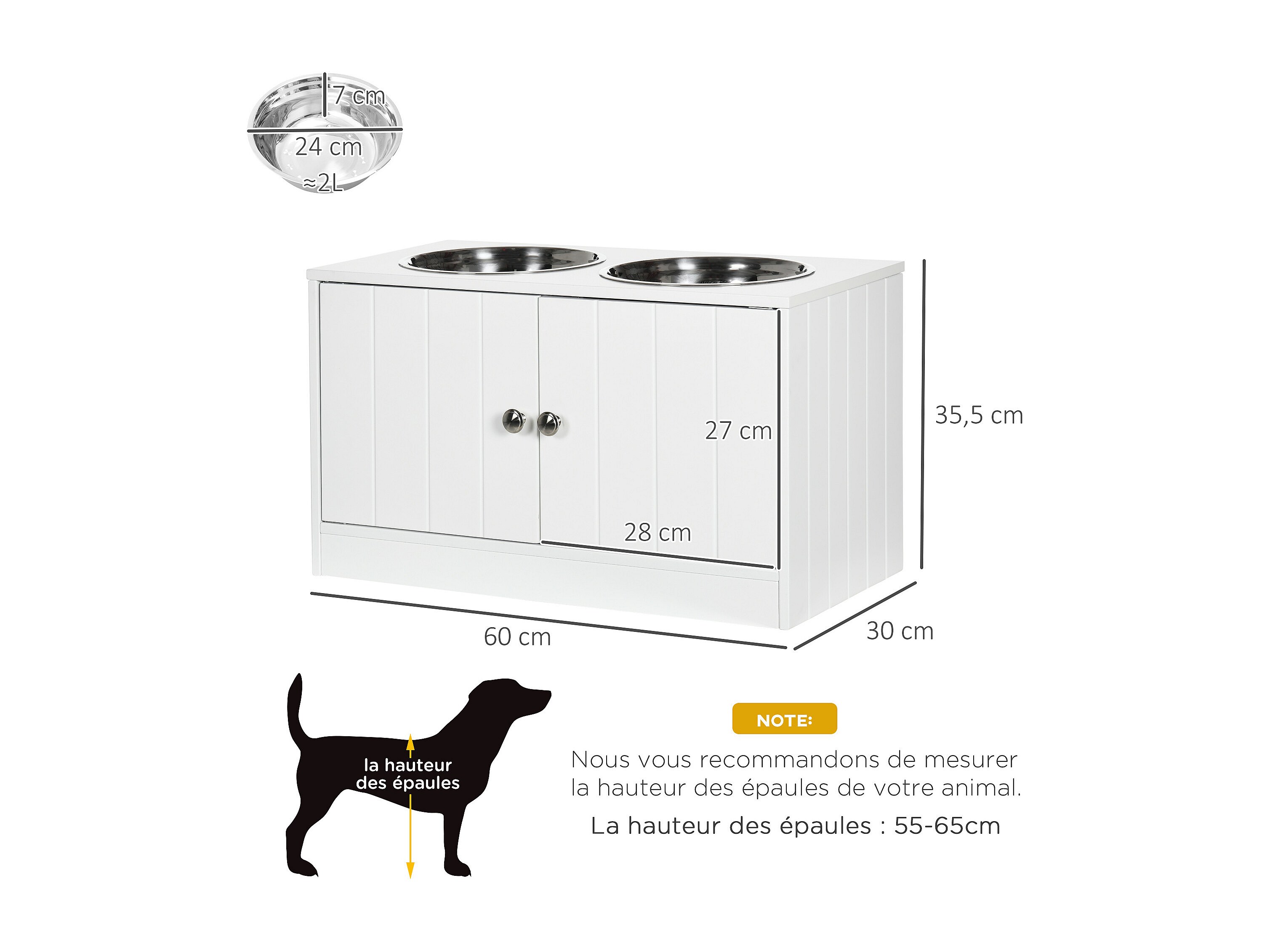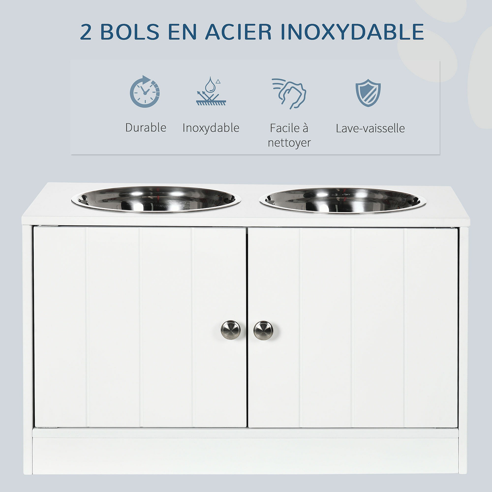 Gamelle double chien chat - porte-gamelles surélevé armoire 2 en 1 - 2 portes, 2 gamelles - acier inox. MDF blanc