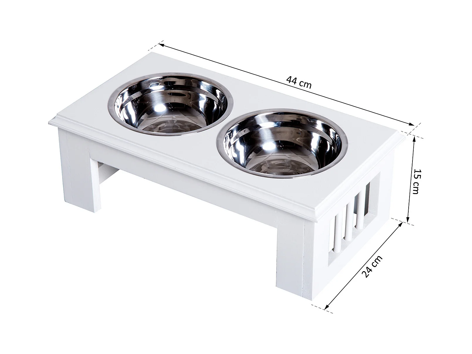 Gamelle double chien chat Porte-gamelles surélevé dim. 44L x 24l x 15H cm 2 gamelles acier inox. incluses MDF blanc