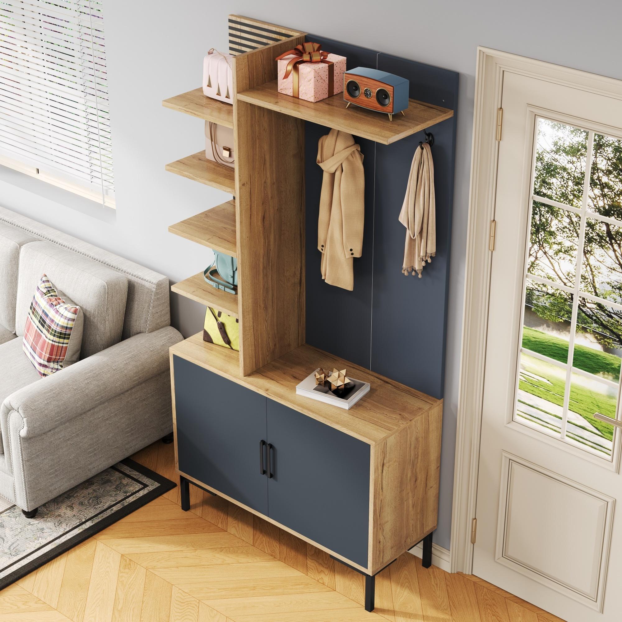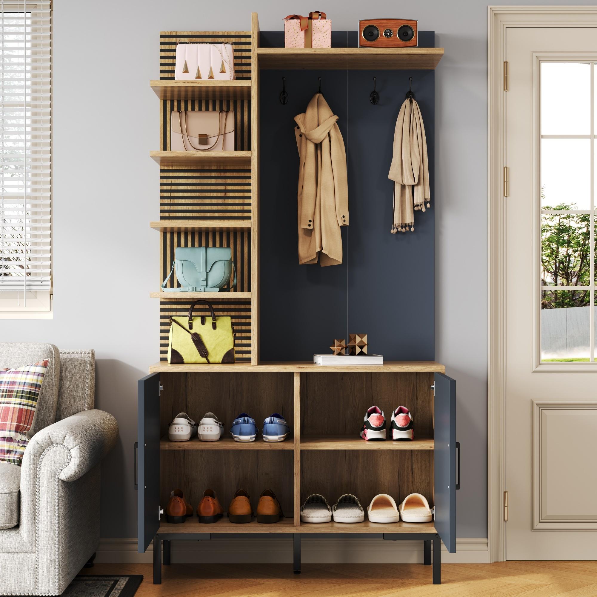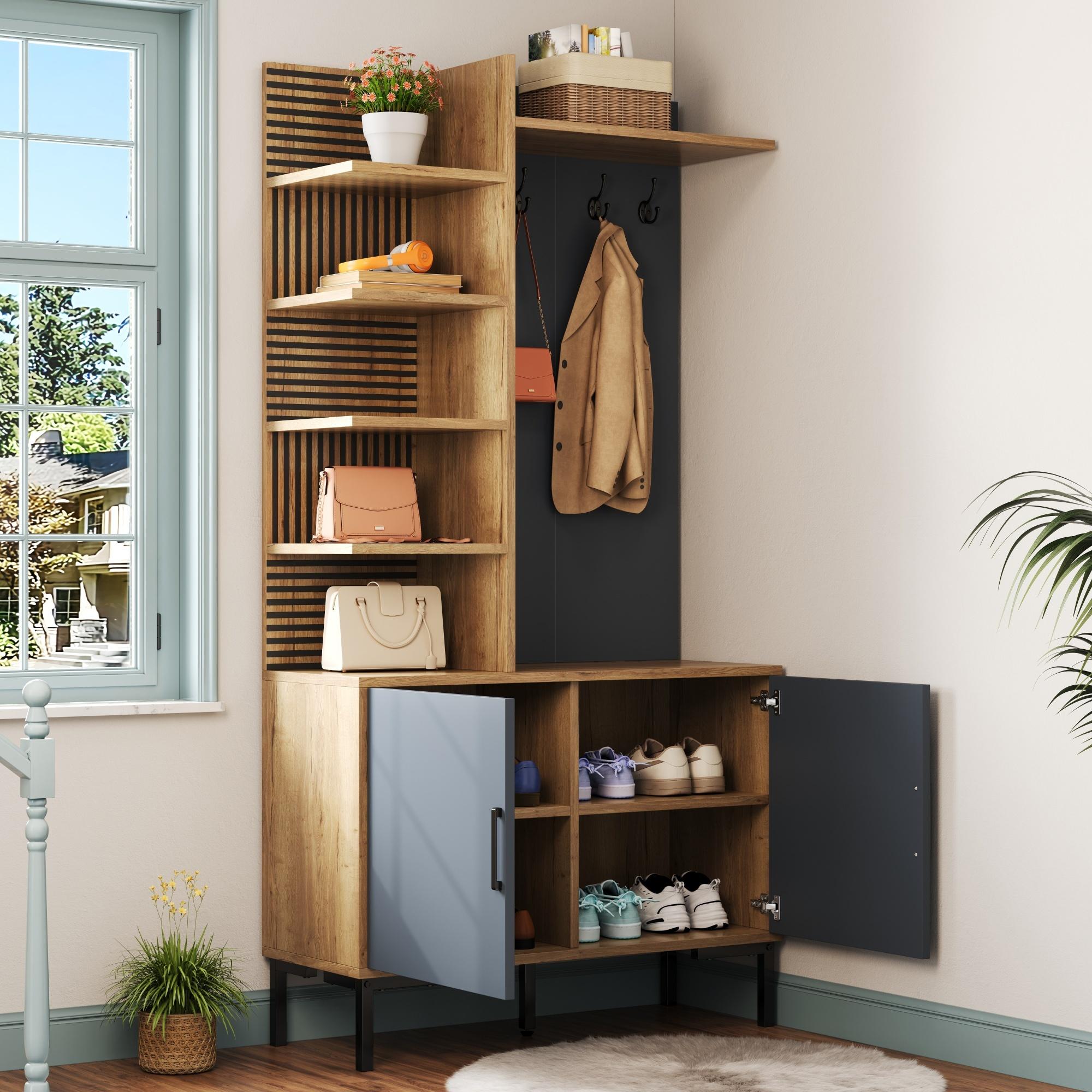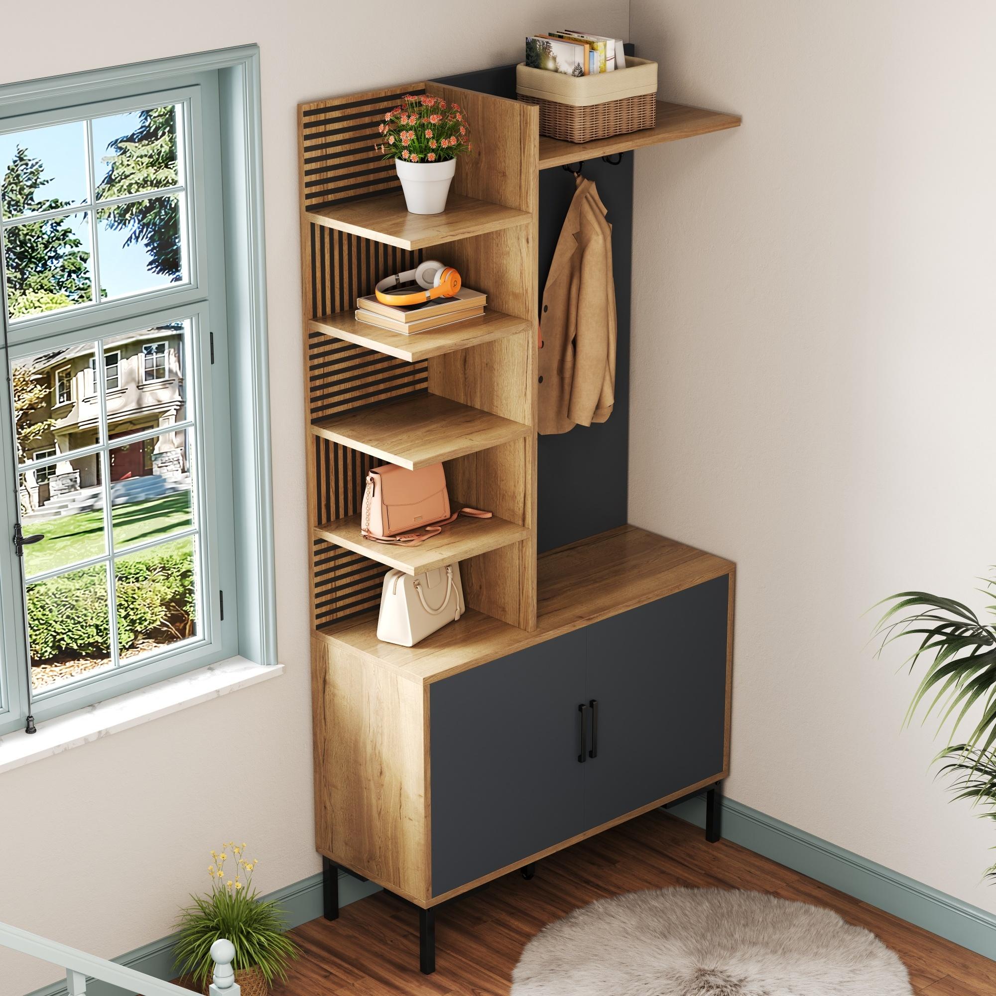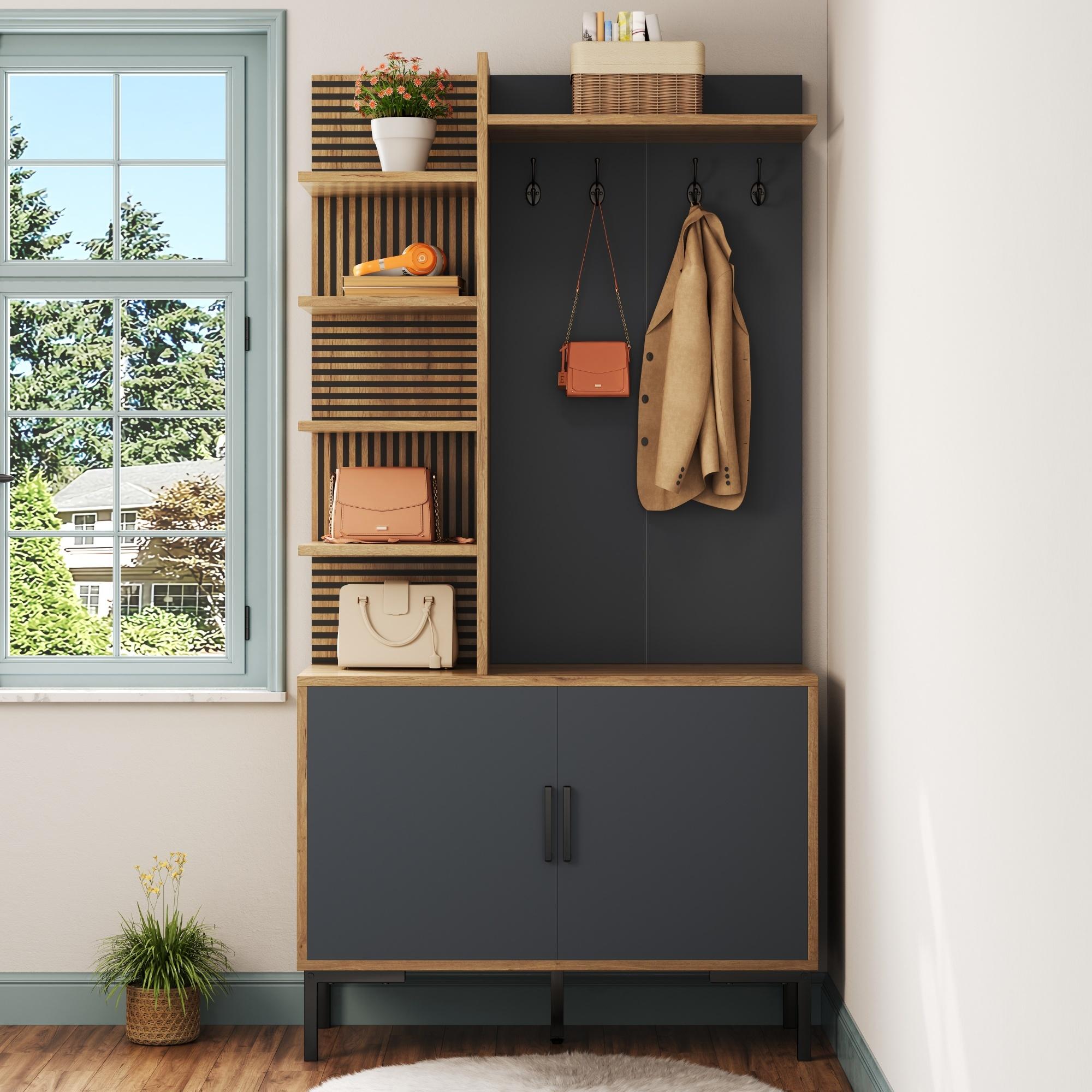 Garde-robe avec étagères, compartiment à chaussures, cloisons réglables et crochets, bois et noir (100x40x190.5 cm)