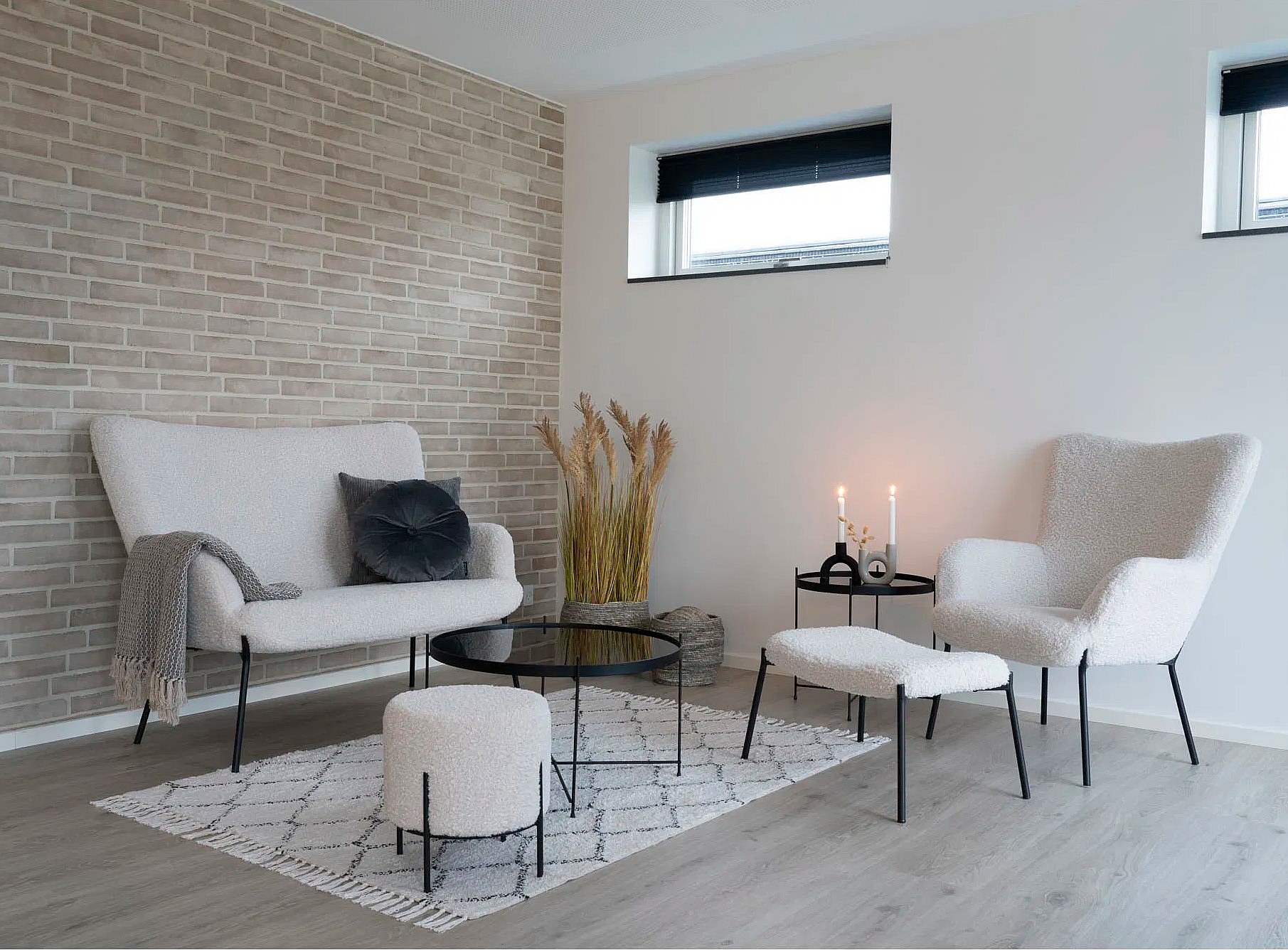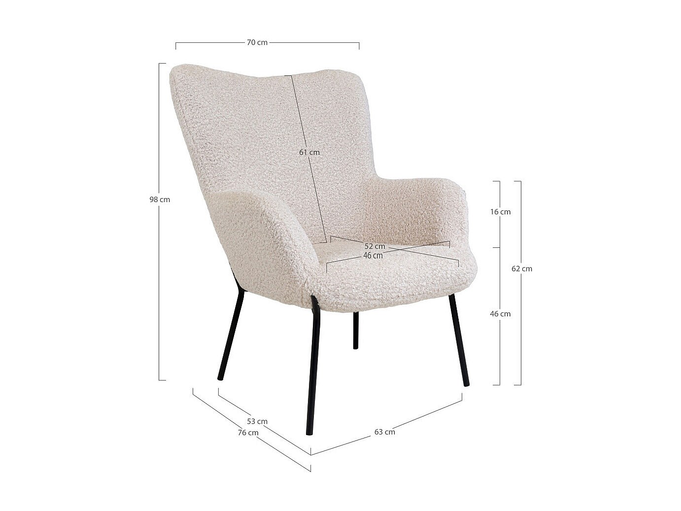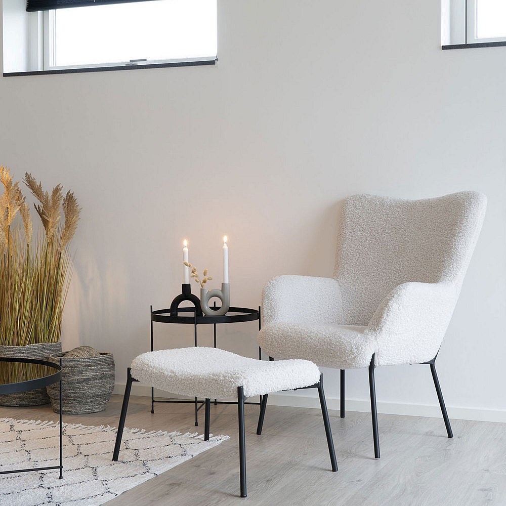 Fauteuil lounge GLASGOW – Tissu bouclette blanc & piétement en métal noir