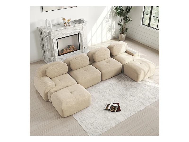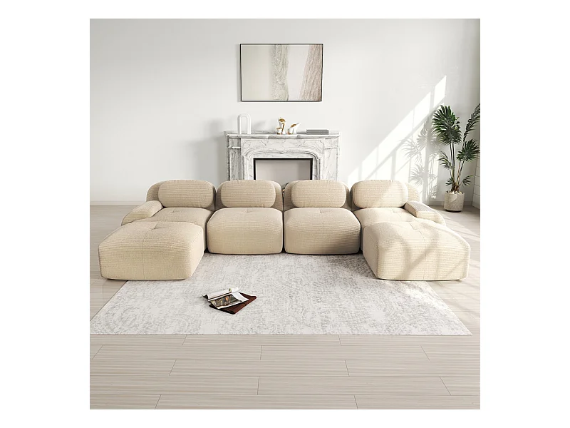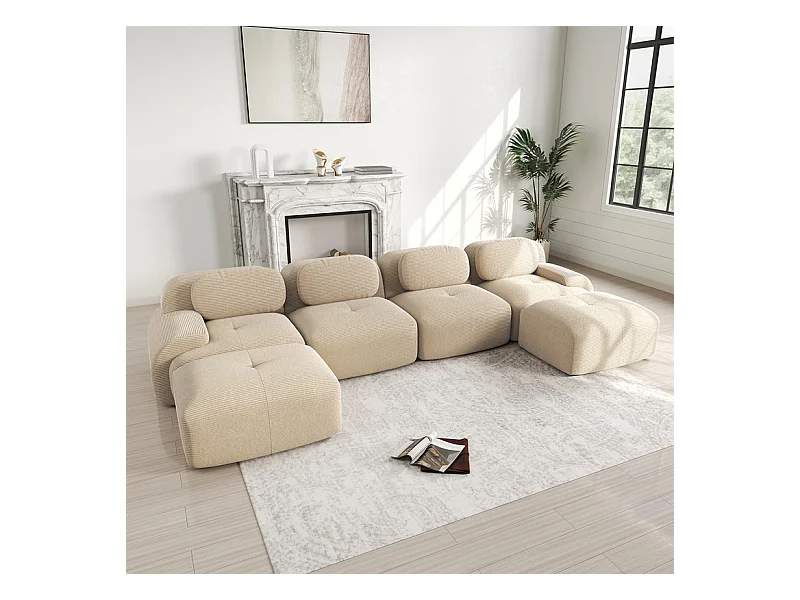 Grand canapé d'angle modulable 388cm - en Velours côtelé - avec 4 oreillers et 2 pouf - ergonomique - Beige