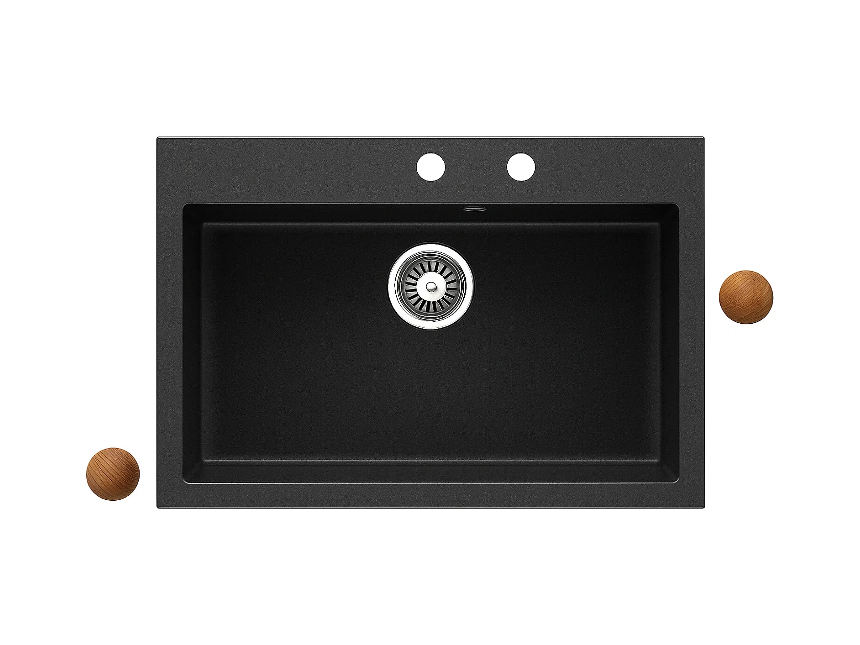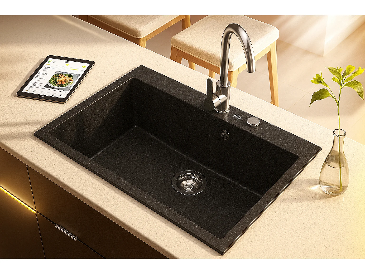 ÉVIER EN GRANIT NOIR AVEC SIPHON CHROMÉ ALOR
