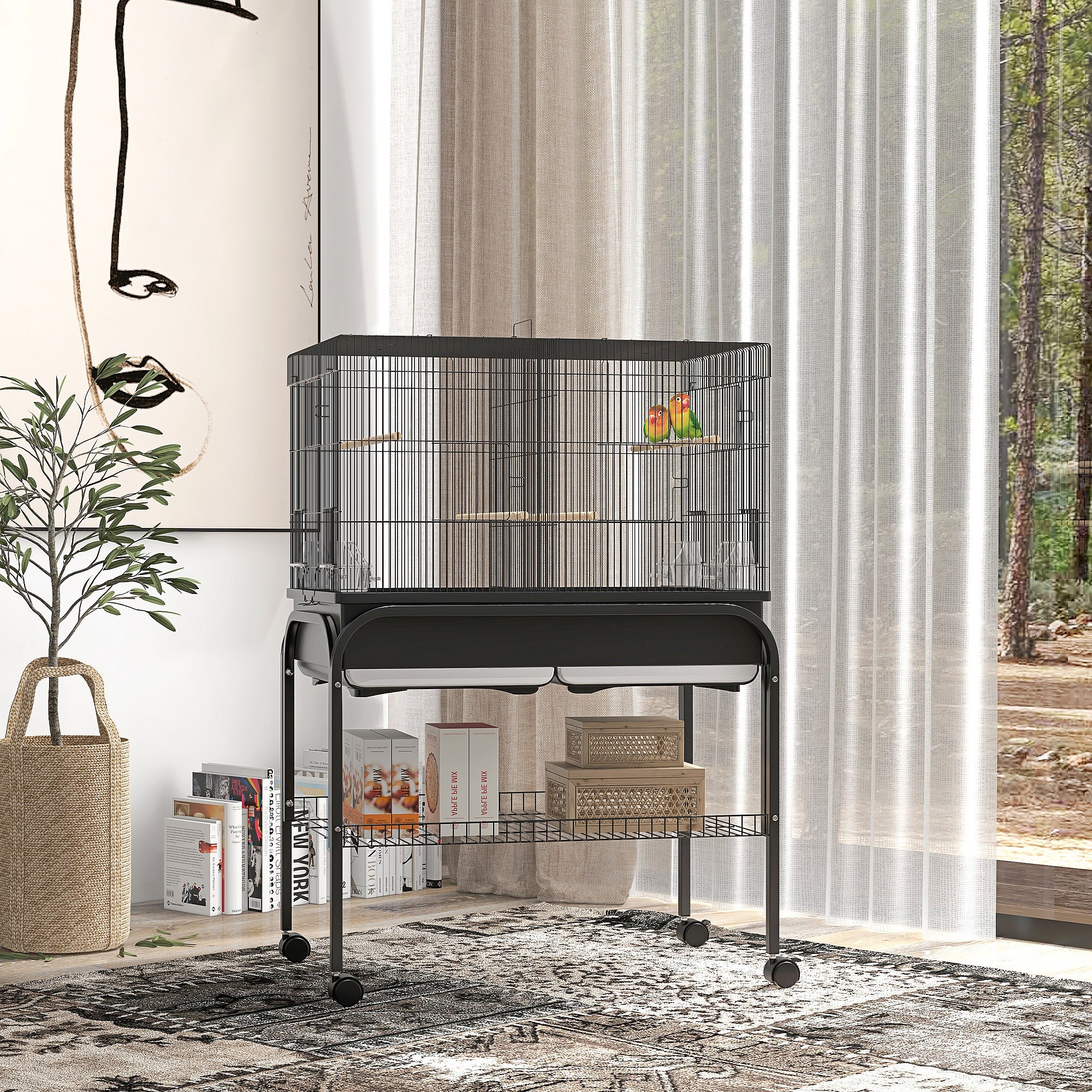 Cage à oiseaux sur roulettes - étagère, plateau déjection, 3 perchoirs, 4 mangeoirs, 2 portes, 8 trappes, accessoires - acier noir