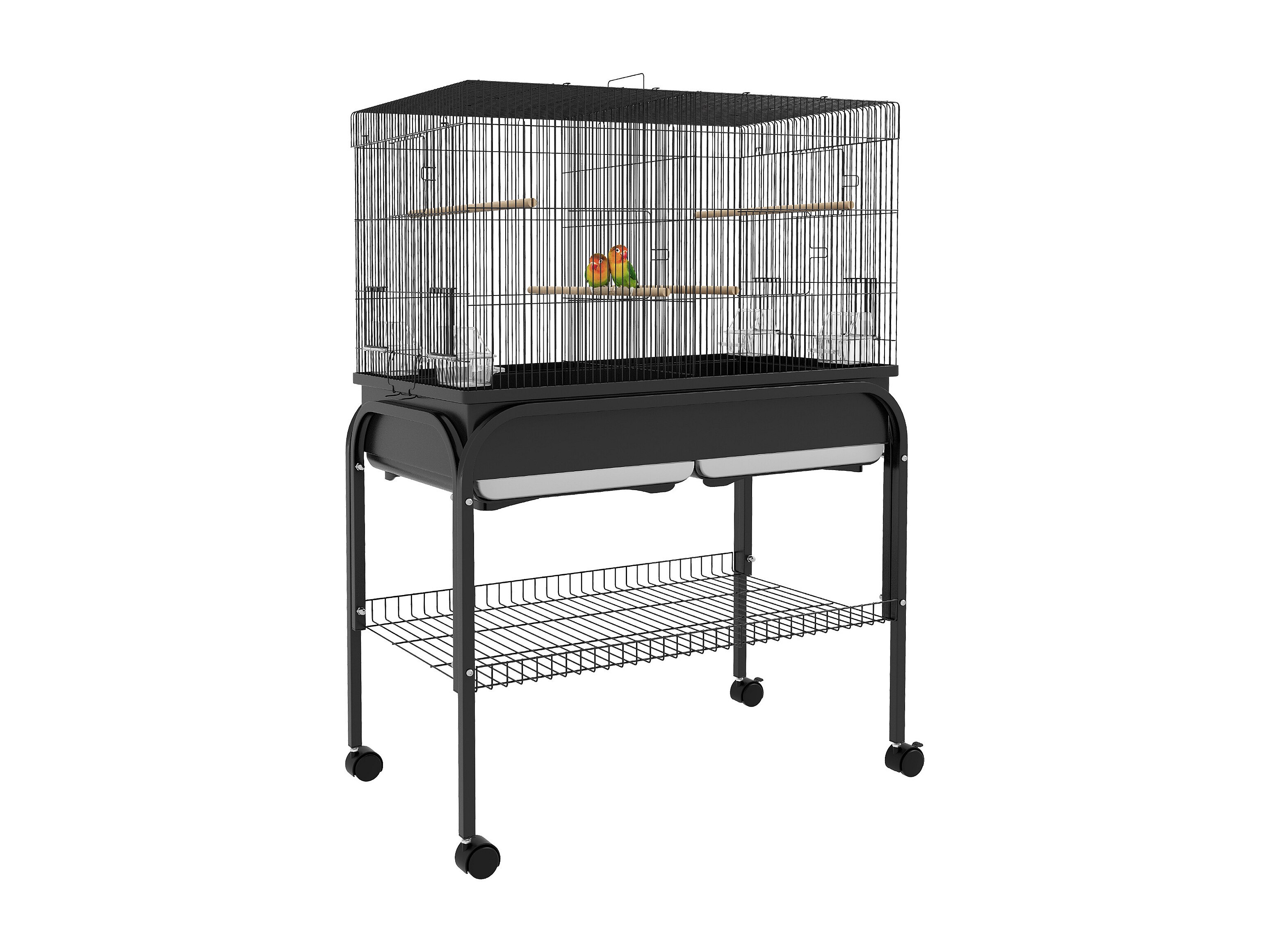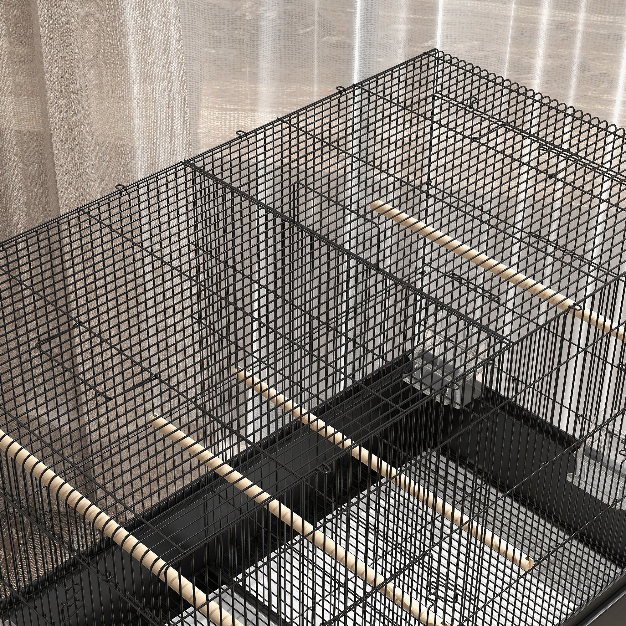 PawHut Cage à oiseaux dim. 59,5L x 29,8I x 35,3H cm mangeoires perchoirs 4 portes plateau excrément amovible + poignée transport métal PP noir