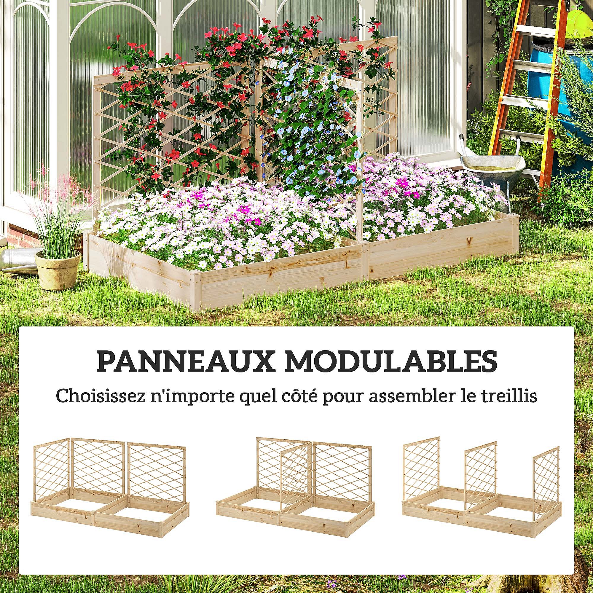 Grande jardinière avec 3 treillis modulables dim. 222 x 114 x H.109cm bois sapin pré-huilé