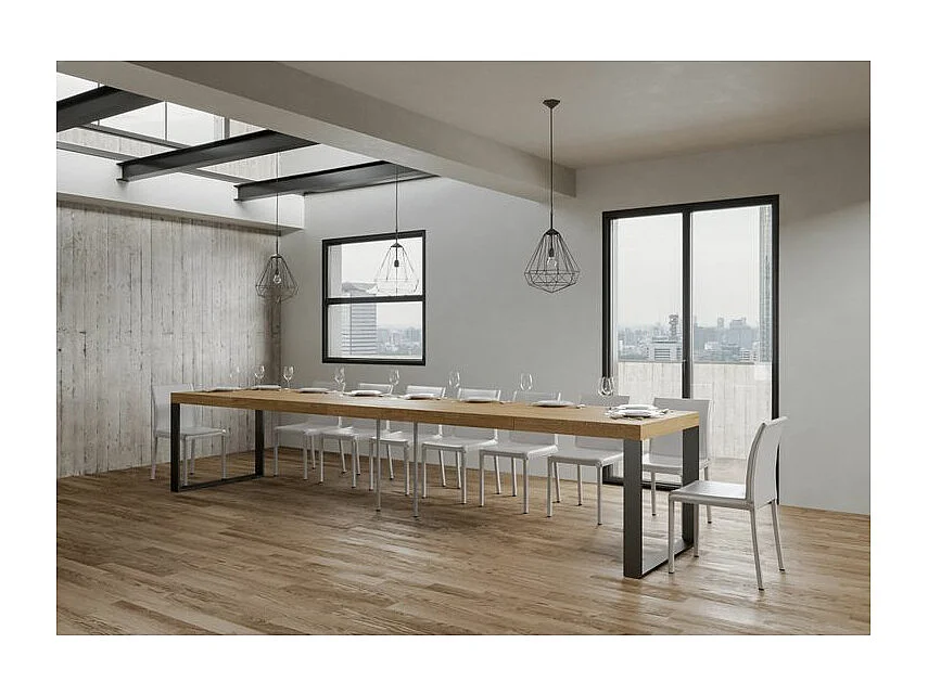 Table à manger extensible Tiroz-Couleur Naturel-2 pieds-5 rallonges épaisses-180 à 440cm