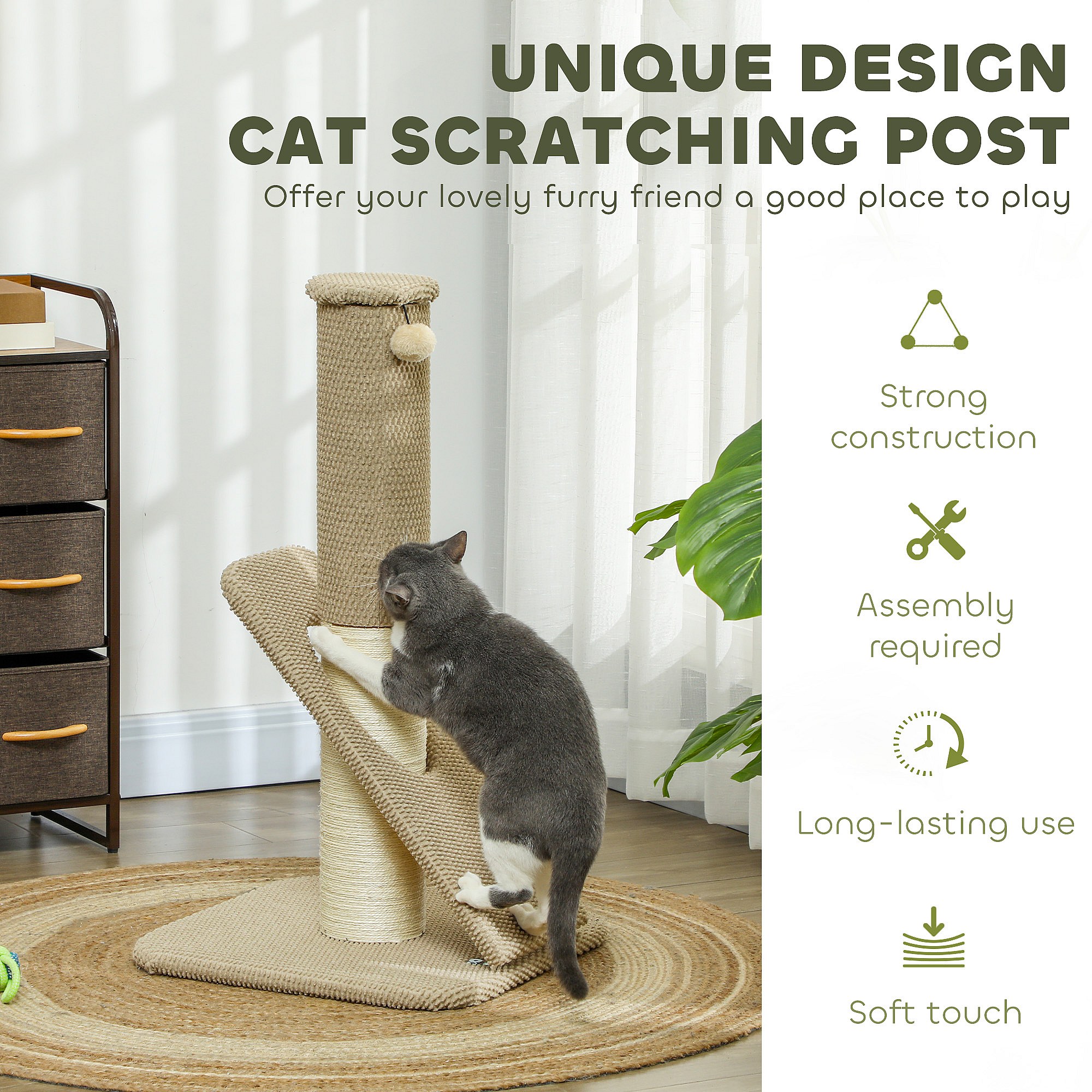 Griffoir chat taille M - Poteau à griffer H.84 cm, jeu boule - sisal naturel revêtement patchwork grain d'ananas beige