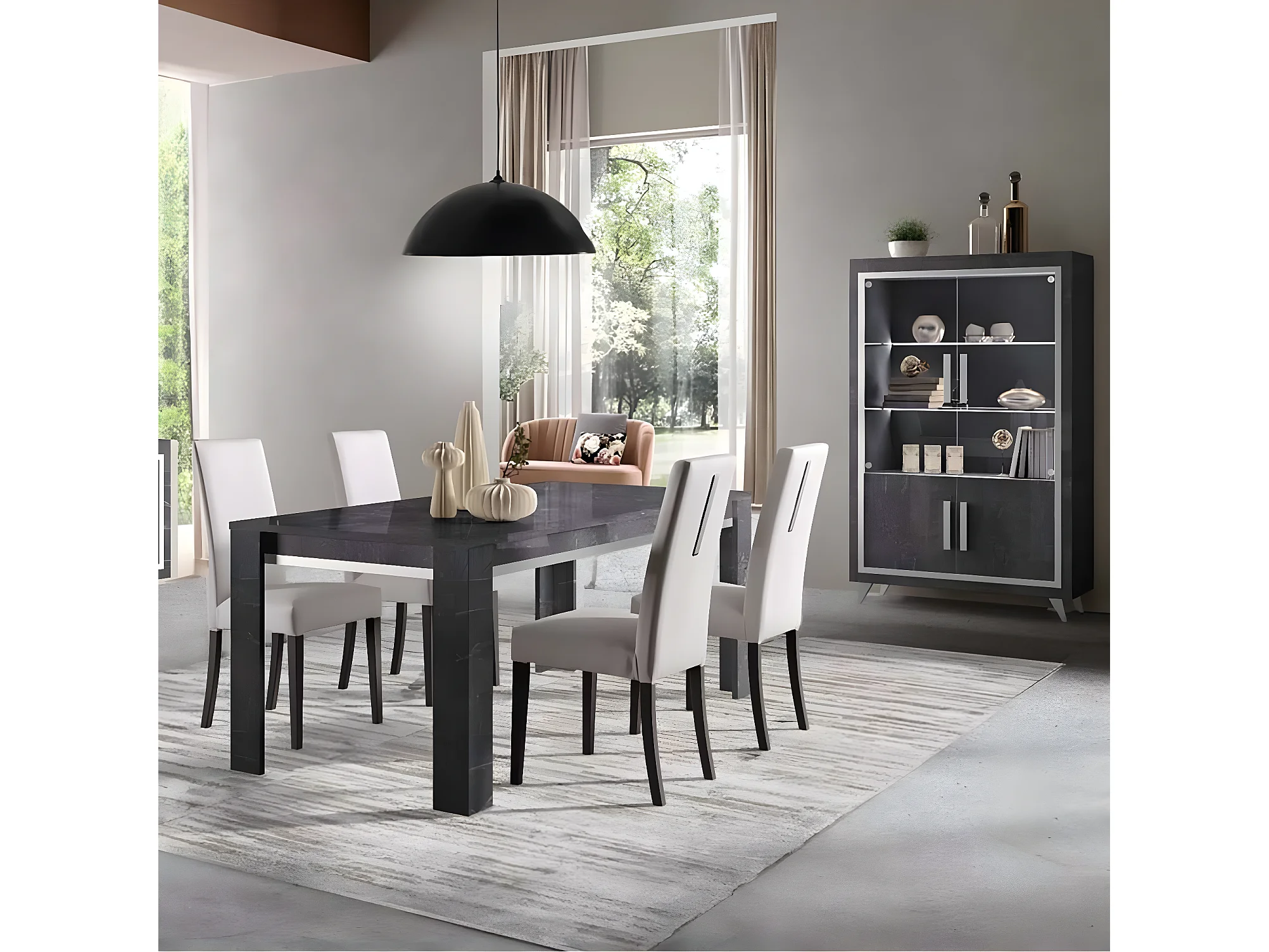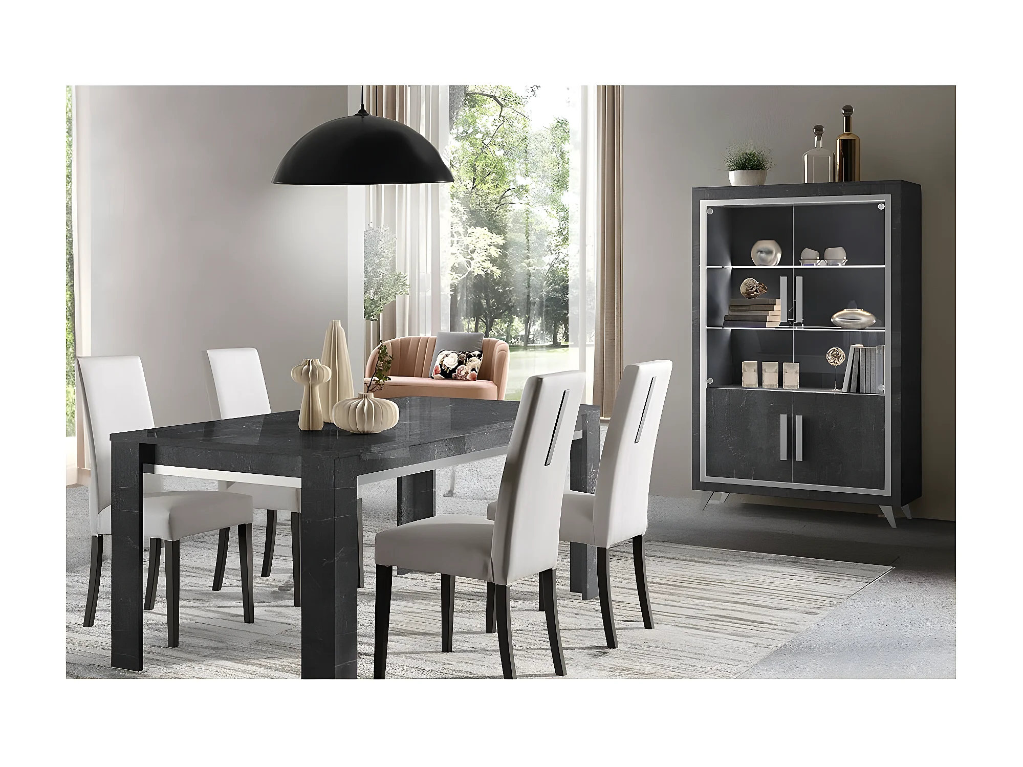 GUEDA - Ensemble Séjour Effet Marbre Anthracite Table 190cm + Vitrine avec Leds