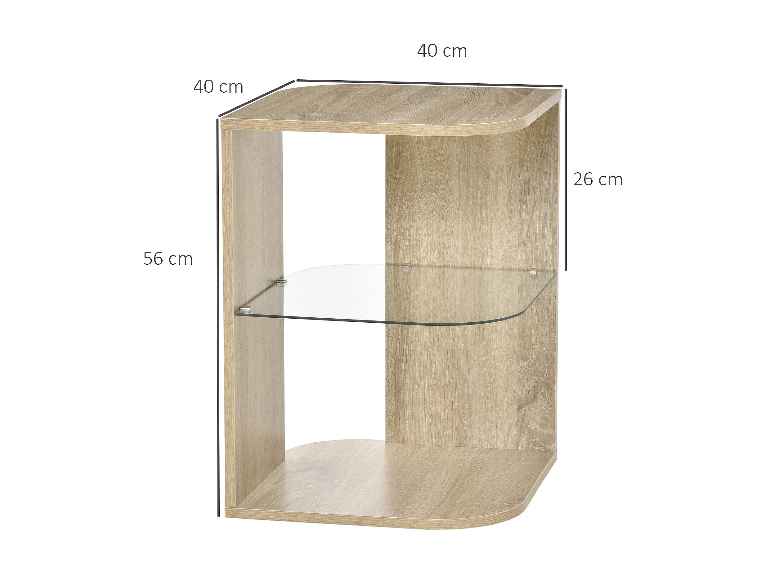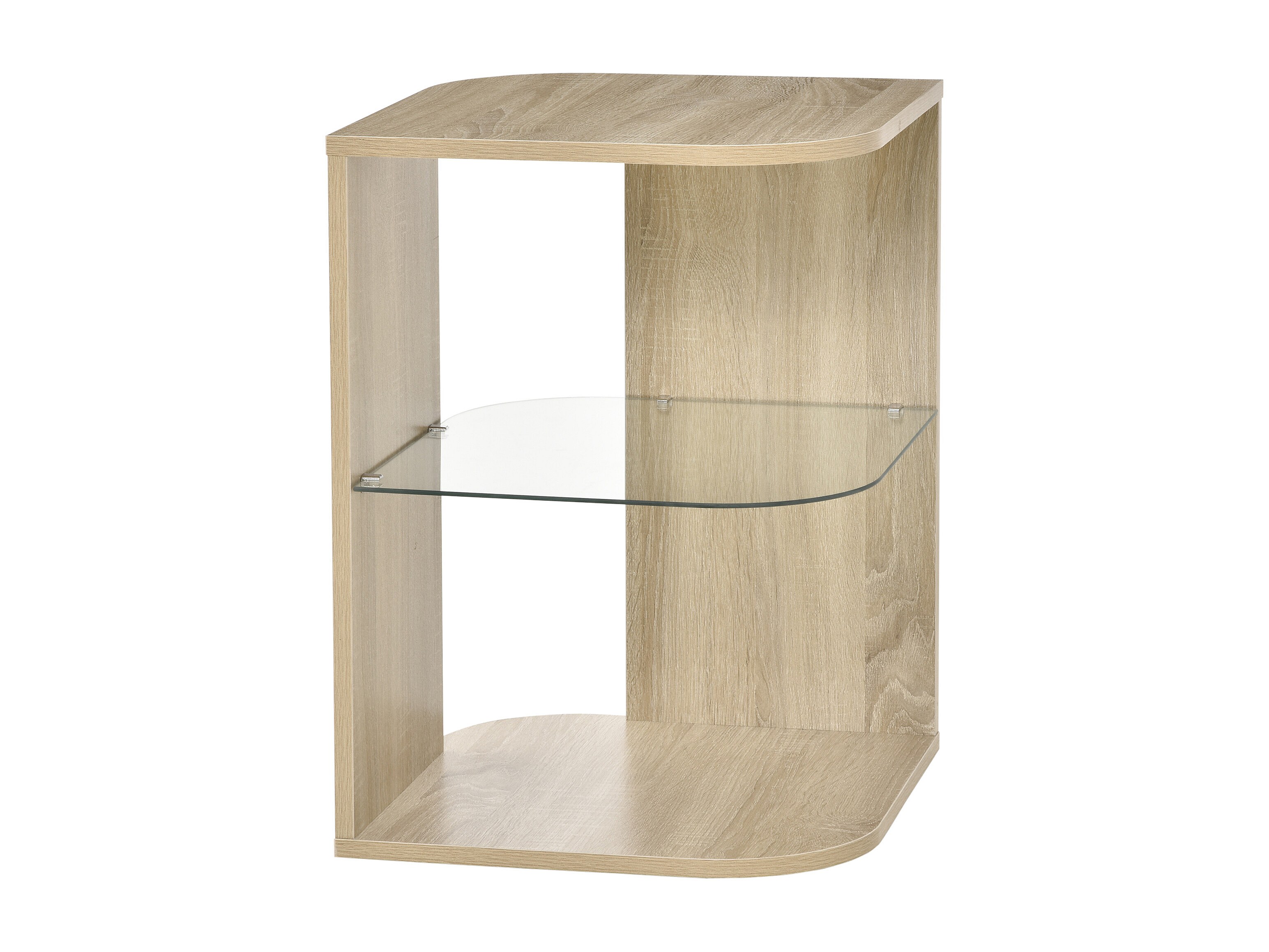 Guéridon design contemporain étagère verre trempé aspect chêne clair