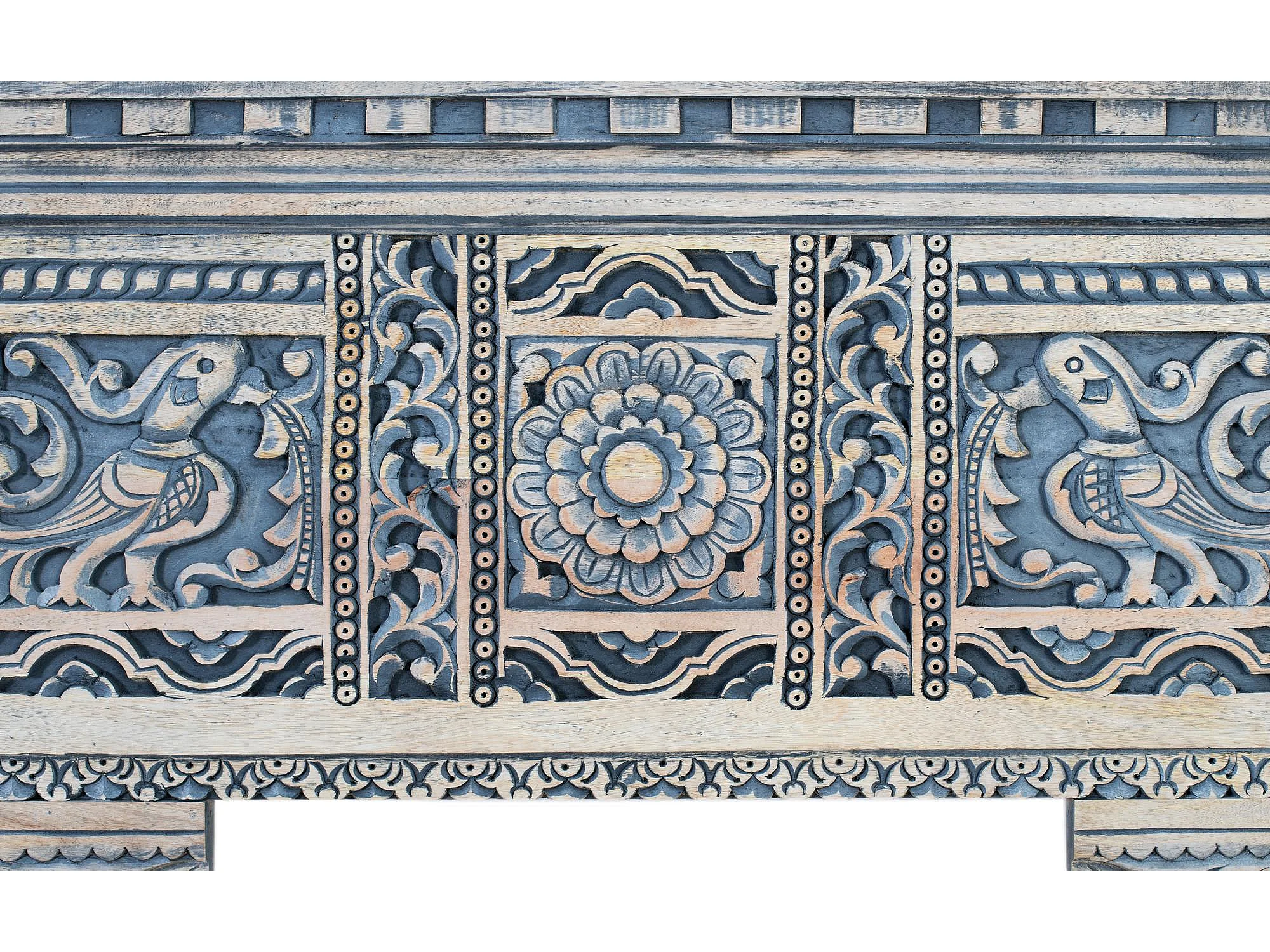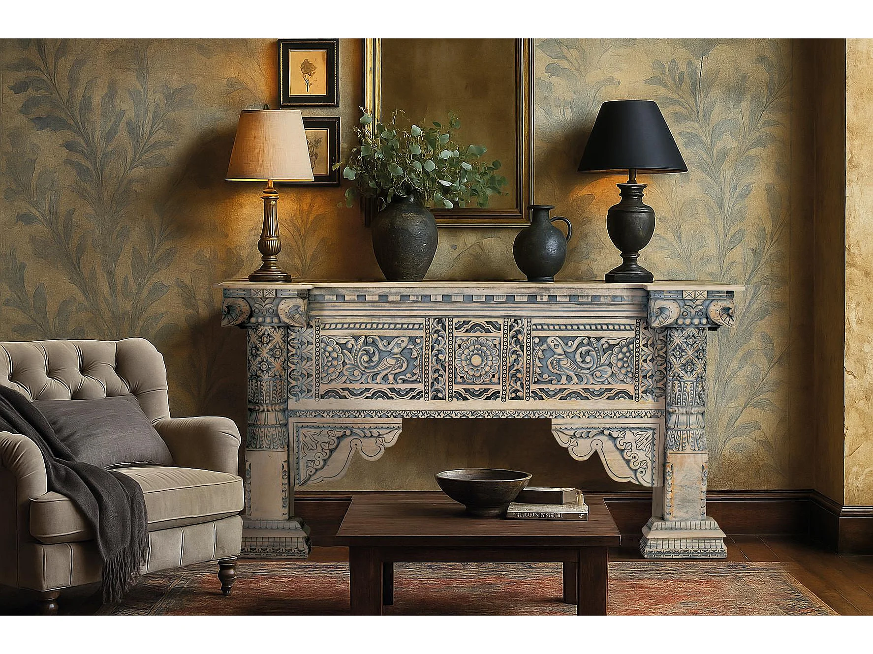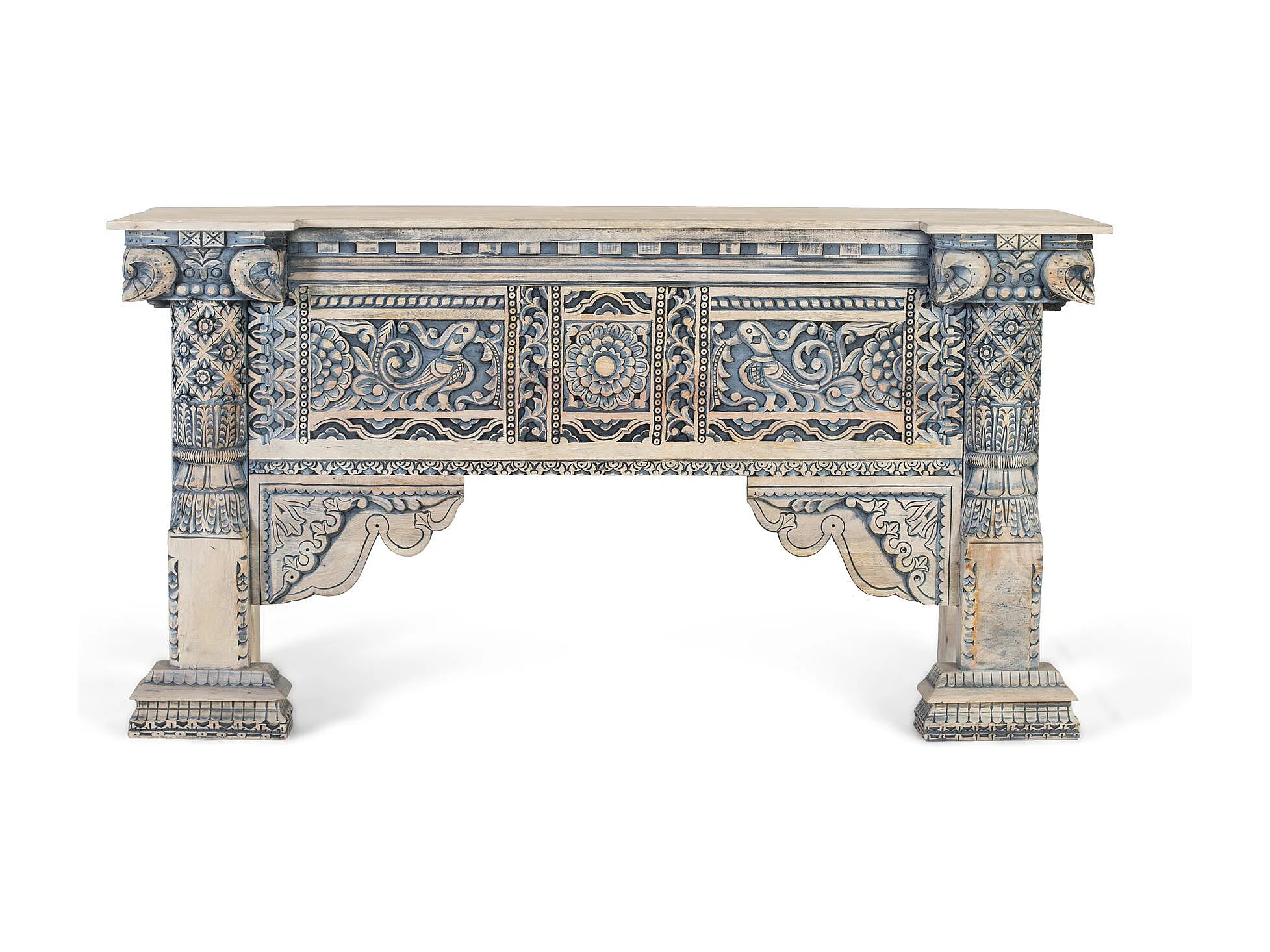 Hall d'entrée en bois de manguier avec colonnes sculptées à la main