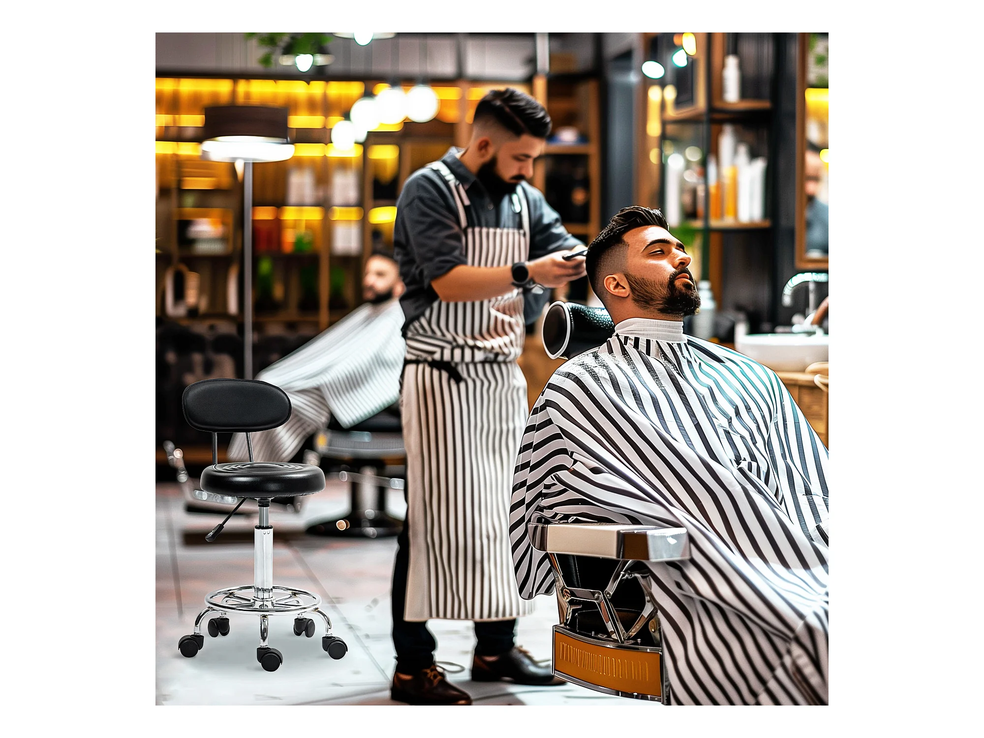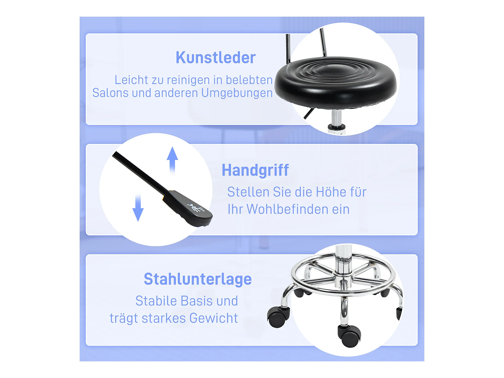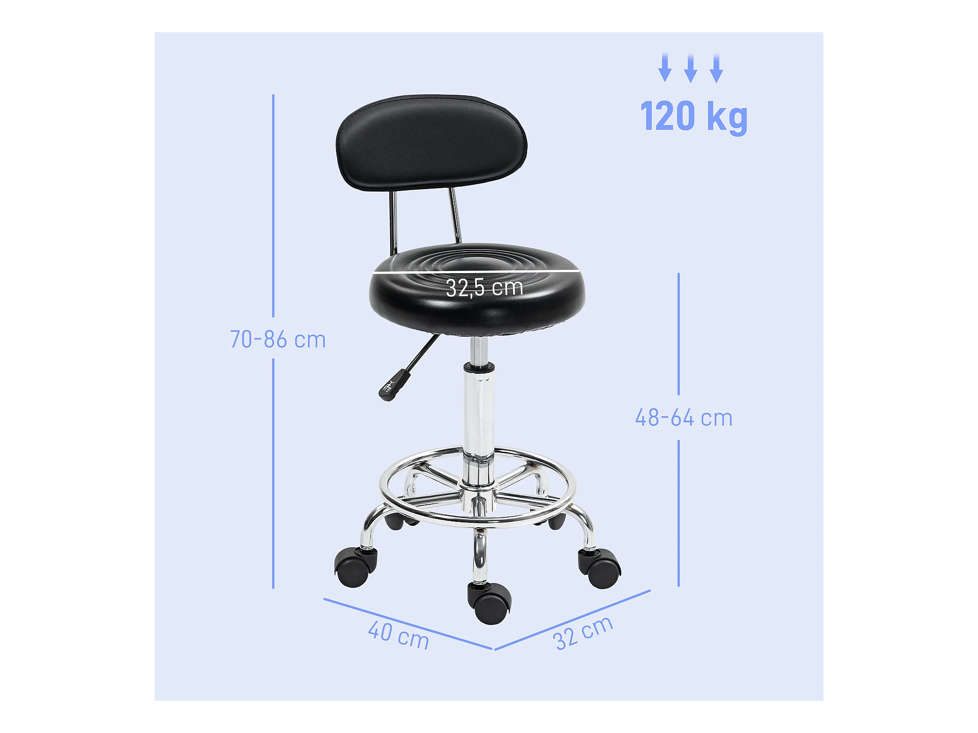 Hocker de bureau réglable en hauteur avec dossier, roulettes et repose-pieds ajustable, siège pivotant, cuir synthétique, noir (40x32x70-86 cm)