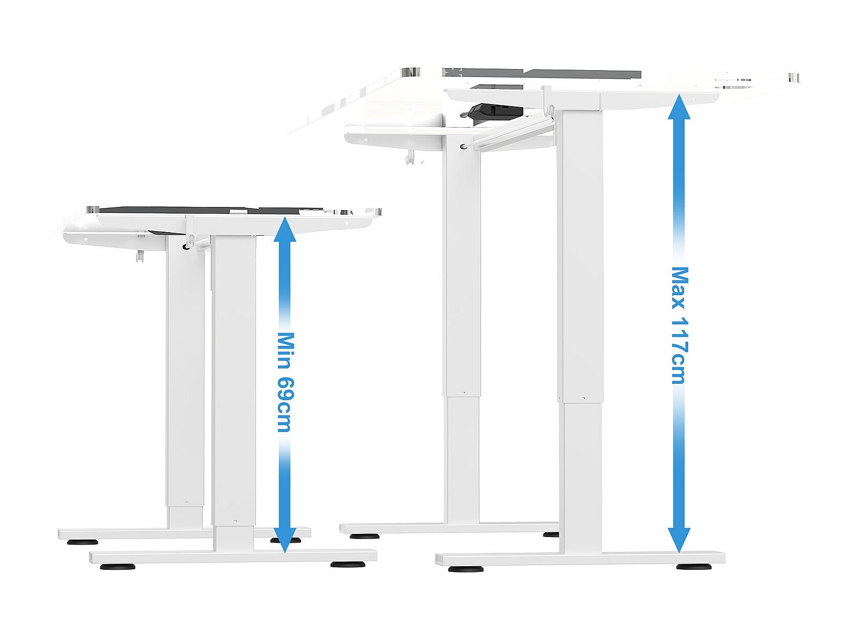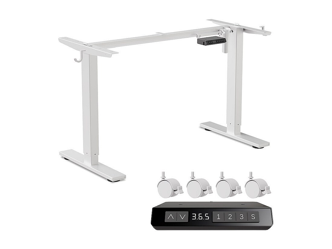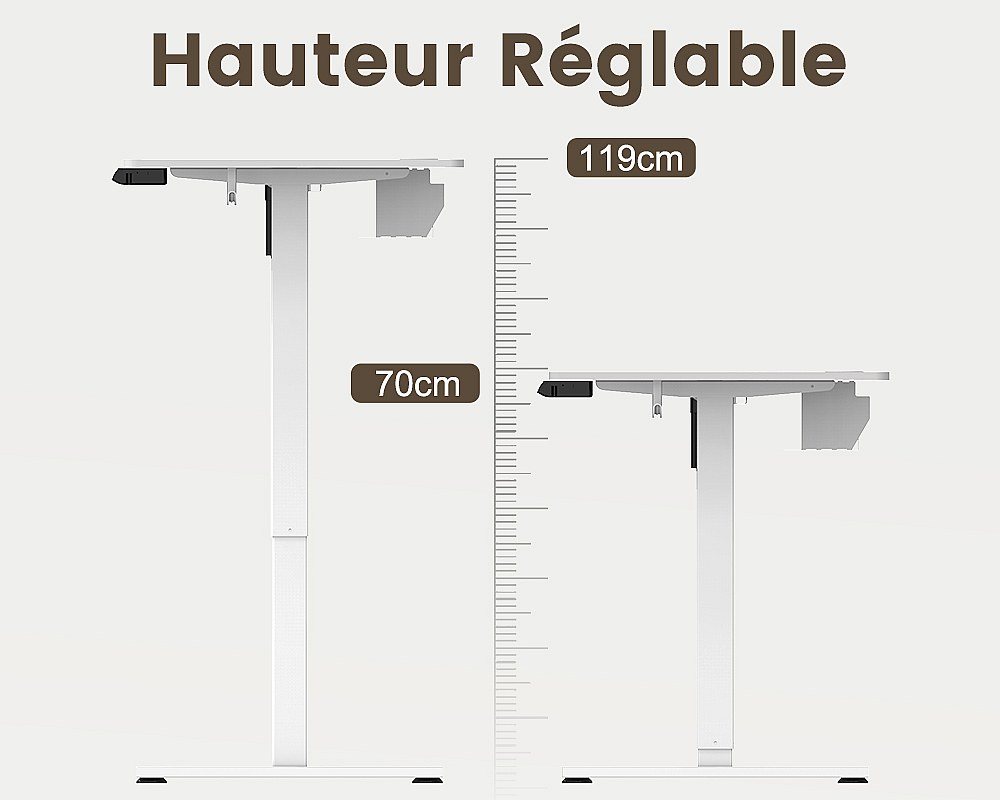 Homavo support de bureau réglable avec mémoire, rebond en cas de résistance, ports USB/Type-C, hauteur 69-117 cm.
