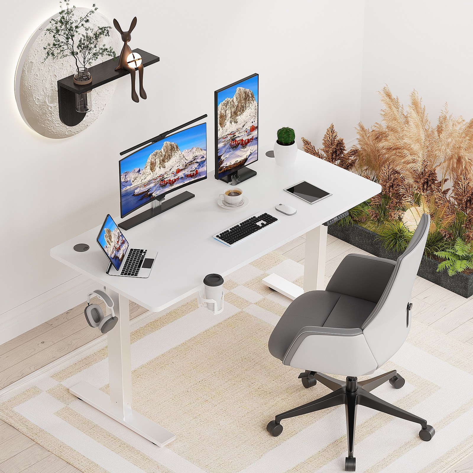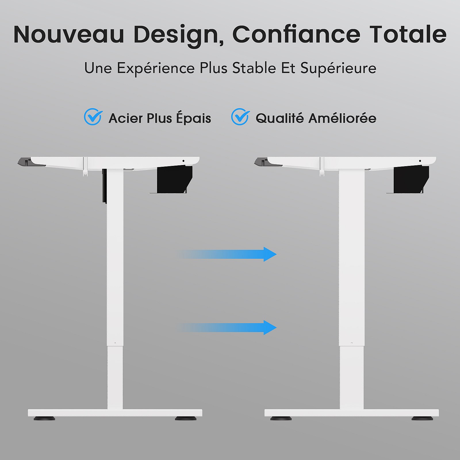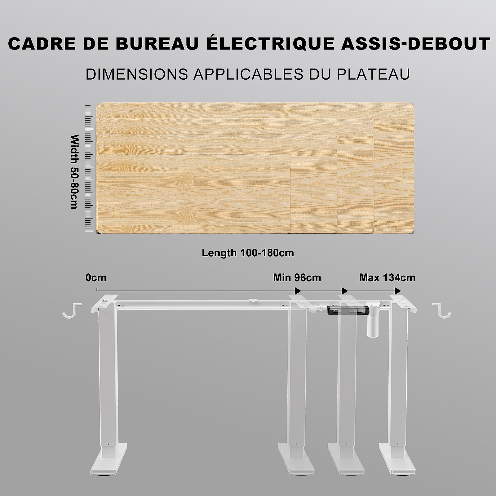 Homavo support de bureau réglable avec mémoire, rebond en cas de résistance, ports USB/Type-C, hauteur 69-117 cm.