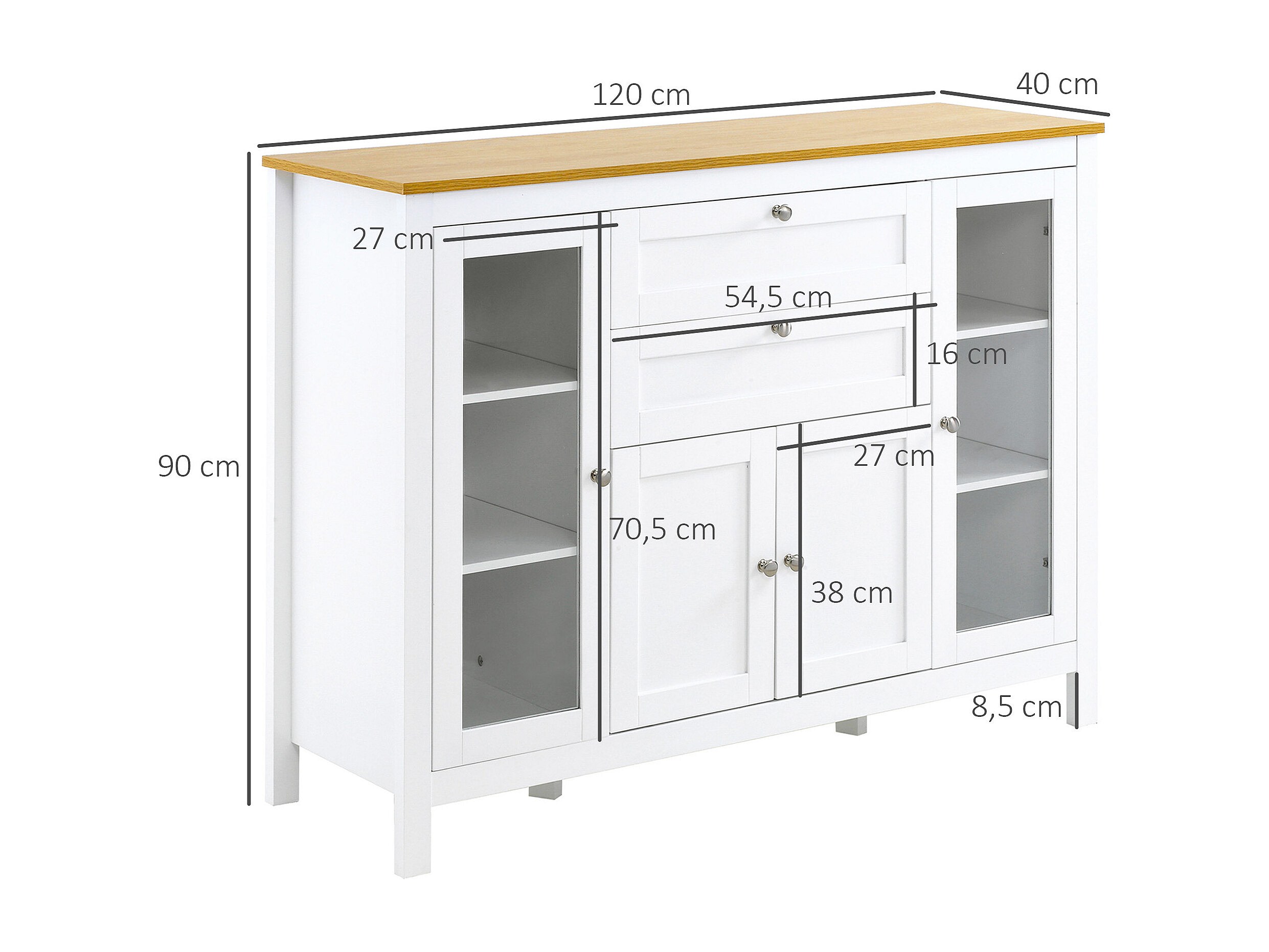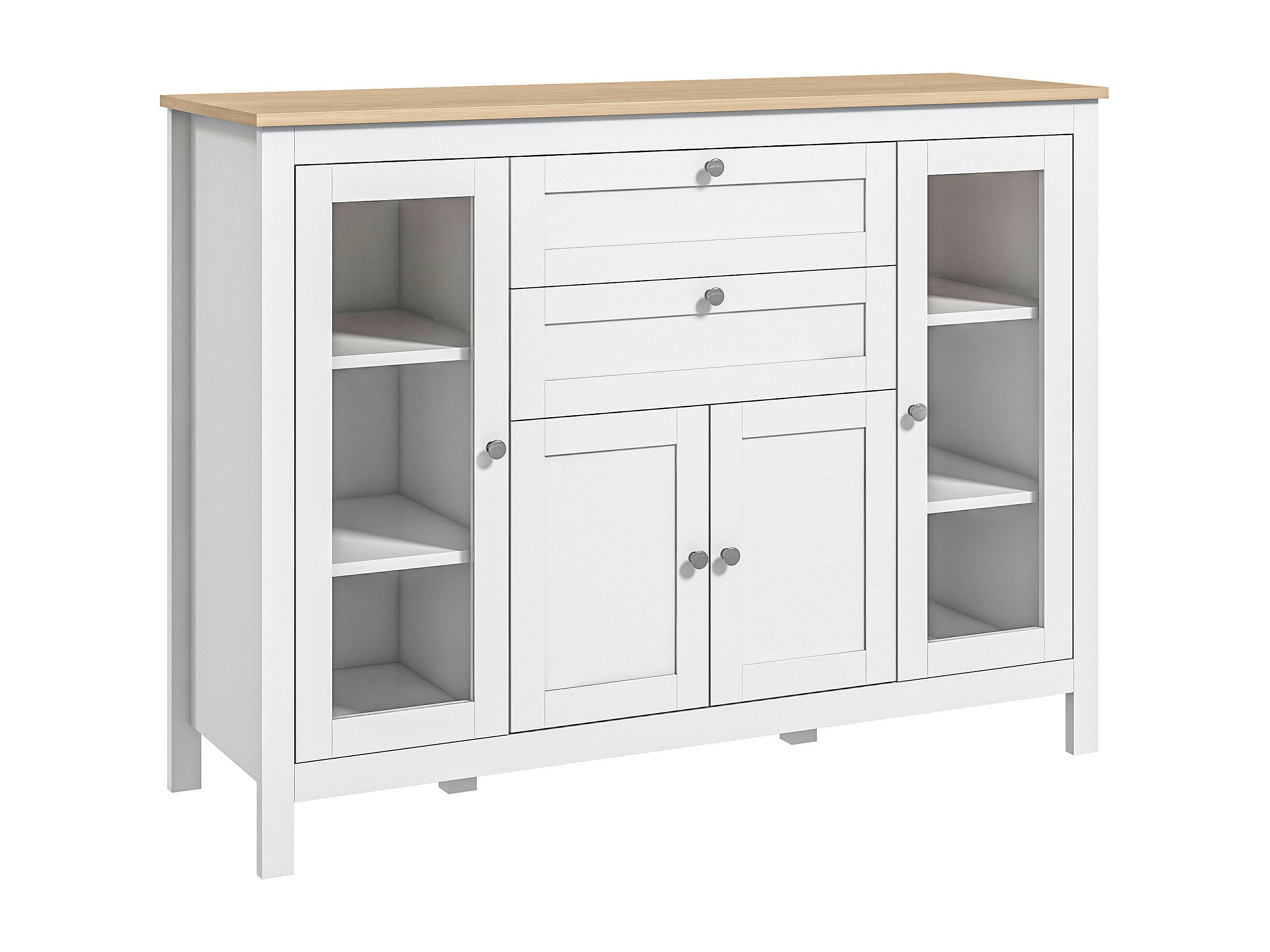 Buffet style classique chic multi-rangement 2 portes 2 étagères réglables 2 tiroirs coulissants placard 2 portes MDF blanc plateau aspect bois clair