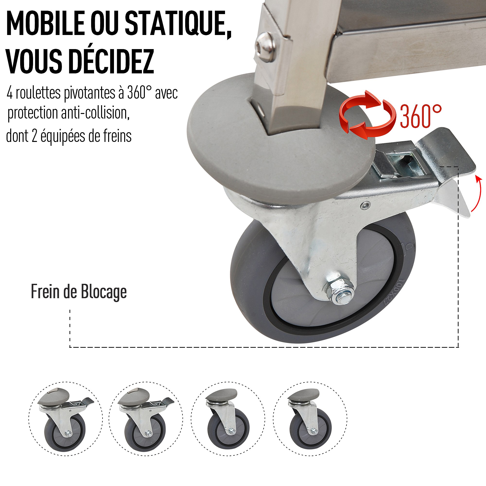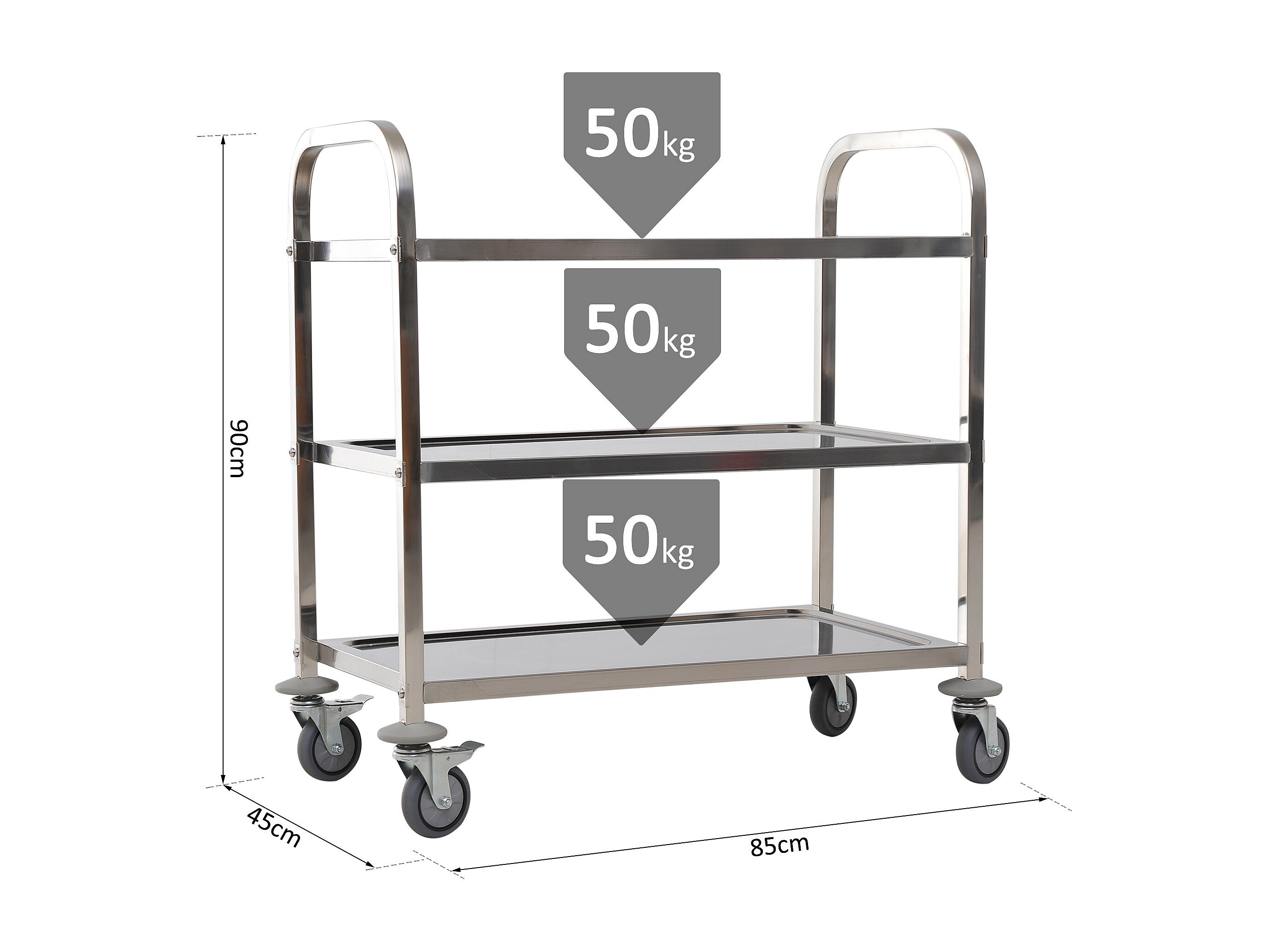 HOMCOM Chariot de service desserte de cuisine à roulettes 3 étagères 85L x 45l x 90H cm acier inox. chromé