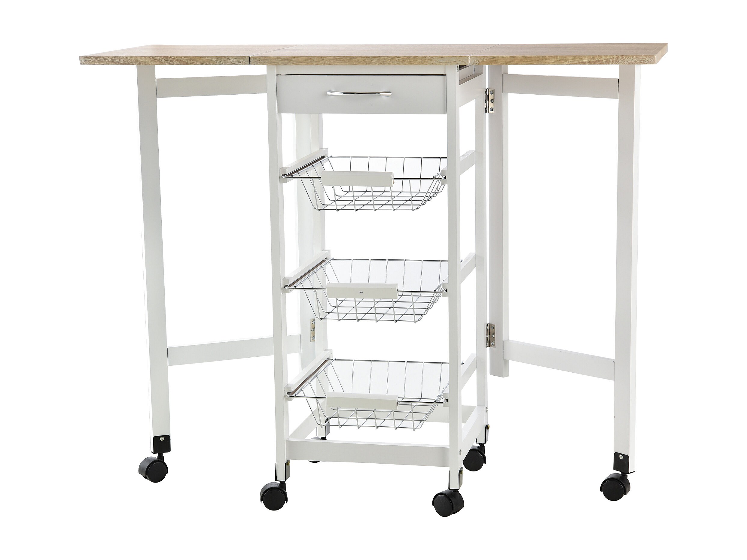 Chariot de service desserte de cuisine à roulettes multi-rangements 3 paniers métal + tiroir + rallonges MDF blanc chêne clair