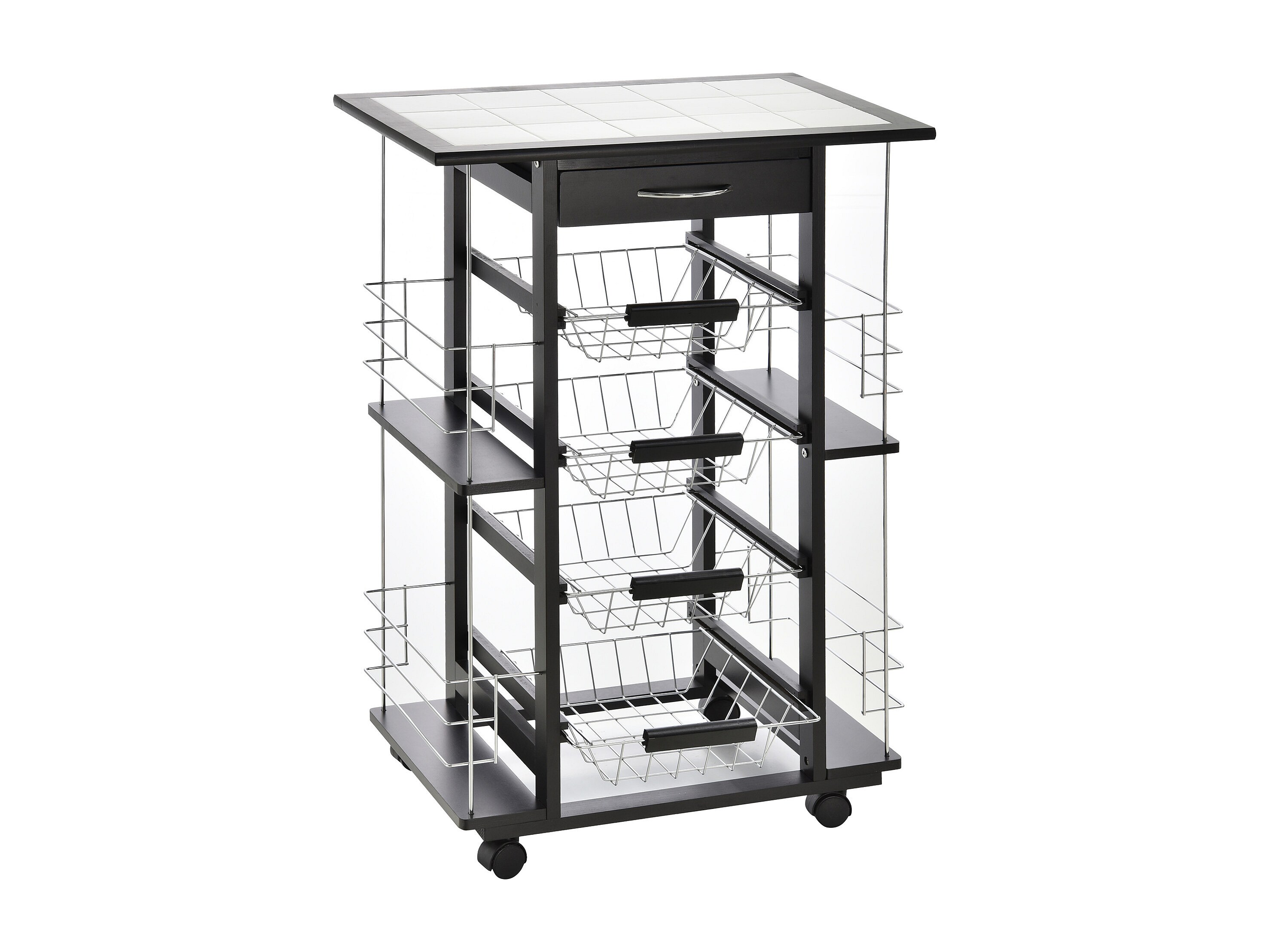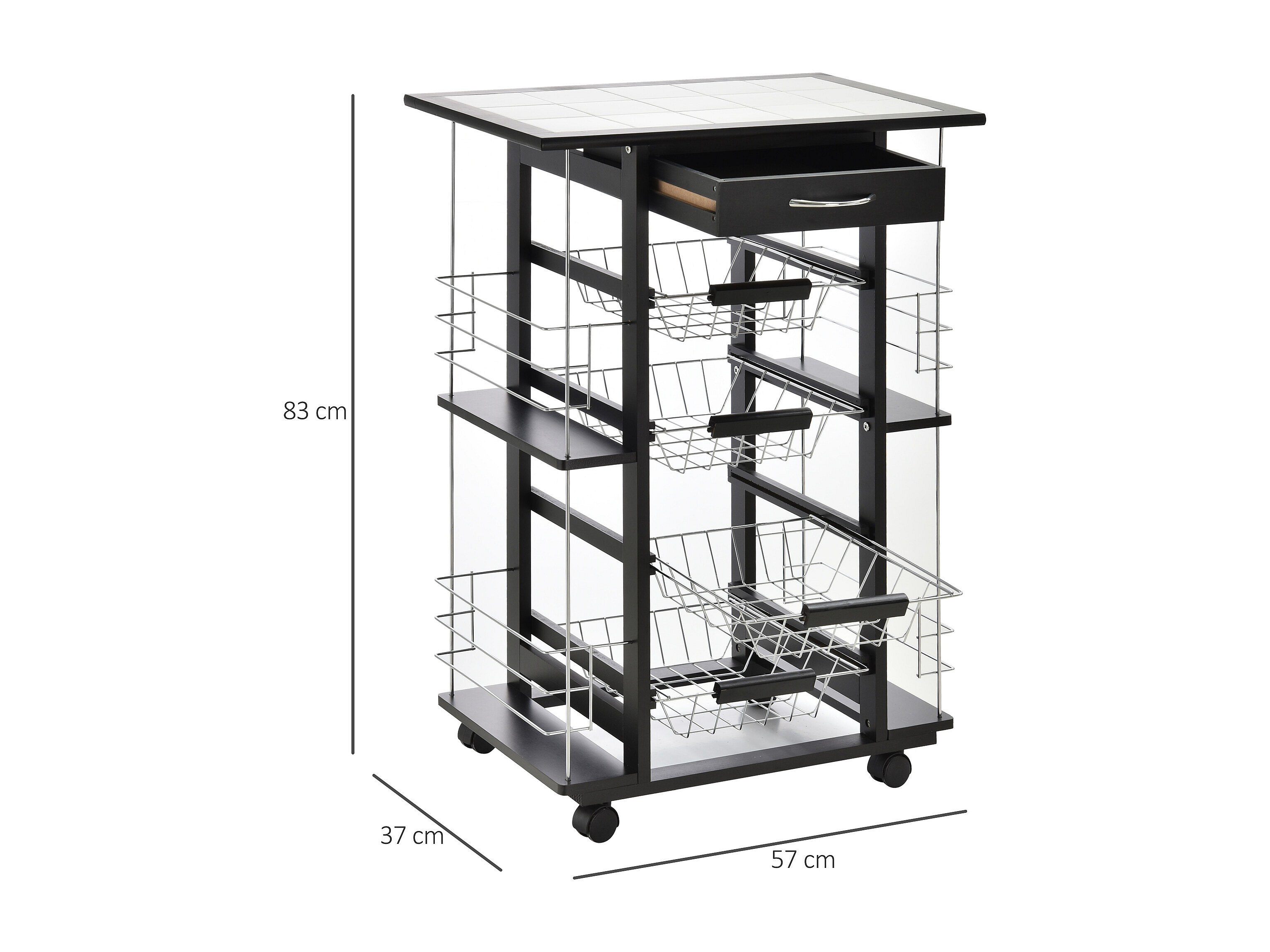 Chariot de service desserte de cuisine à roulettes multi-rangements 4 paniers métal tiroir + 4 range-bouteilles bois pin noir plateau carrelé blanc