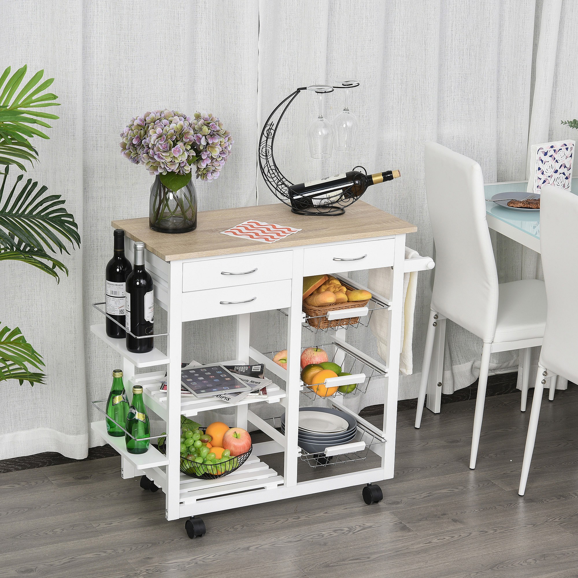 Desserte chariot de cuisine sur roulettes - 4 paniers coulissants, tiroir, plateau - bois blanc MDF bois clair