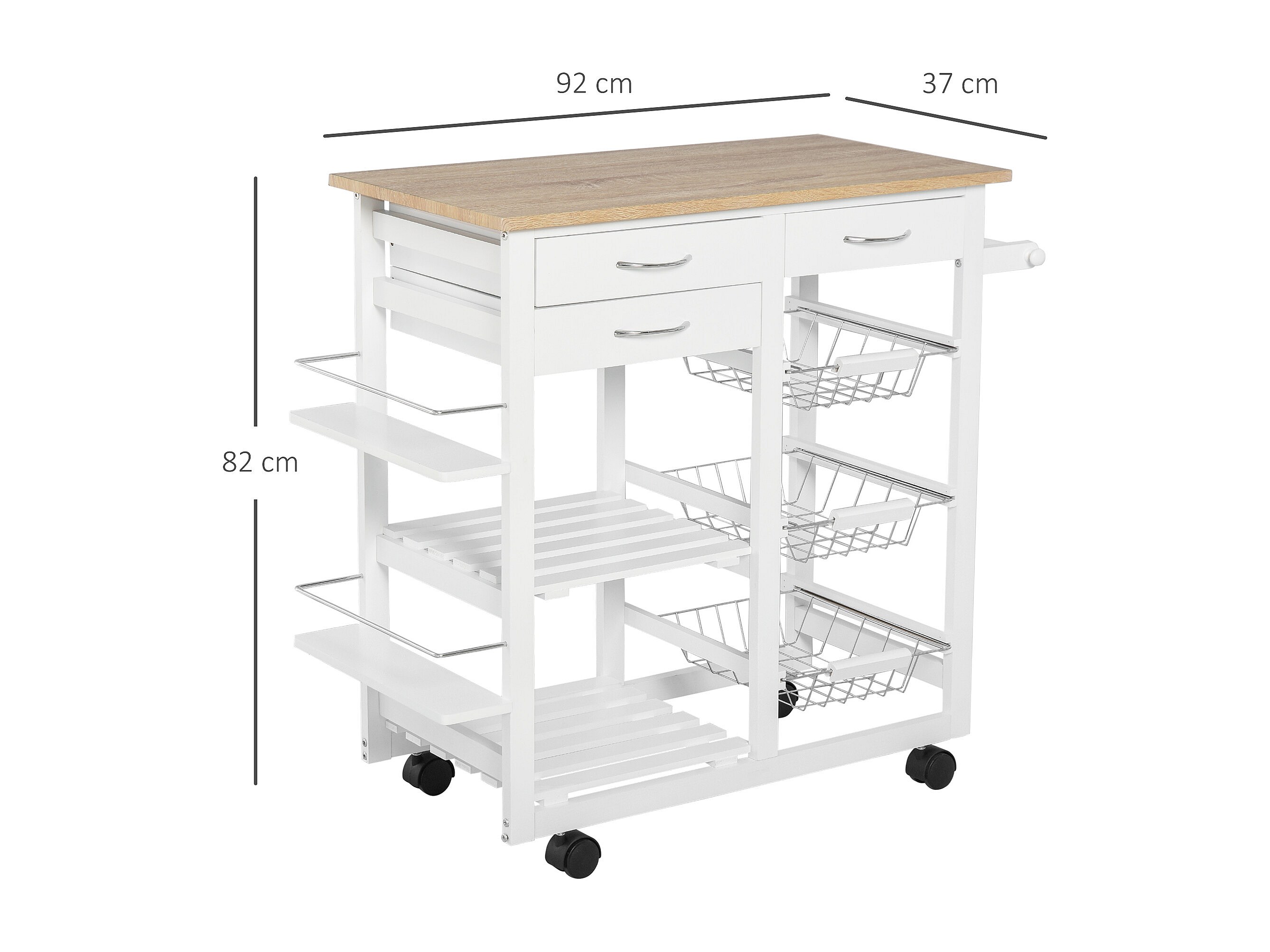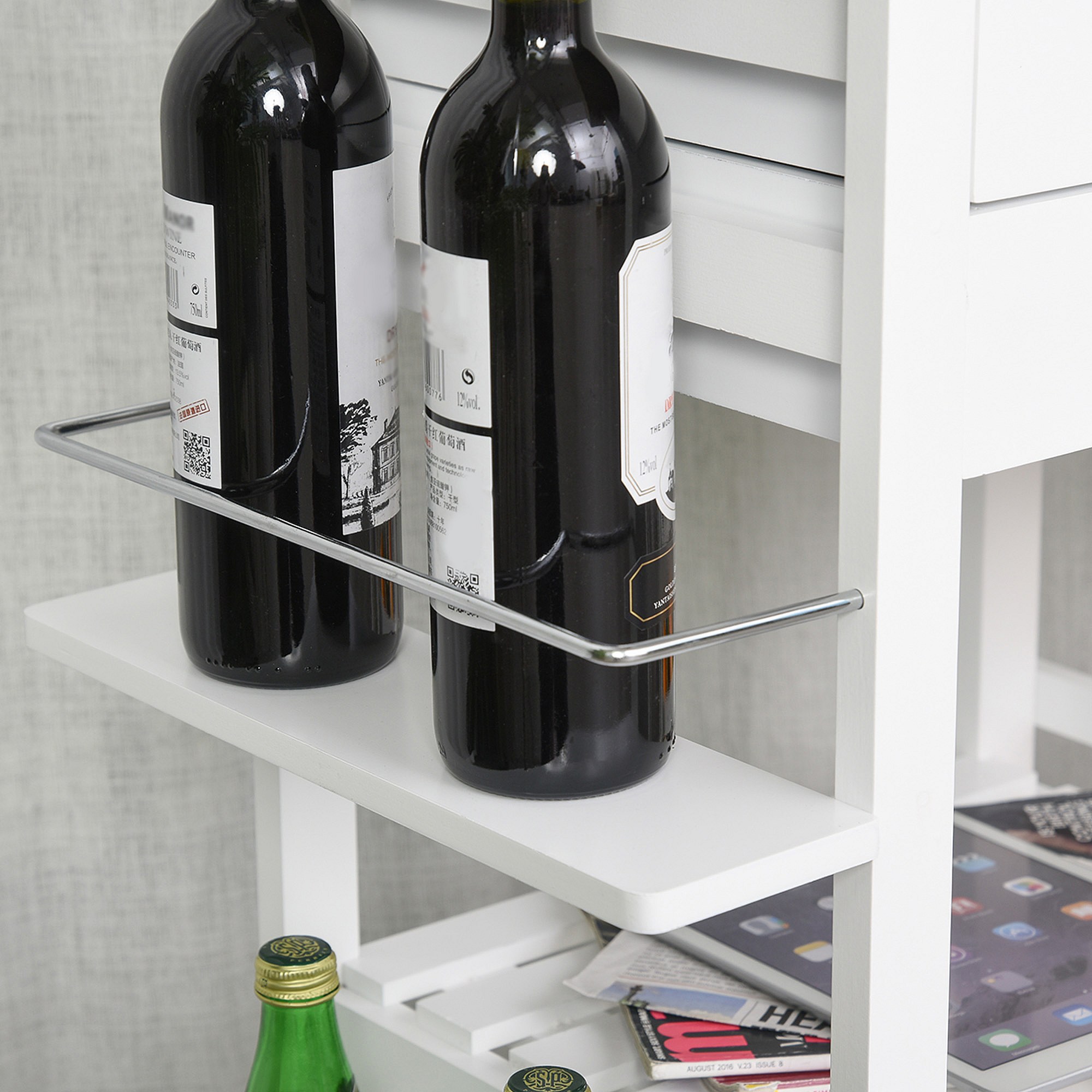 Chariot de service desserte de cuisine à roulettes multi-rangements 4 paniers métal tiroir + 4 range-bouteilles bois pin plateau carrelé blanc