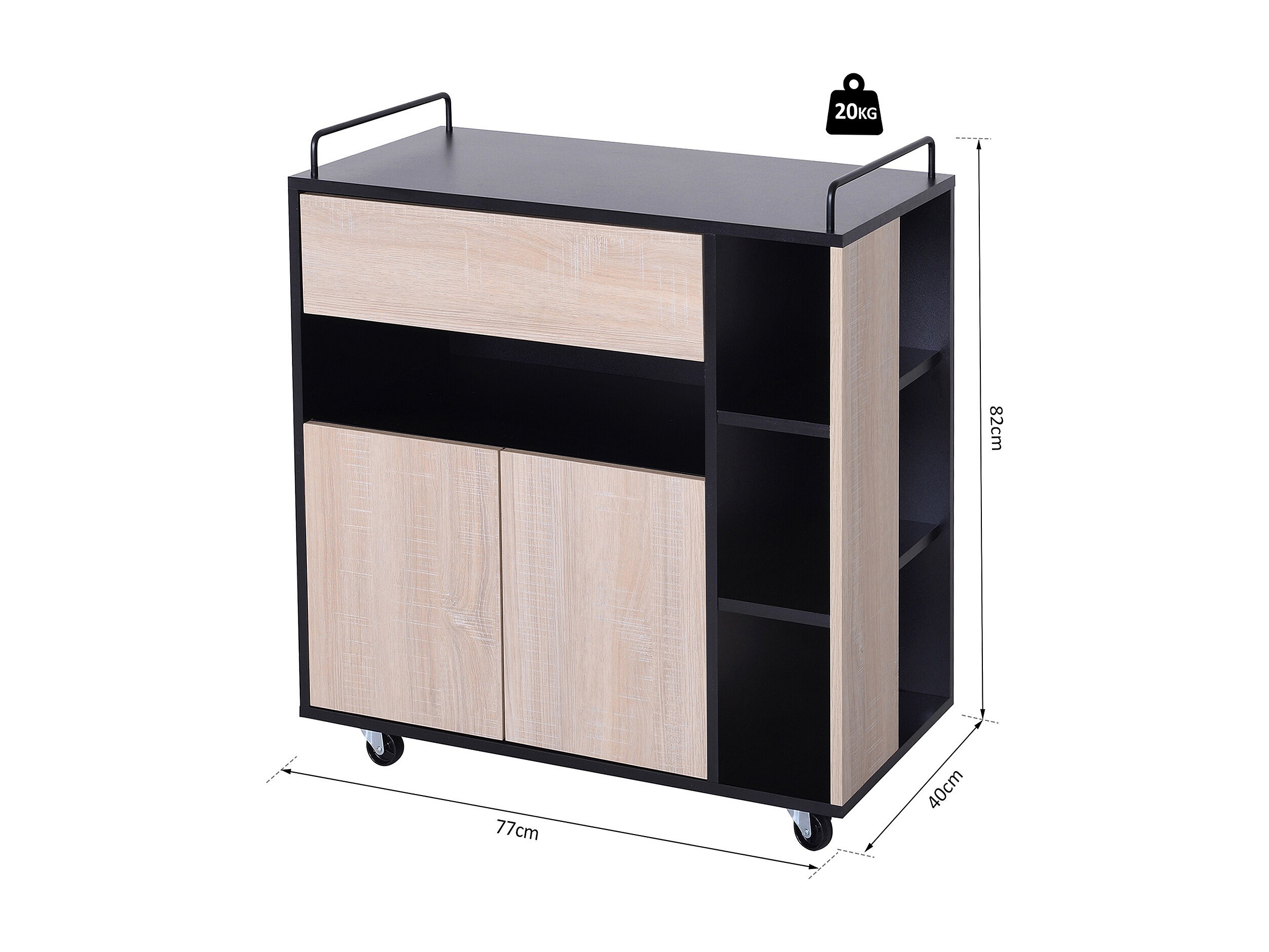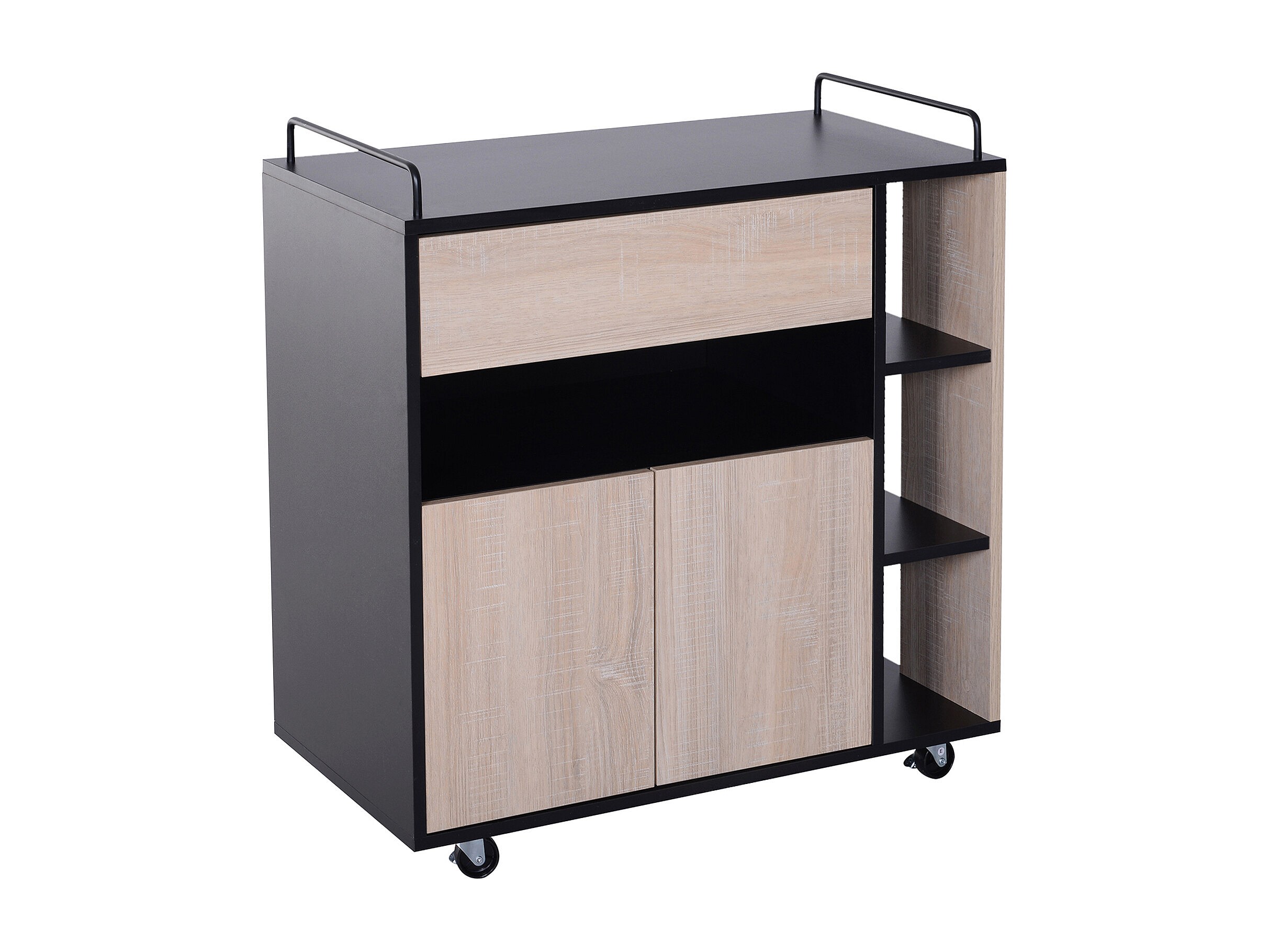 Chariot de service desserte de cuisine à roulettes multi-rangements placard double portes + 3 étagères + niche + tiroir panneaux particules noir chêne