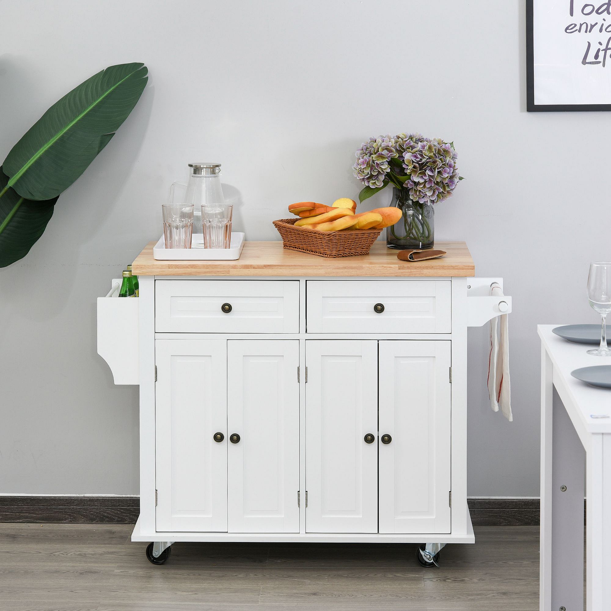 Desserte de cuisine multi rangements 2 tiroirs 2 placard 2 portes avec étagère range-bouteille porte-torchons MDF blanc hévéa