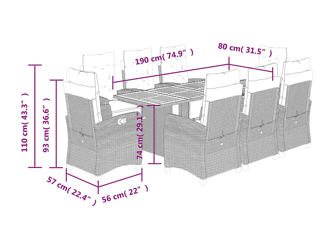 Igmar Ensemble à manger de jardin 9pcs coussins noir résine tressée