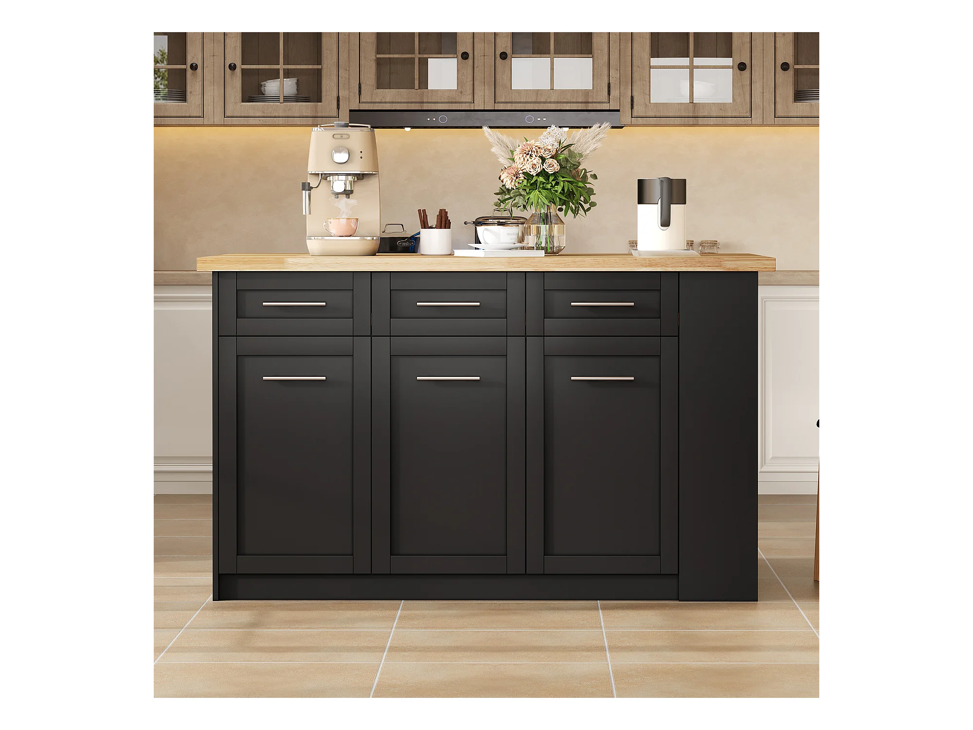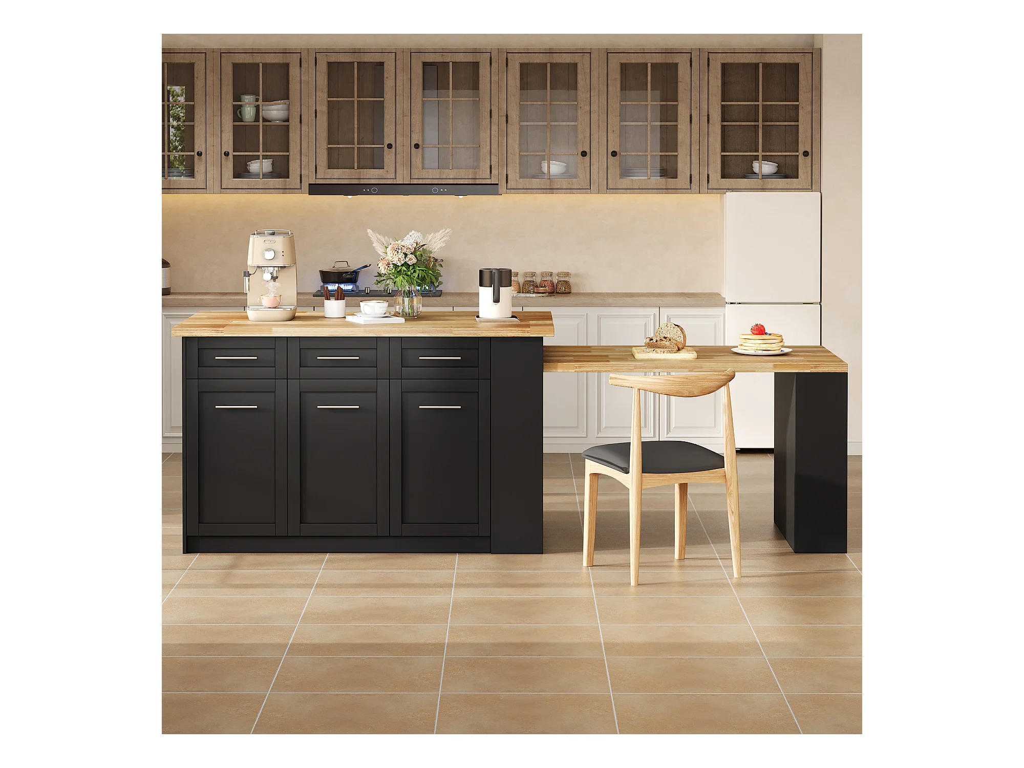 Ilot central de cuisine 150x90x90cm - avec table à manger rétractable - texture du bois - avec un grand espace de rangement - Noir + Naturel