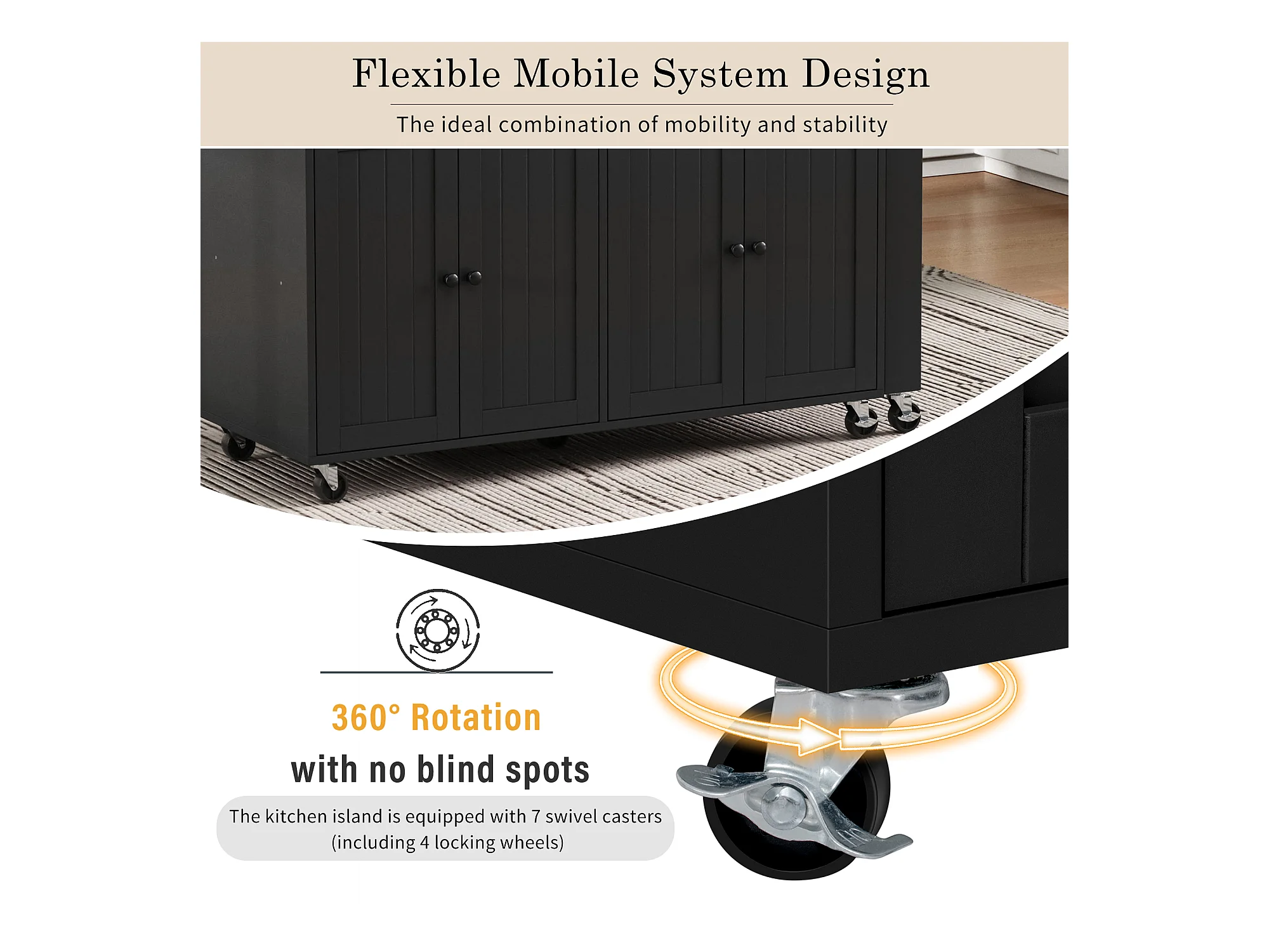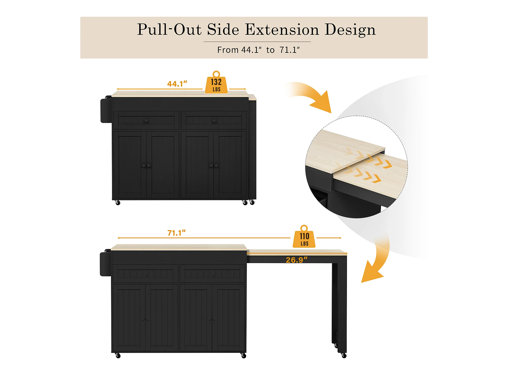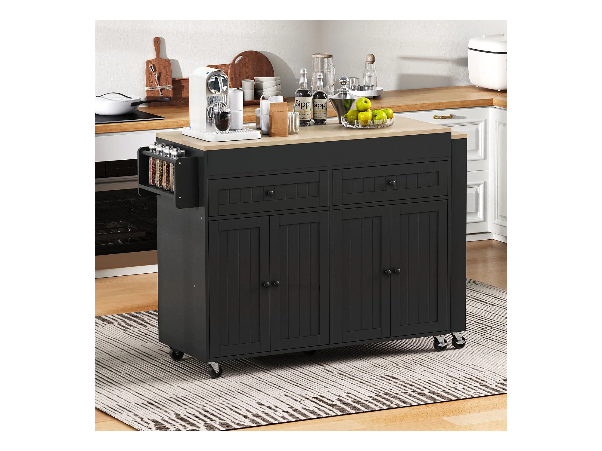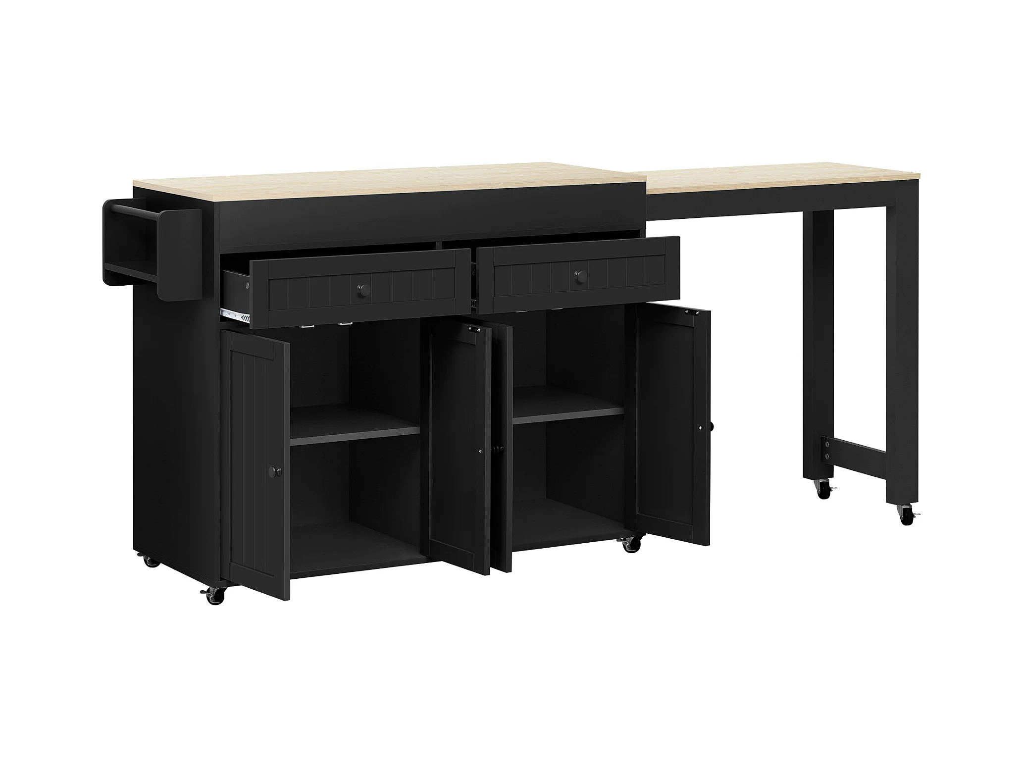Ilot central de cuisine - avec 4 portes et 2 tiroirs - plateau extensible - avec roulettes - 180.5x45x92.2 cm - Noir