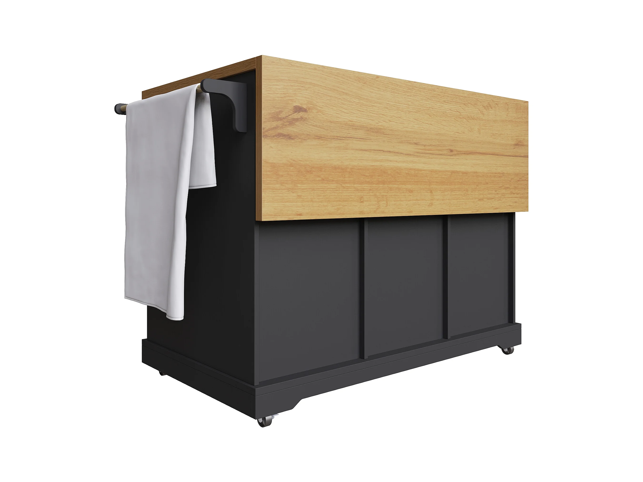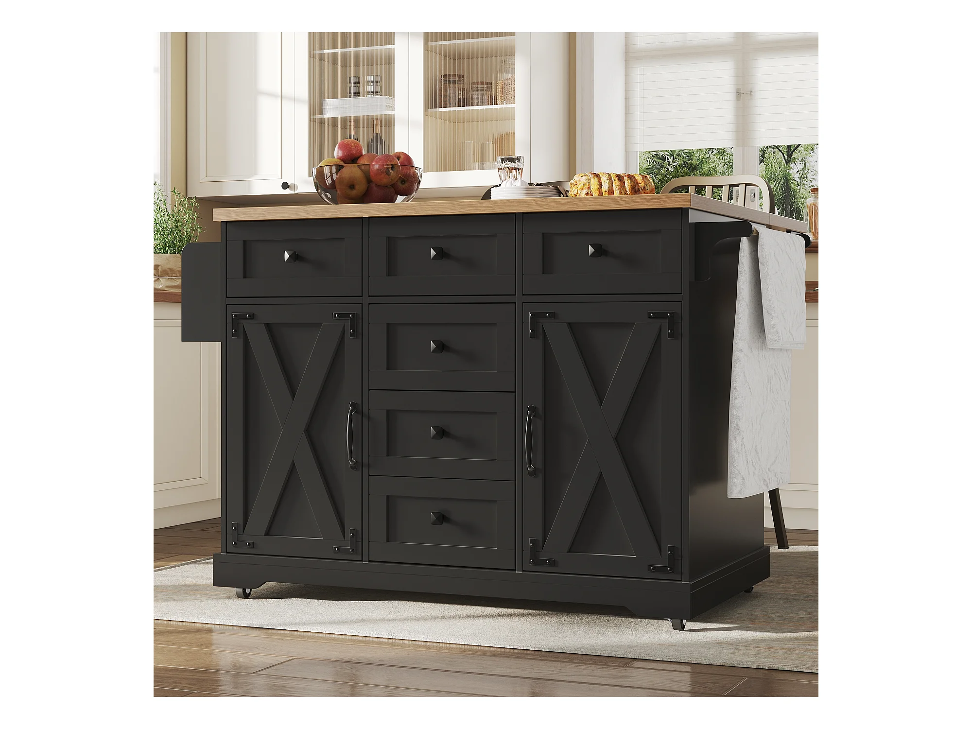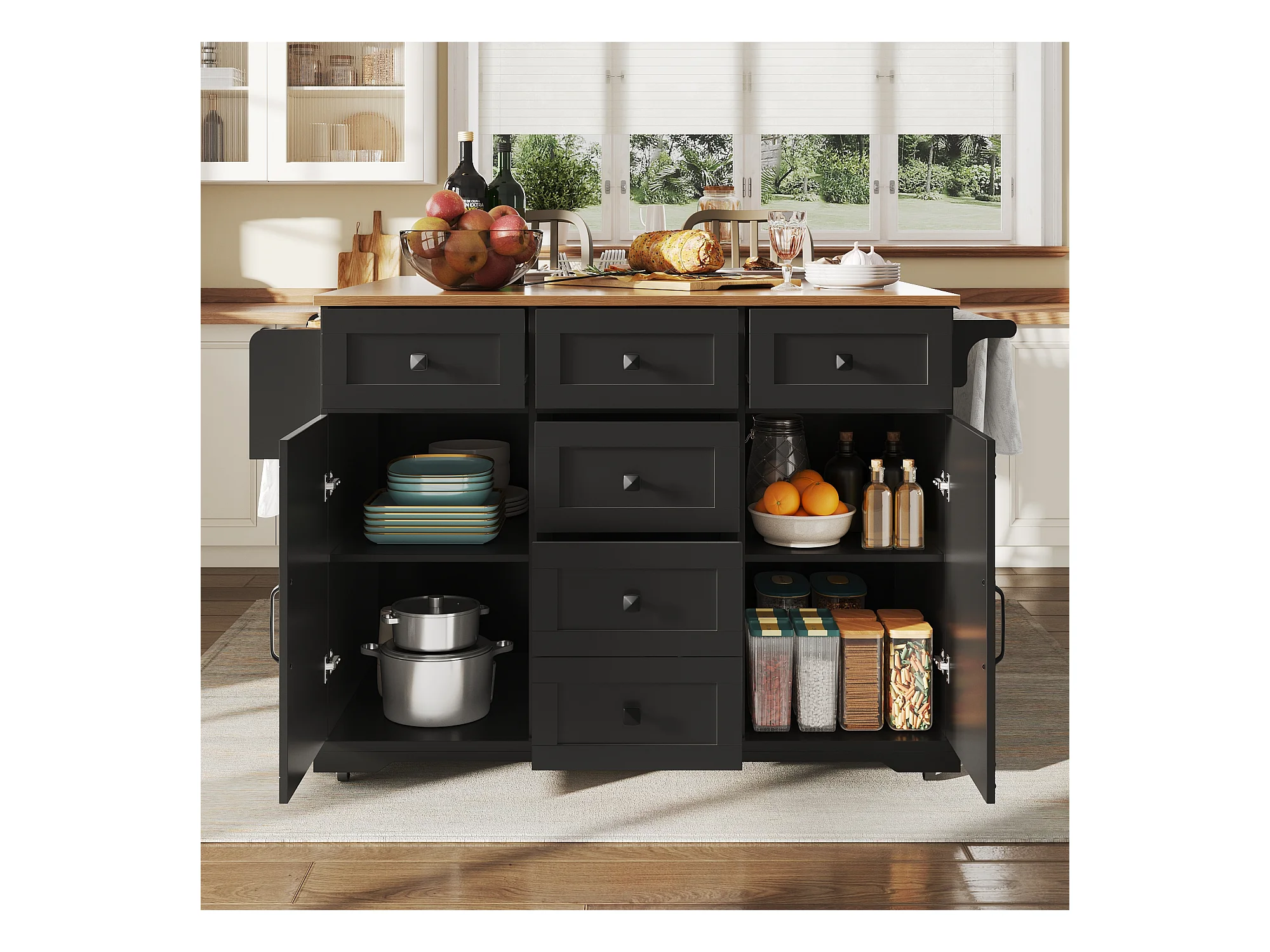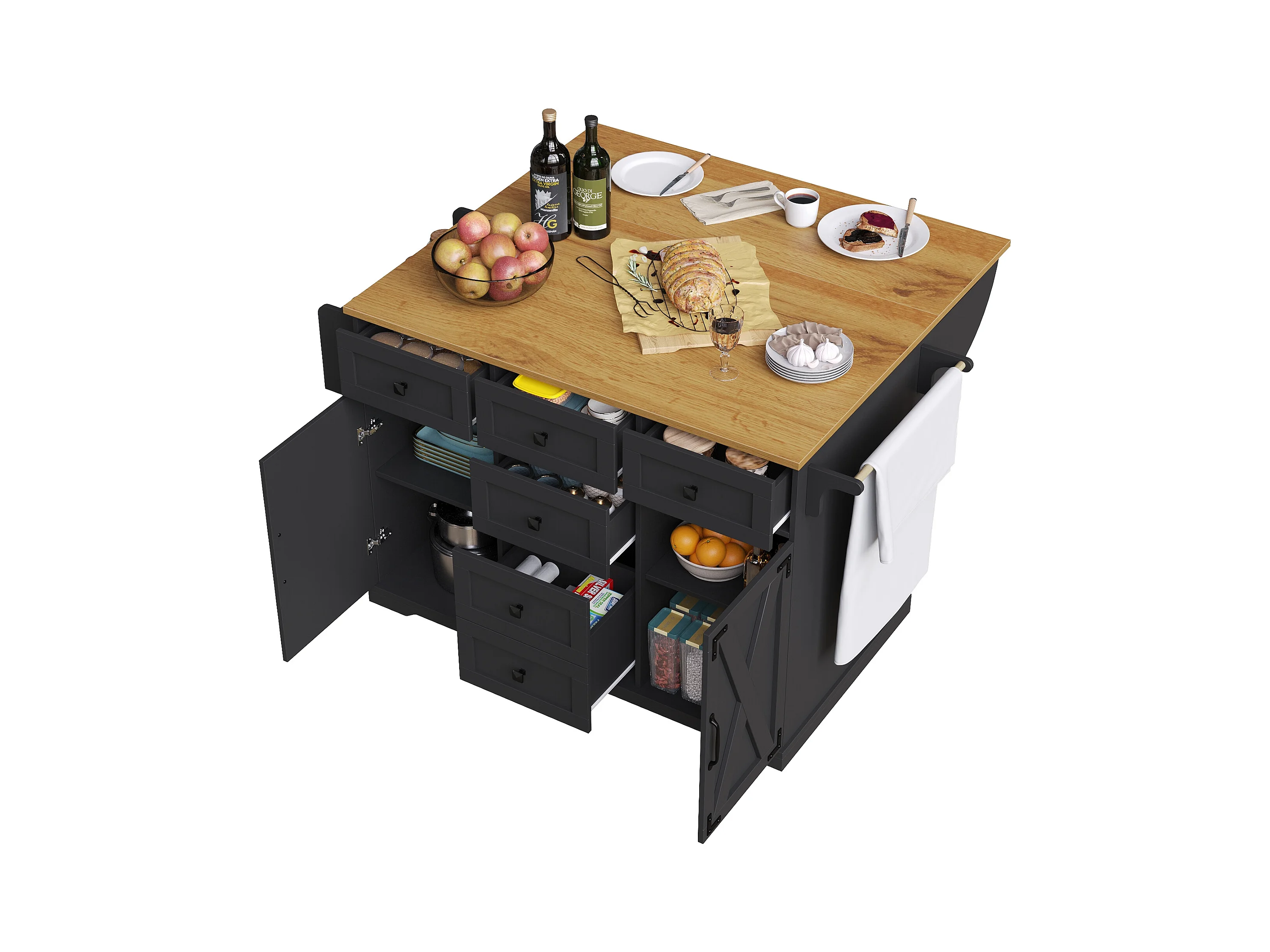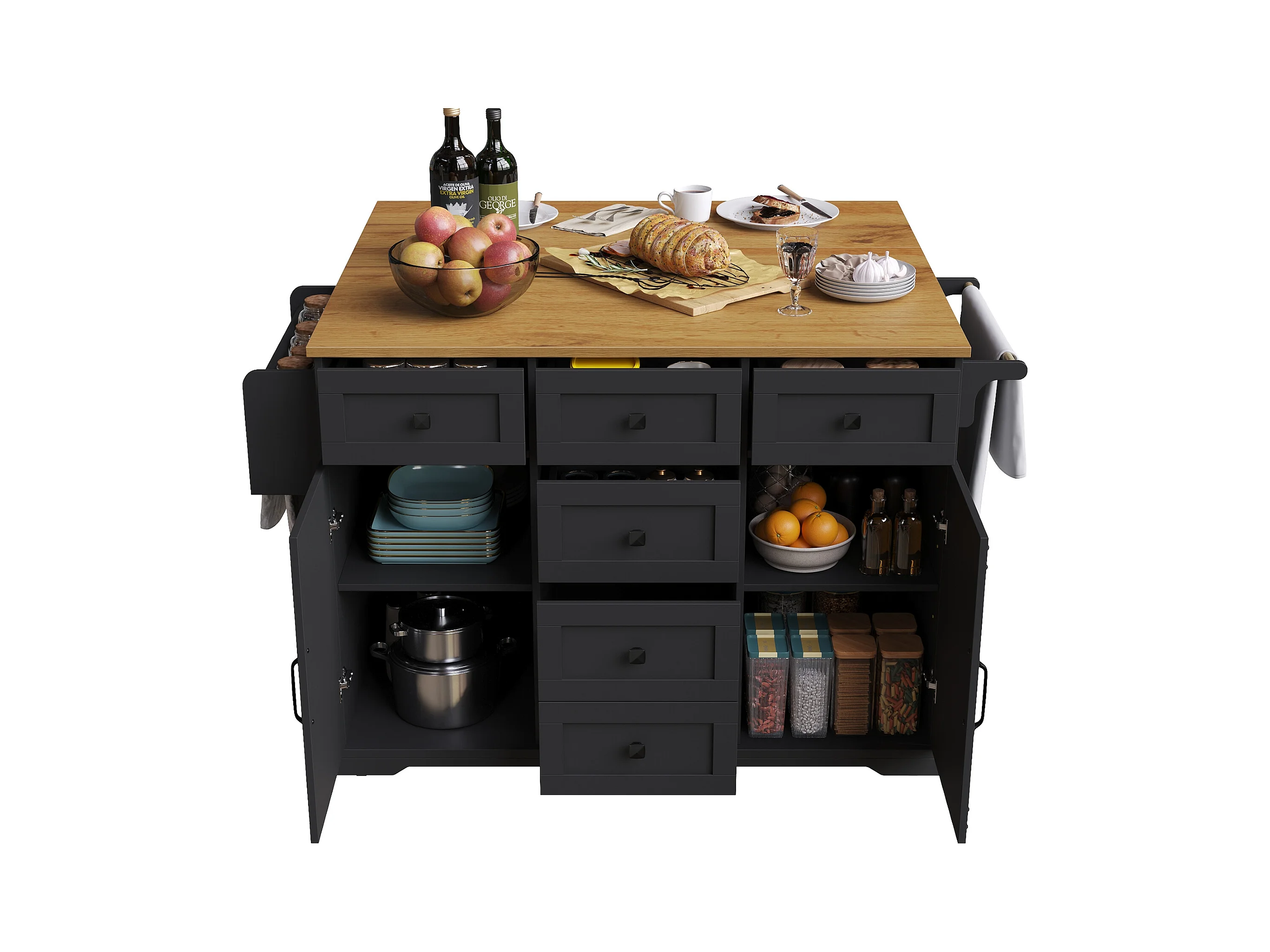 Ilot central de cuisine mobile - Plateau extensible - 2 portes et 5 tiroirs - étagères ouvertes - avec porte-serviettes - MDF - Noir