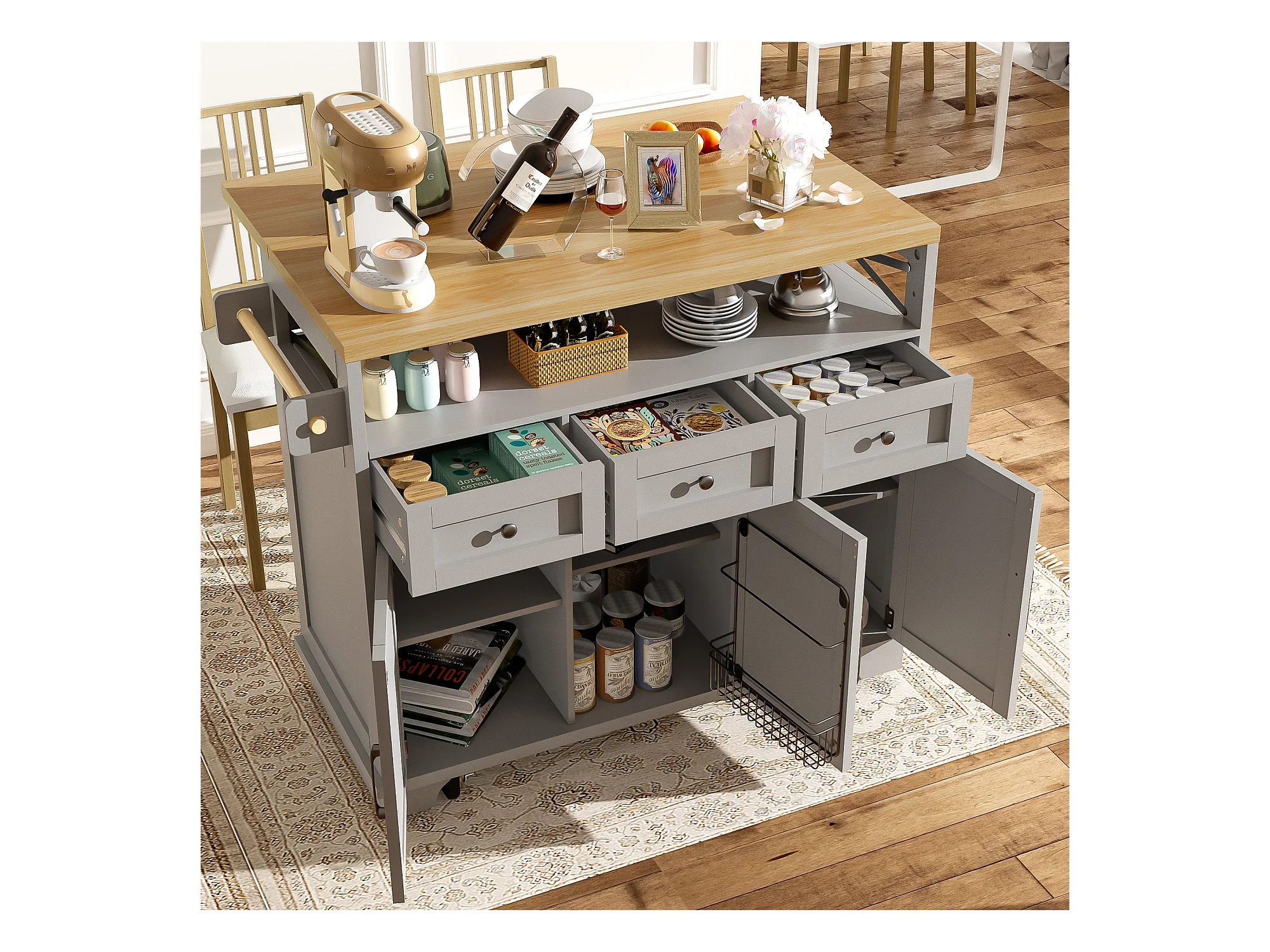 Ilot central de cuisine mobile - Plateau extensible - 3 tiroirs et 3 portes - étagères ouvertes - avec porte-serviettes - MDF - Gris