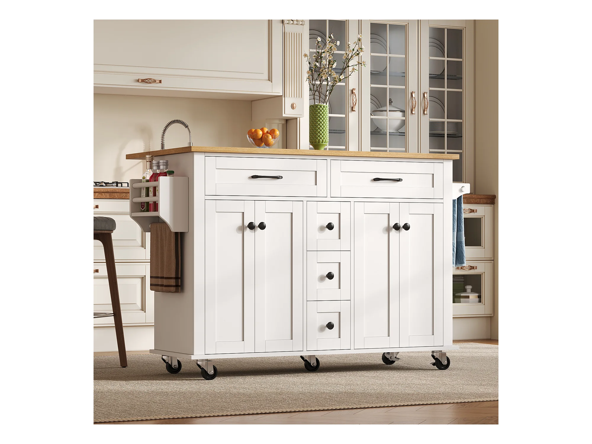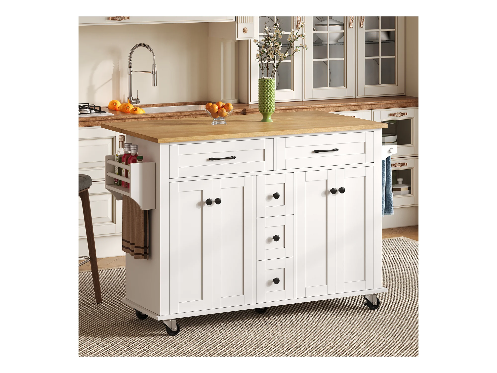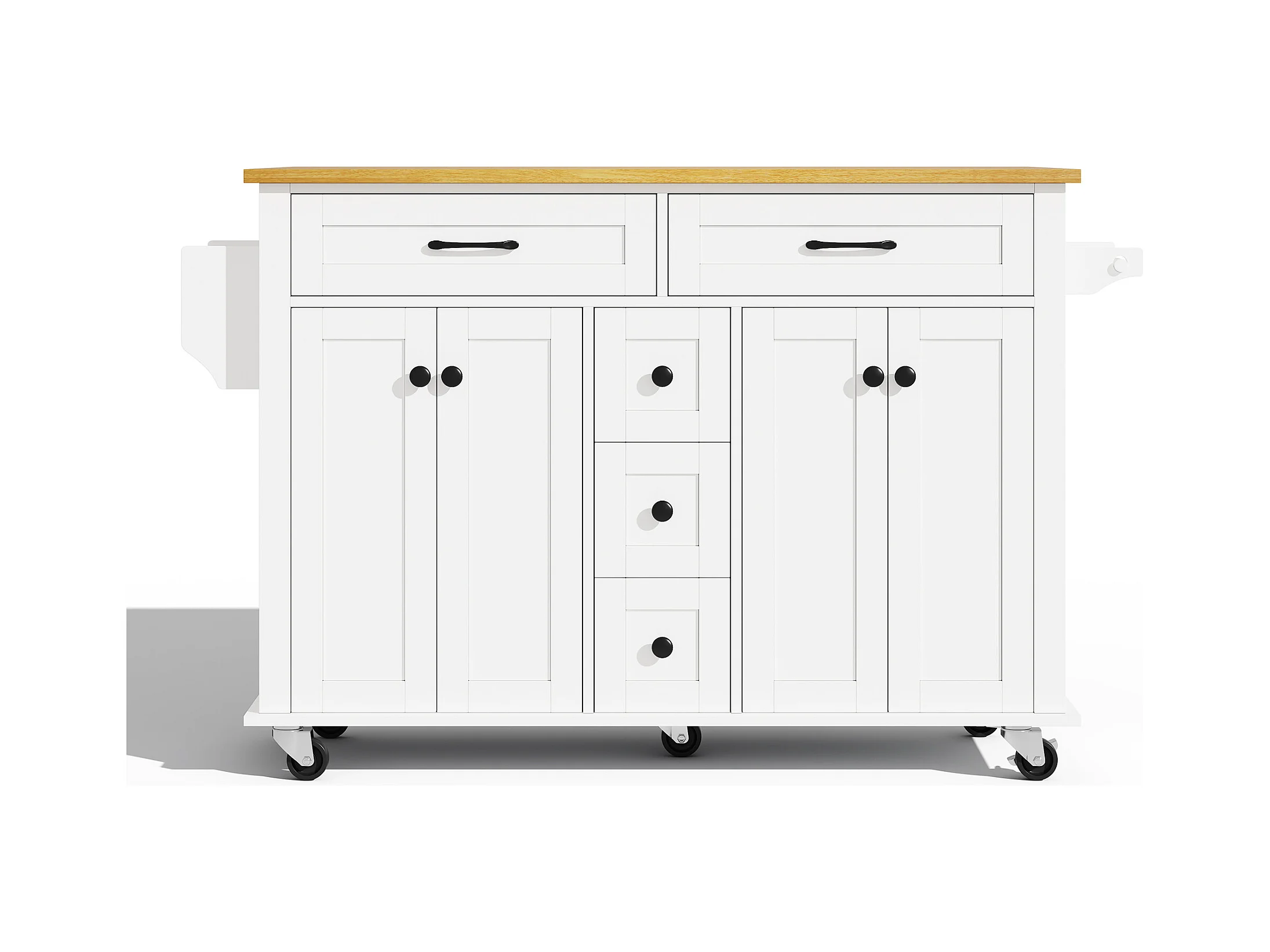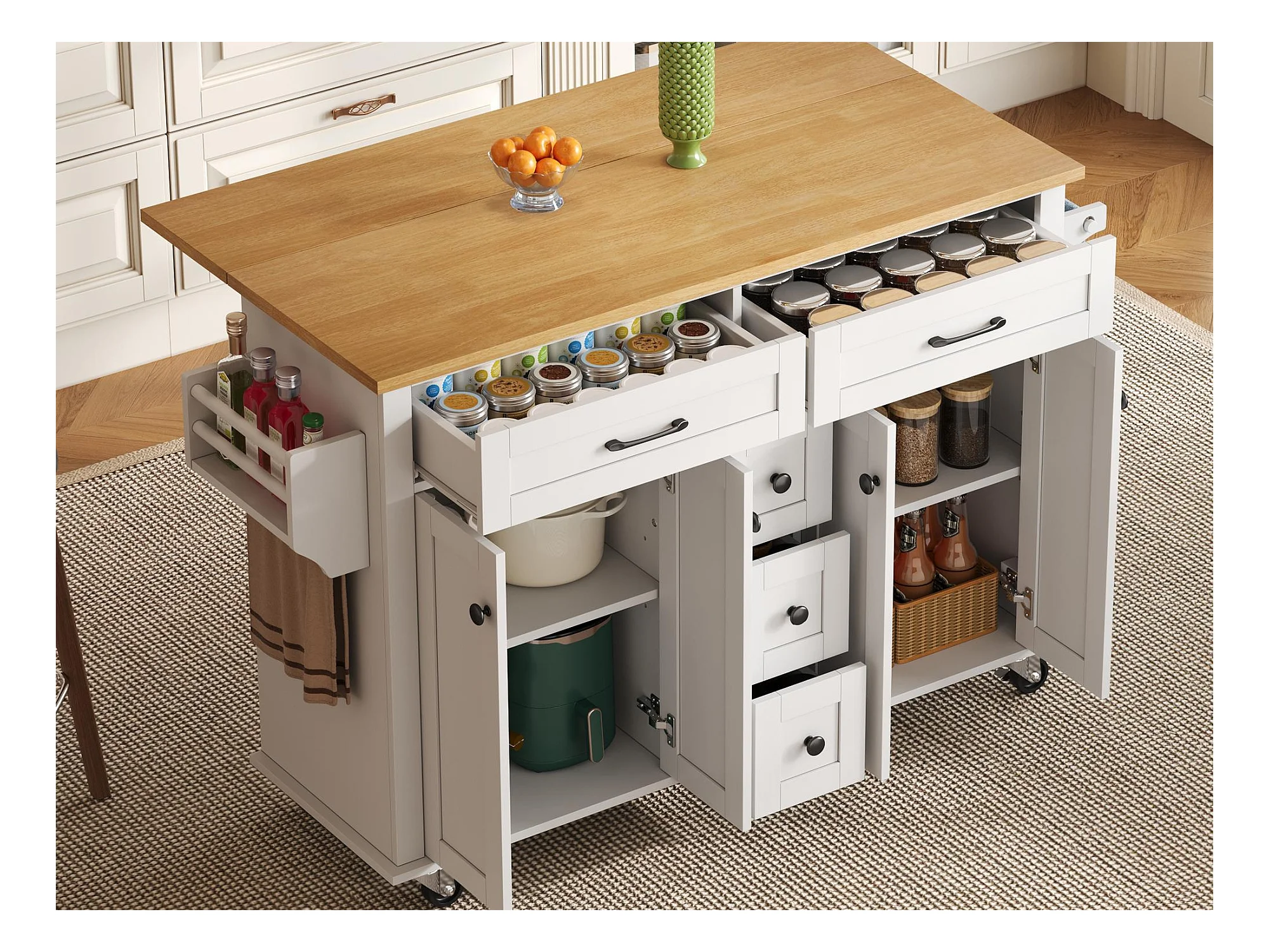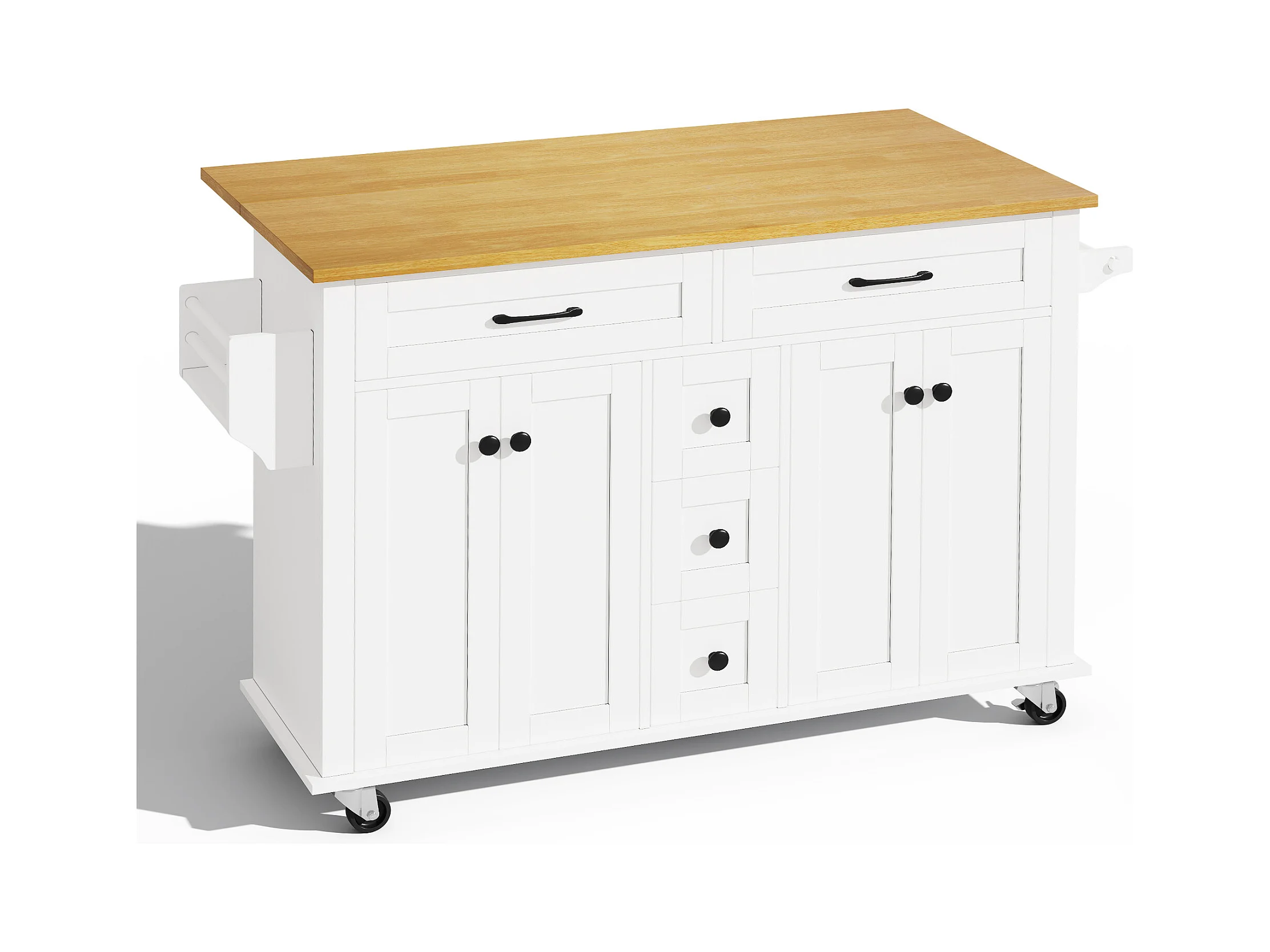 Ilot central de cuisine mobile - plateau extensible - 5 tiroirs et 4 portes - avec porte-serviettes - MDF - Blanc