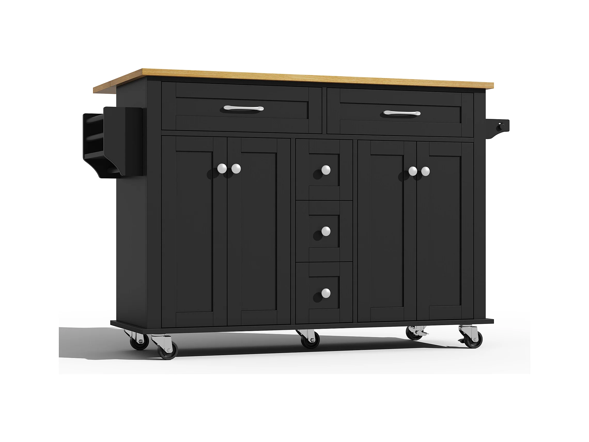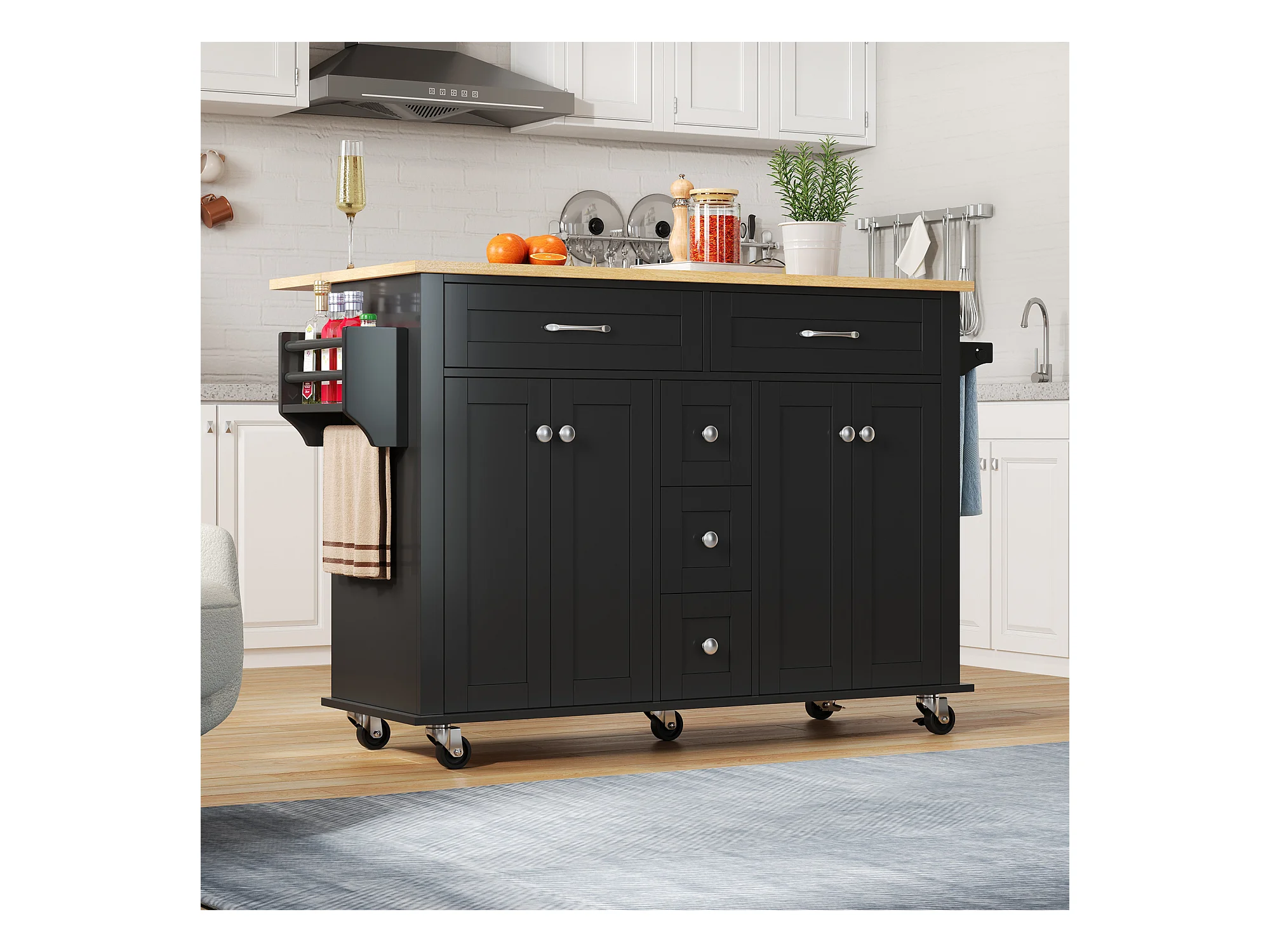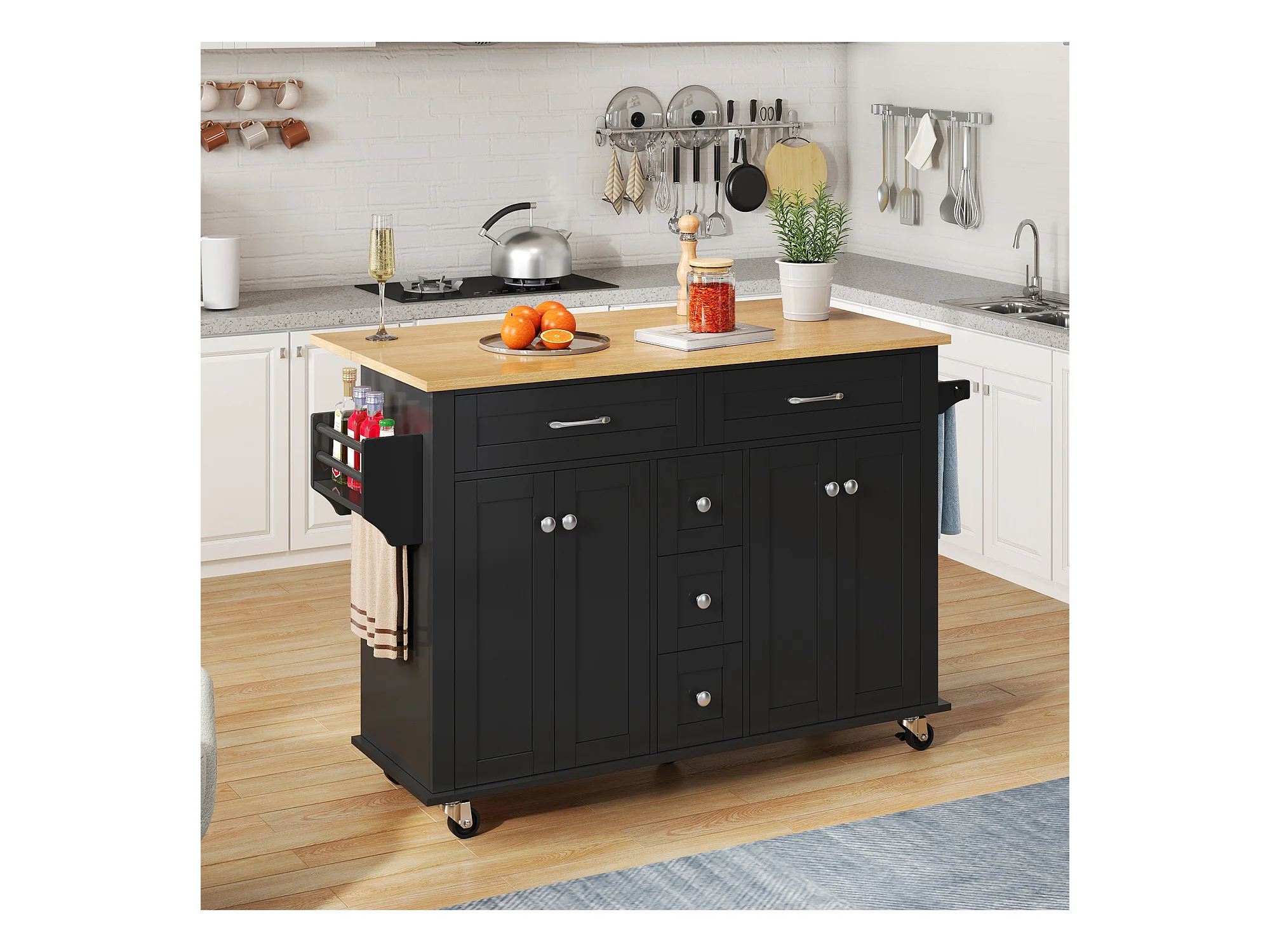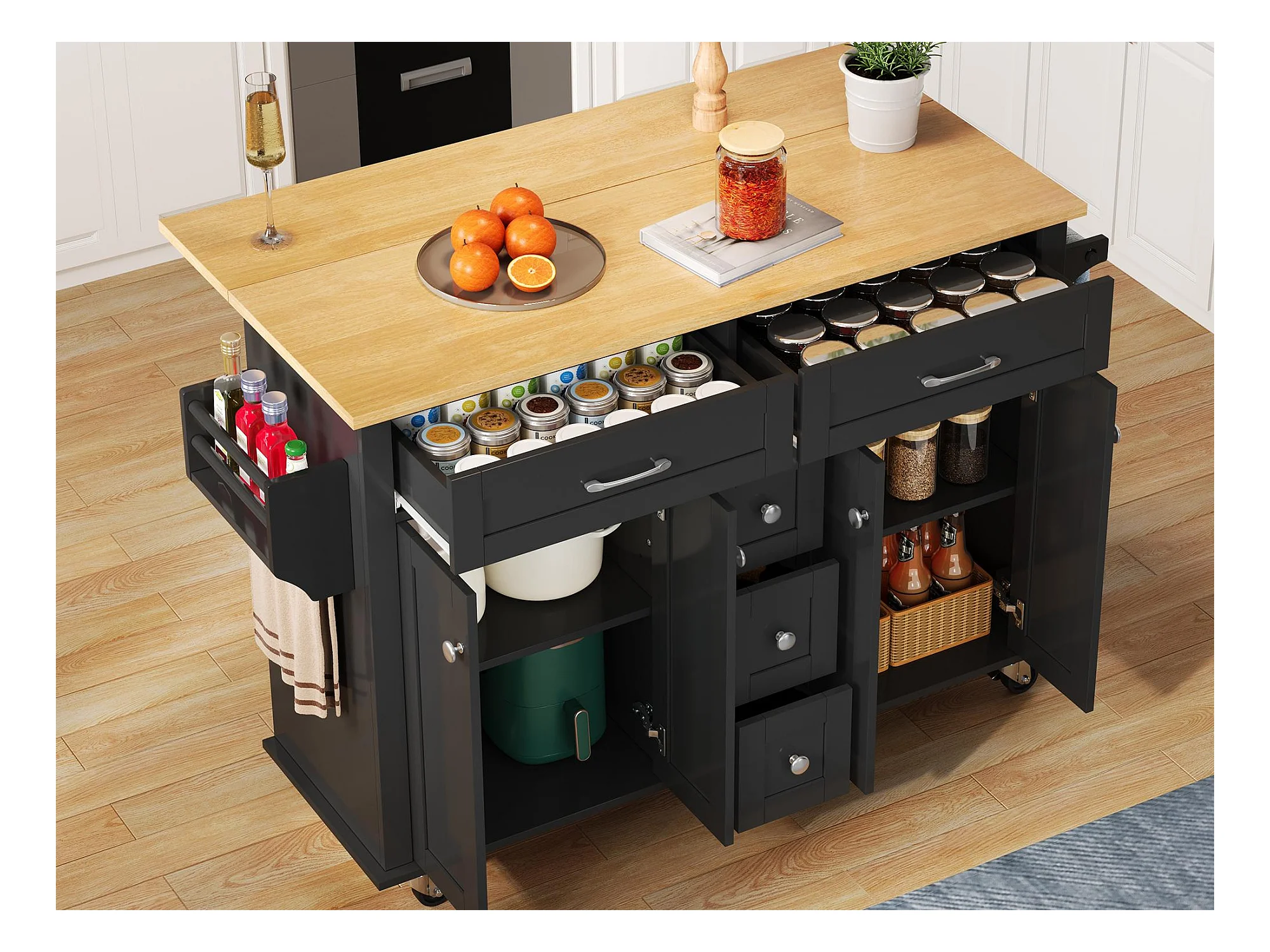 Ilot central de cuisine mobile - plateau extensible - 5 tiroirs et 4 portes - avec porte-serviettes - MDF - Noir